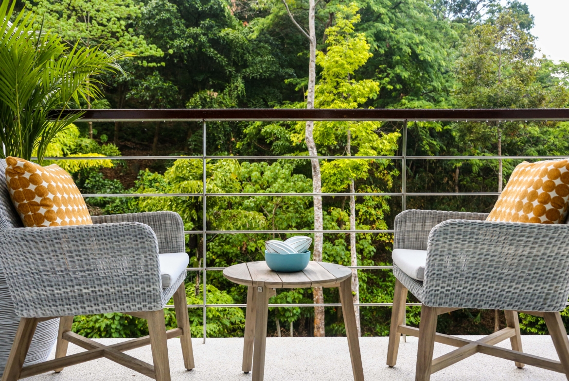 The private balcony overlooks the swimming pool and lush tropical greenery, providing a peaceful retreat that captures the essence of Phuket living.