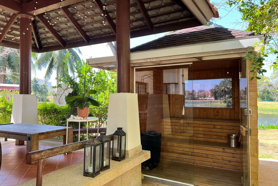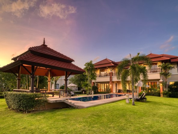 A charming Thai–Balinese sala is positioned beside the pool, providing a comfortable shaded area to relax and unwind in a private setting.