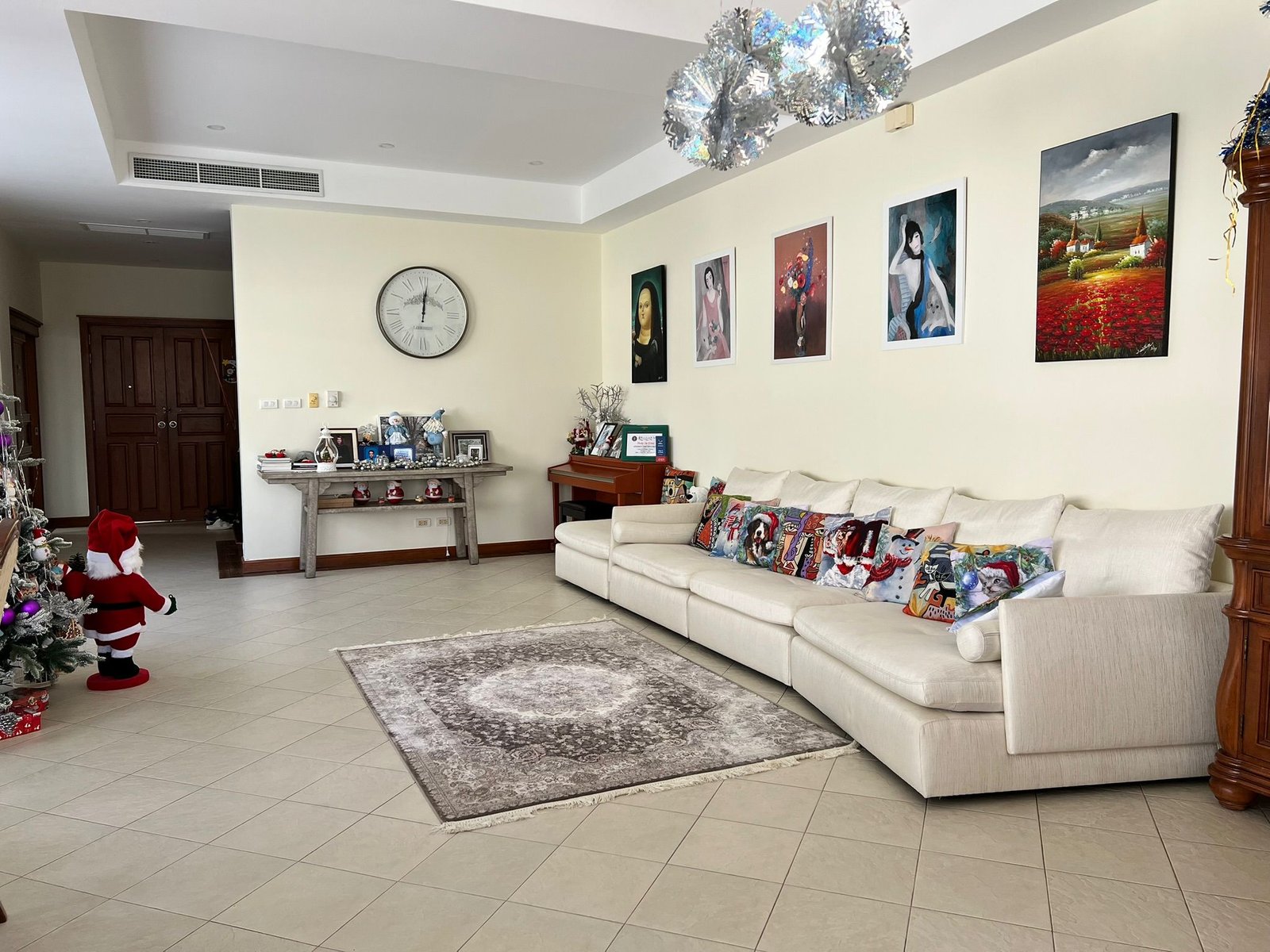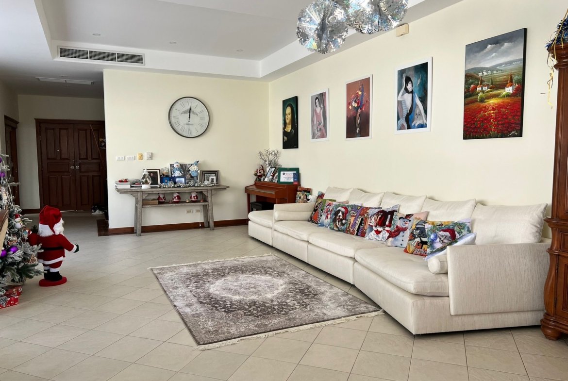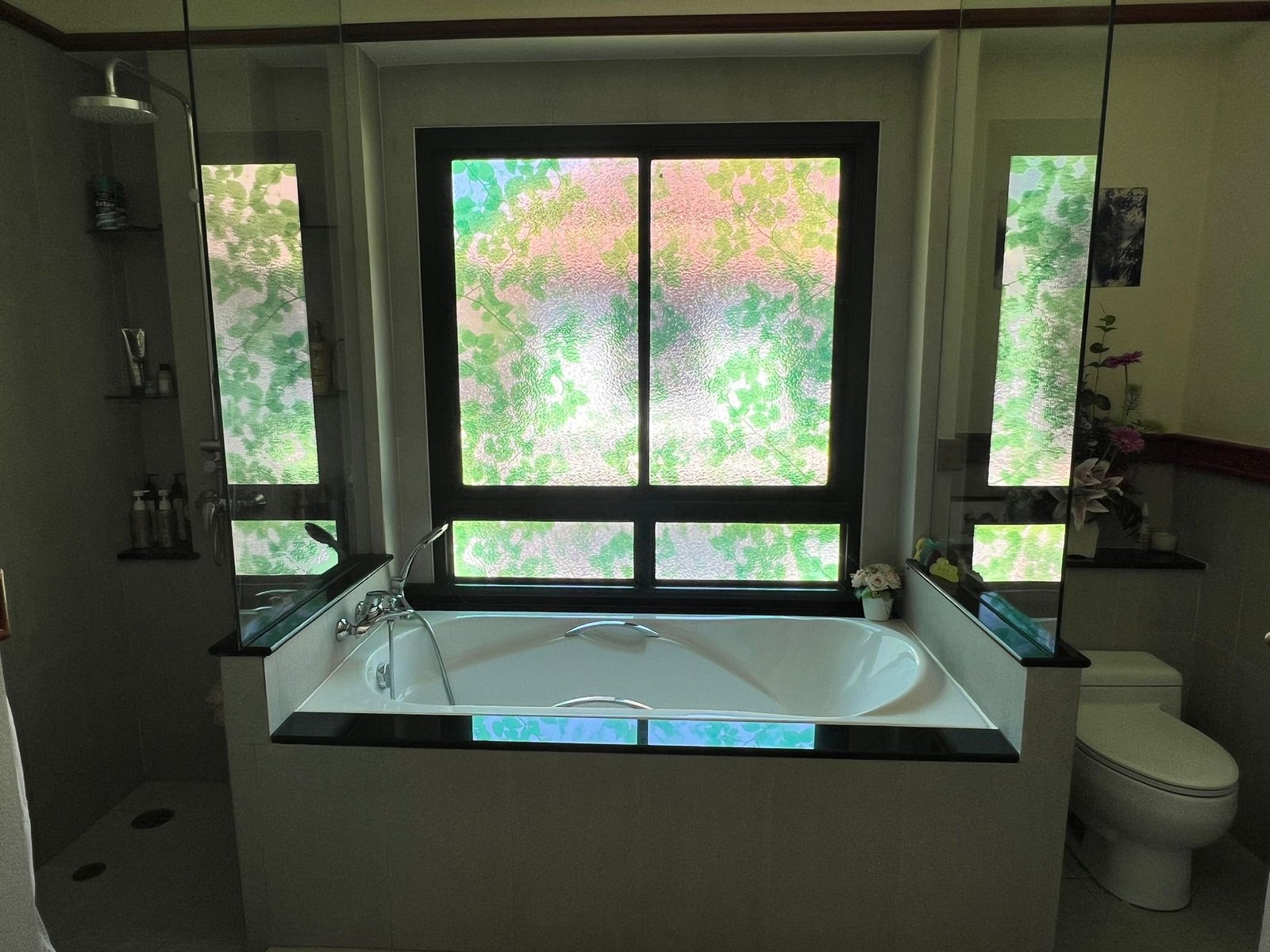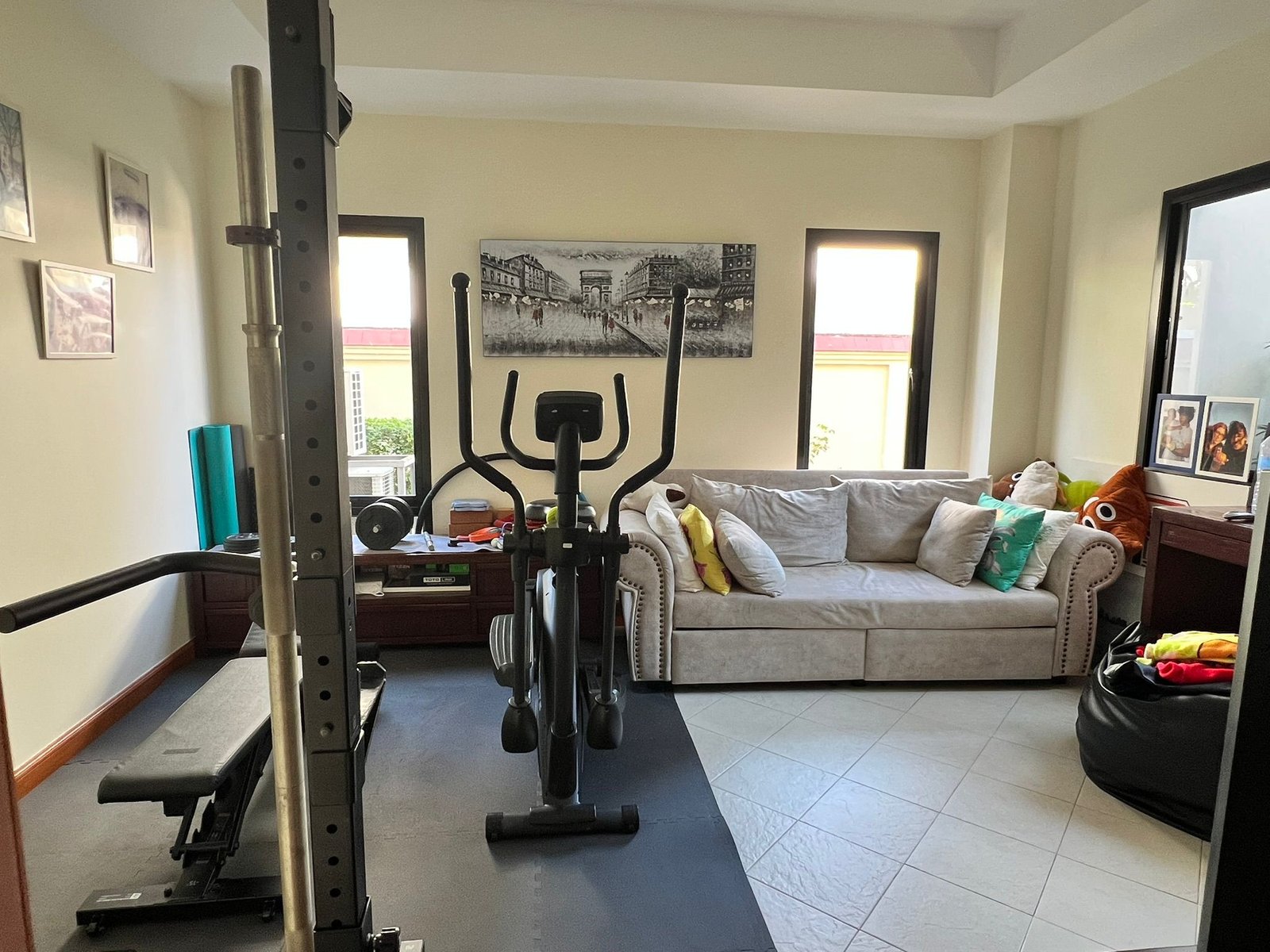 The upper floor accommodates three well-proportioned bedrooms, including a generous master suite with a walk-in closet, private balcony, and an ensuite bathroom featuring a separate bathtub and shower. Two additional guest bedrooms share a well-appointed bathroom, offering a functional layout suitable for families or visiting guests.