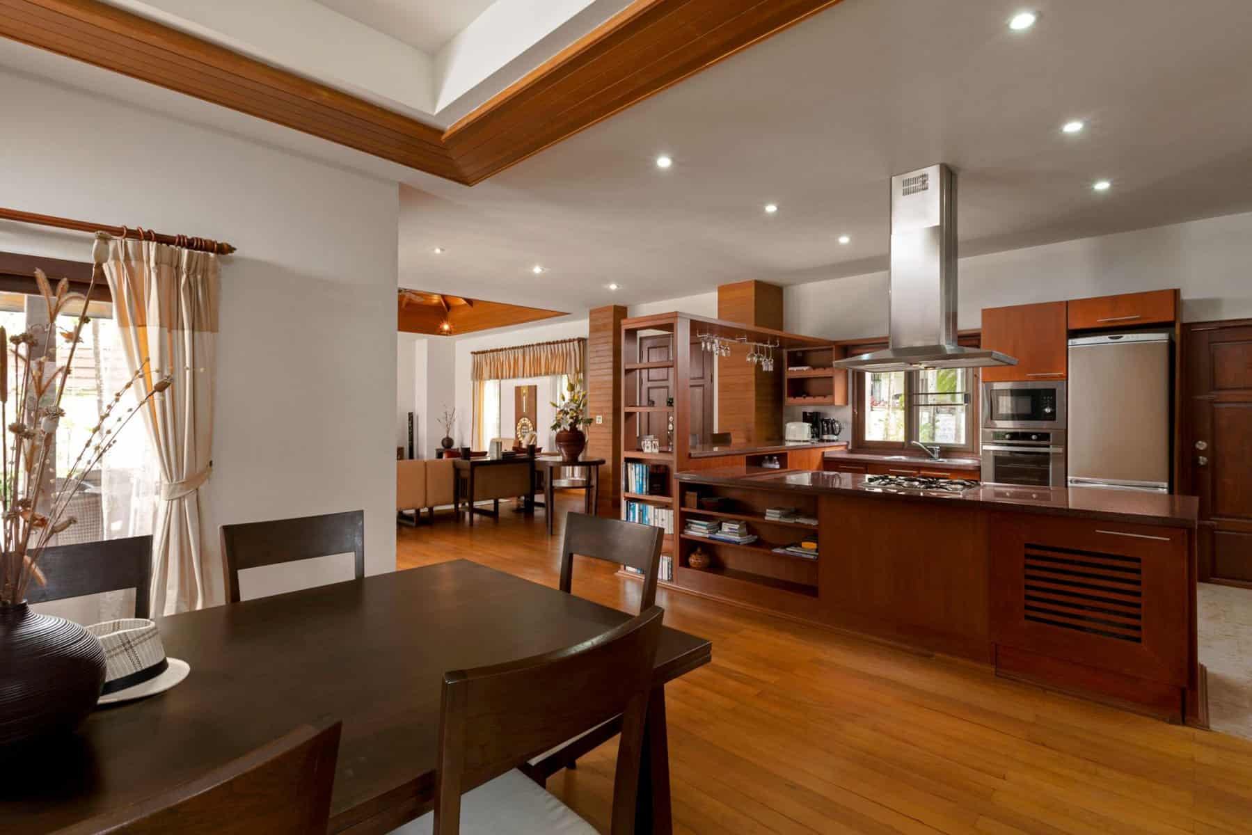 A beautiful fully renovated four bedroom villa for sale in a very peaceful residential area and secure estate. This U-shaped villa is built surrounding the extra large 5m x 9m swimming pool. It has an open plan living area with a kitchen, dining room and big living room. There is very nice vaulted wood ceiling in the living room and this area has wood floors.