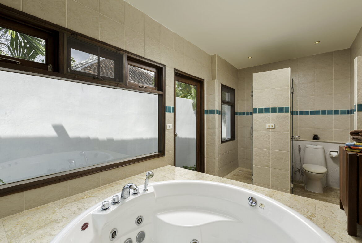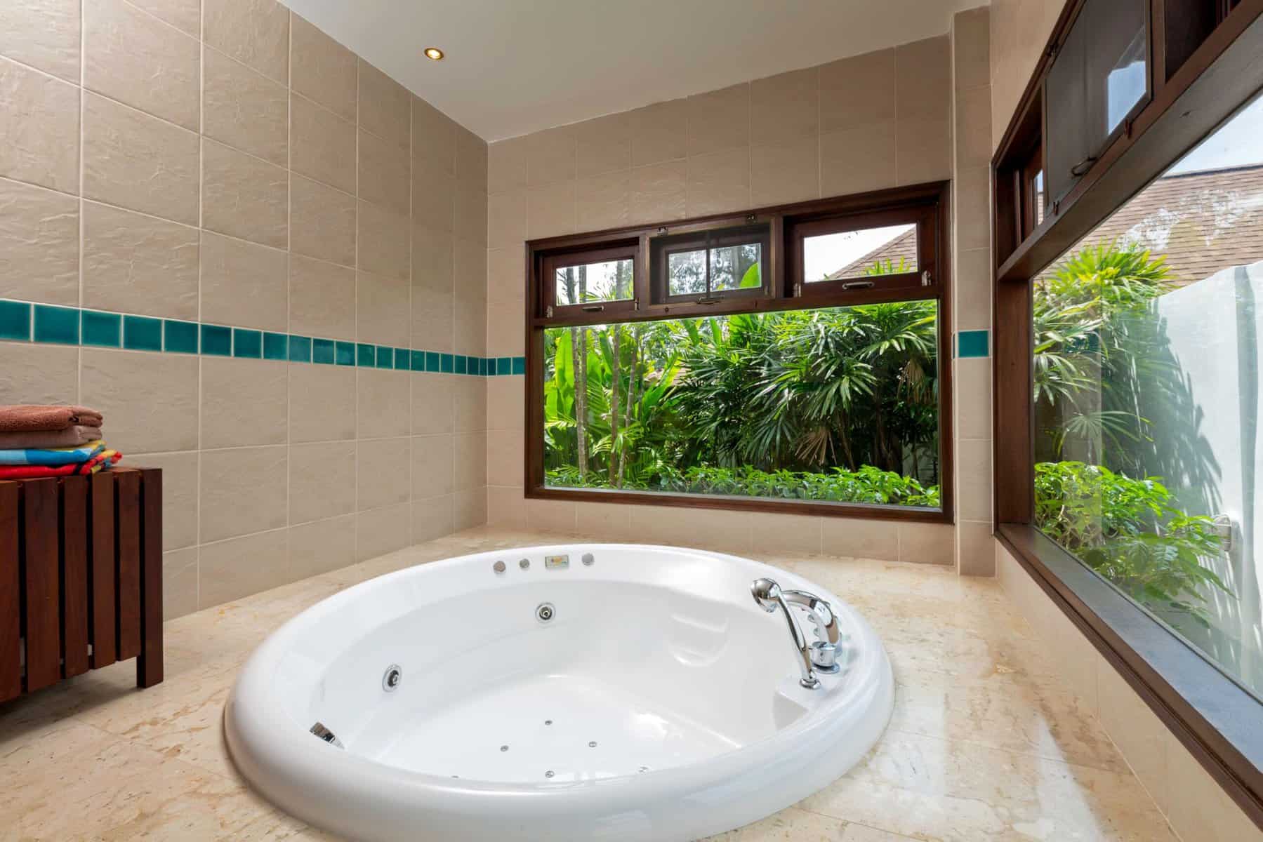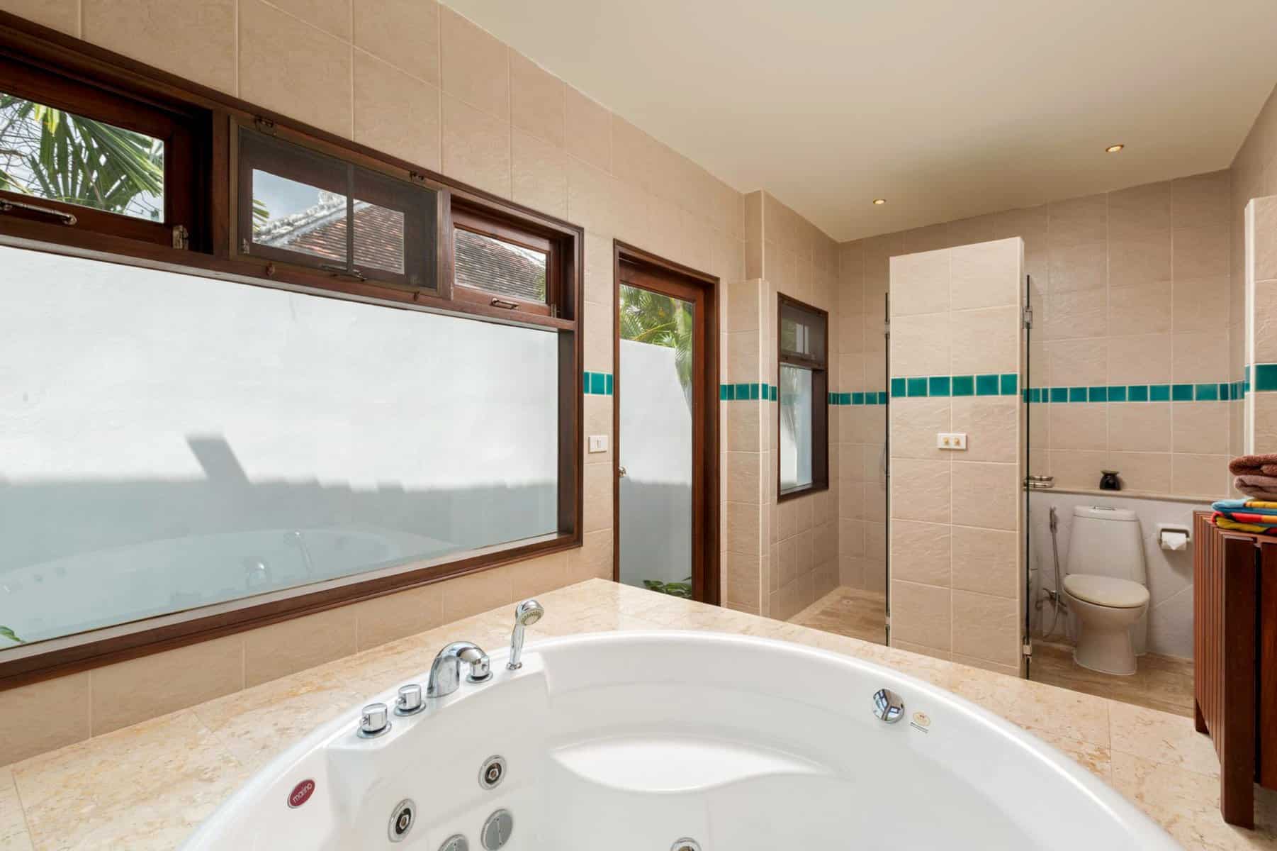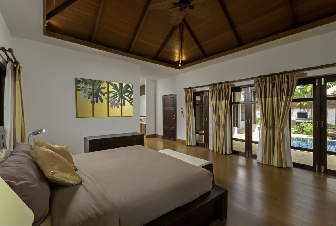 A spacious master bedroom overlooks the private pool. This room has a wood floor, vaulted wood ceiling and a large walk in wardrobe. The ensuite bathroom comes with double vanity sinks and a jacuzzi bathtub.
