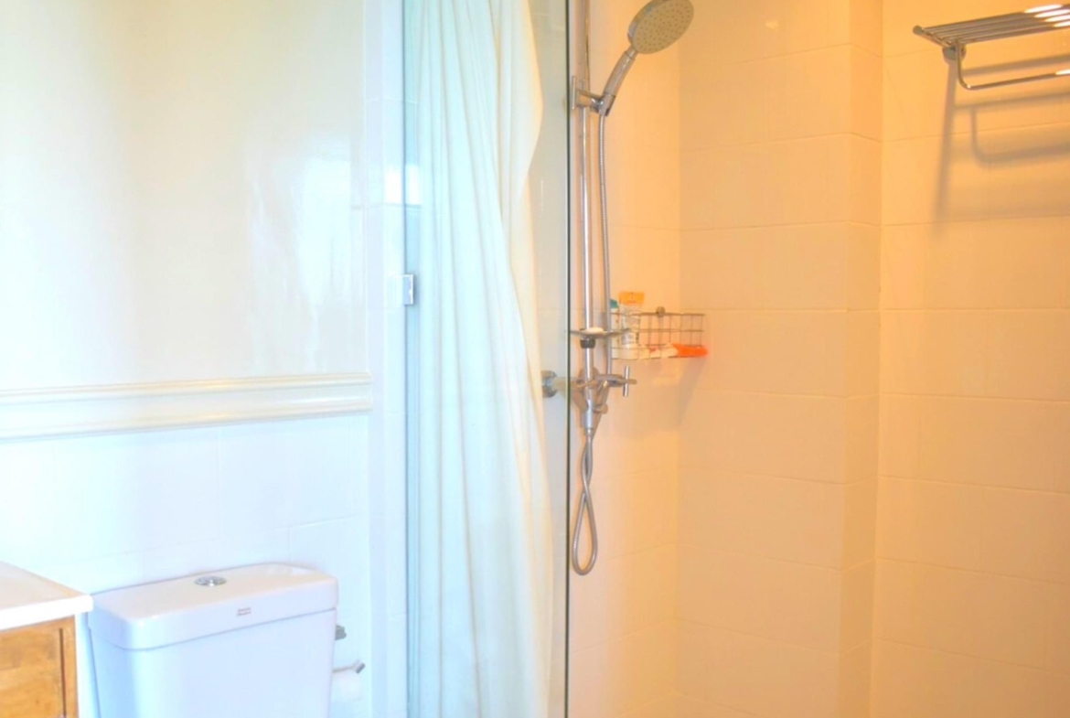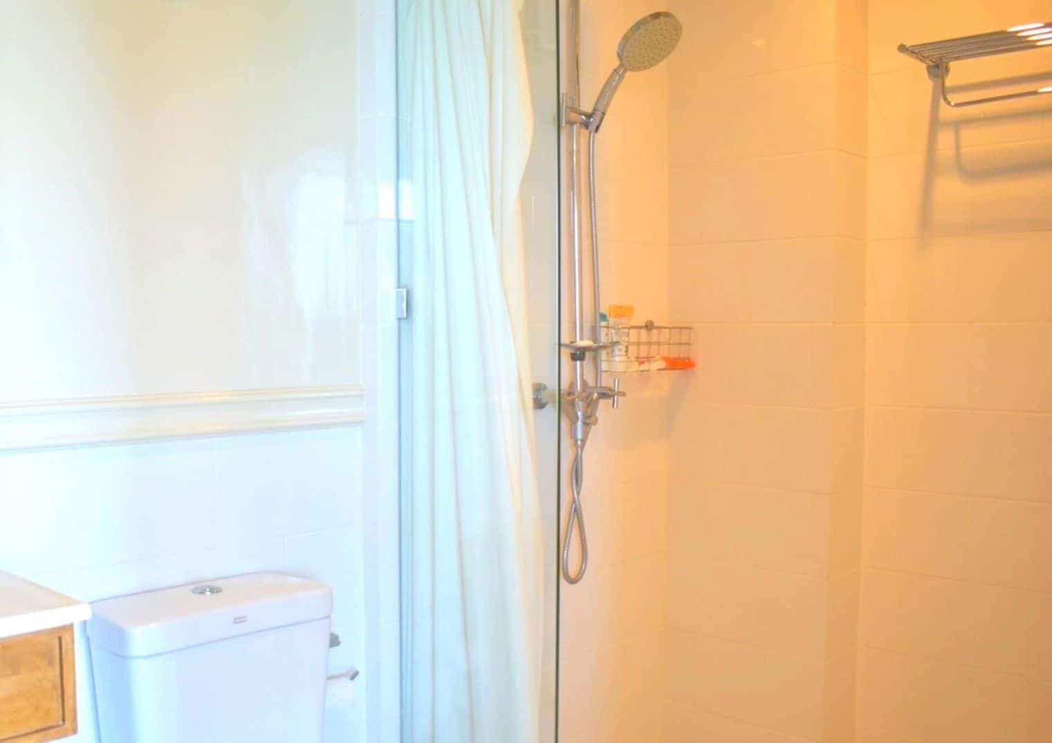 Separate shower area with tempered glass, featuring both hand-held and rain shower systems, plus a water heater