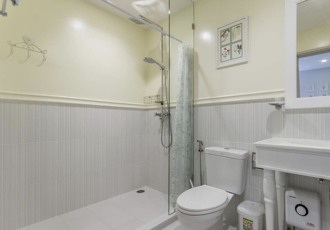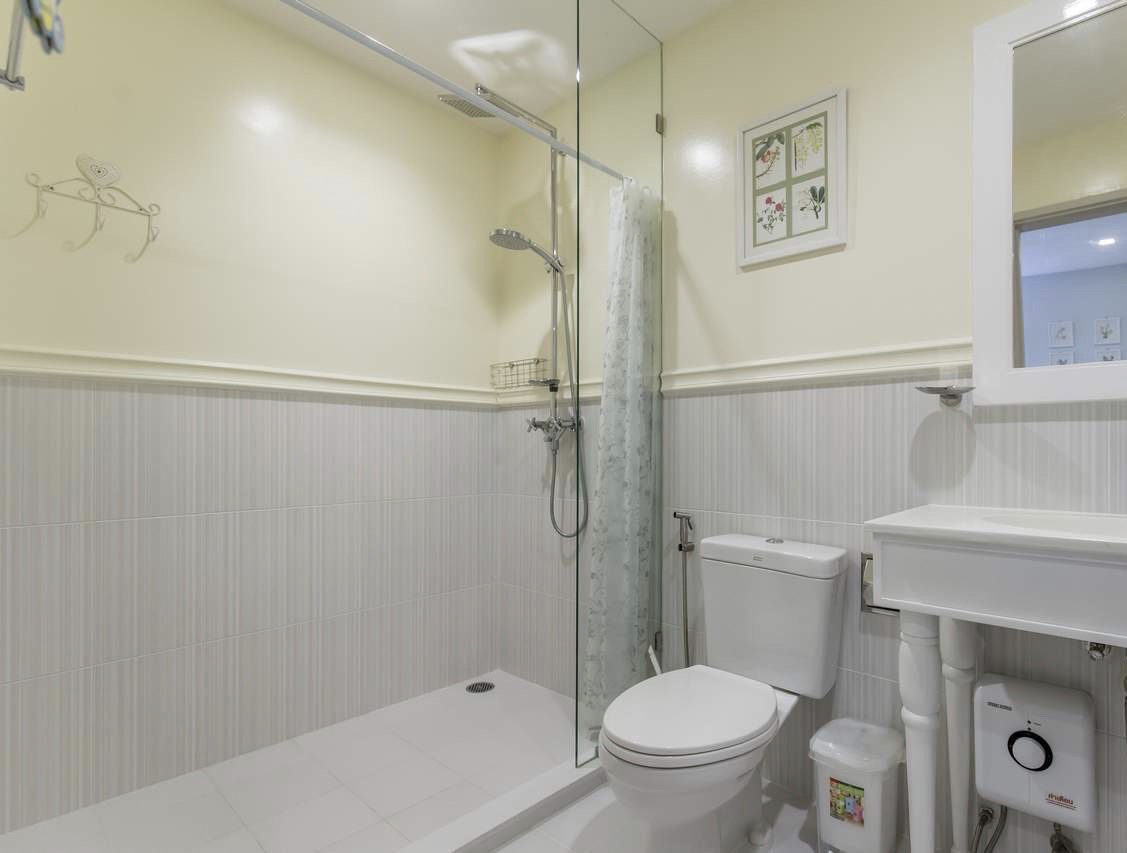 - Separate shower area with tempered glass, featuring both hand-held and rain shower systems, plus a water heater