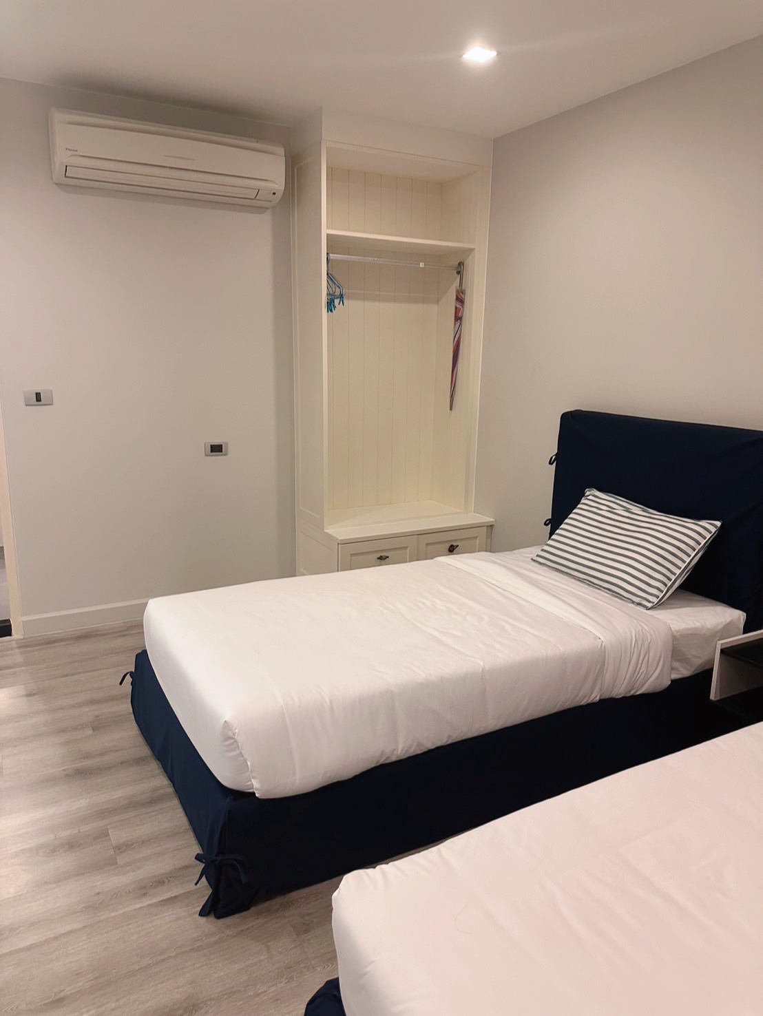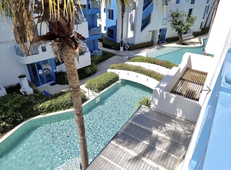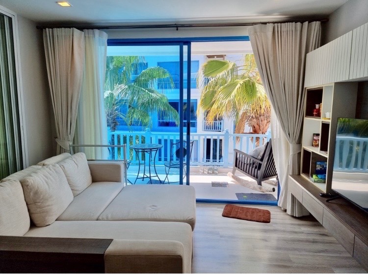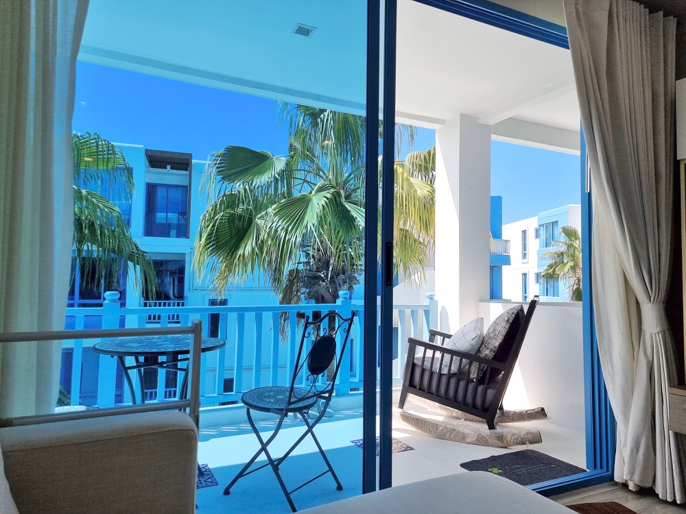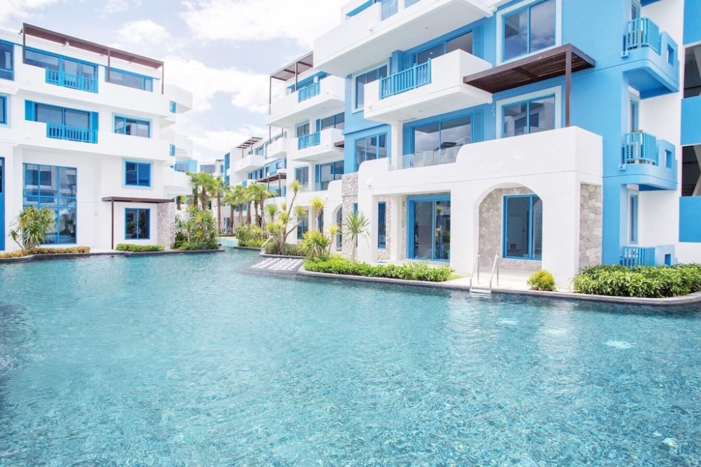 a luxury condominium and villas in Hua Hin Beachfront, with a blue and white theme, is decorated in resort-style. This Santorini-inspired project features a building with a curve design contrasting with the cubic square shape of the doors and window sills. Each building is connected by a free-form swimming pool, creating a private relaxing atmosphere with only a few units in each building. The project is fully equipped with complete facilities which are very suitable for relaxation.