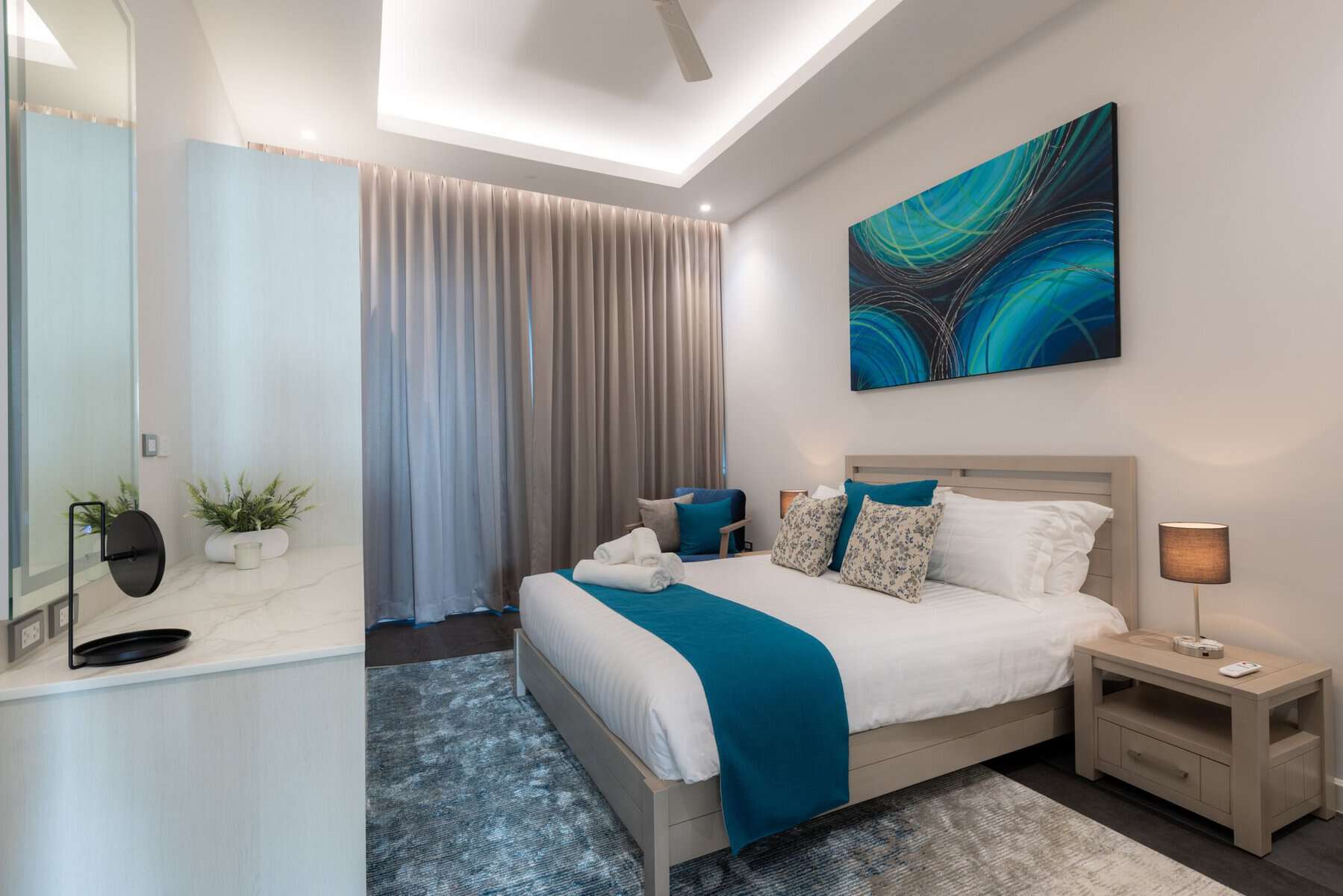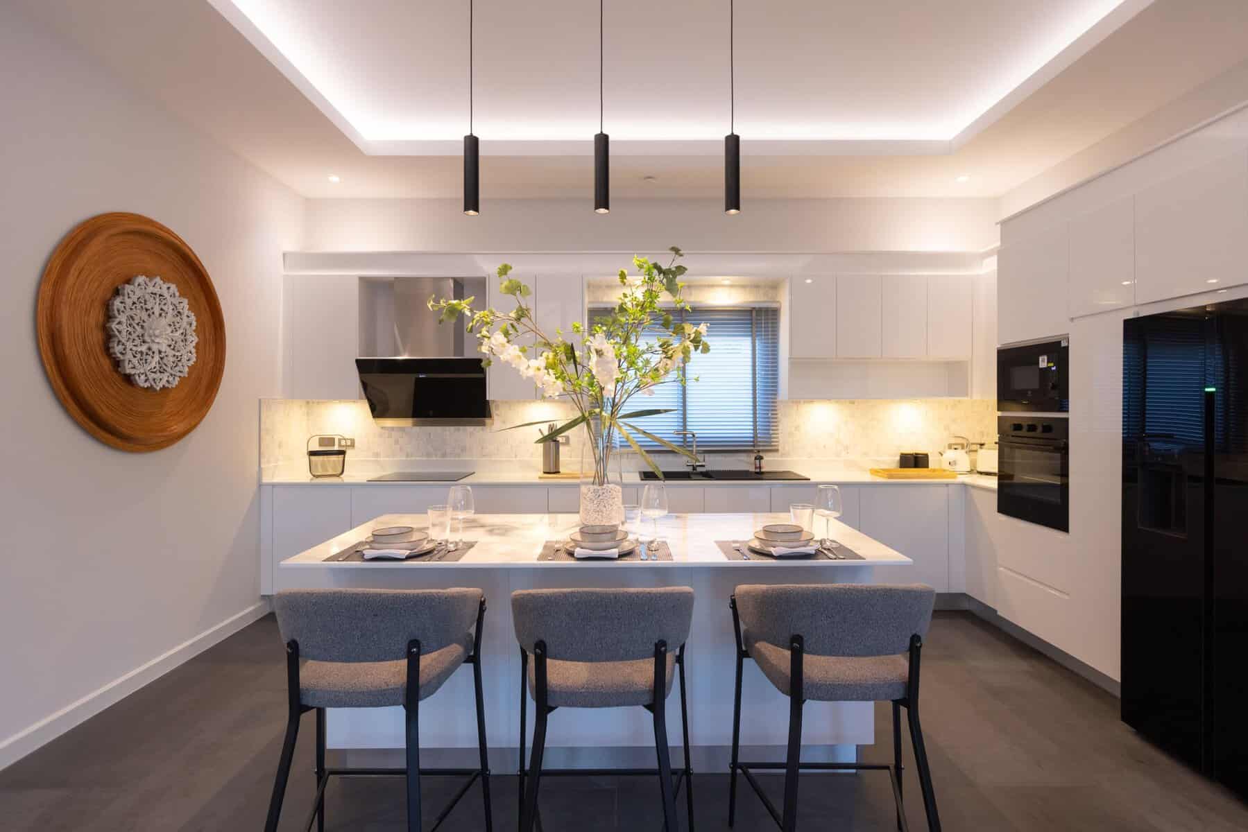 - Design Elements: Elevated ceilings with LED up-lighting, internal plastered wall finish, and white-painted walls