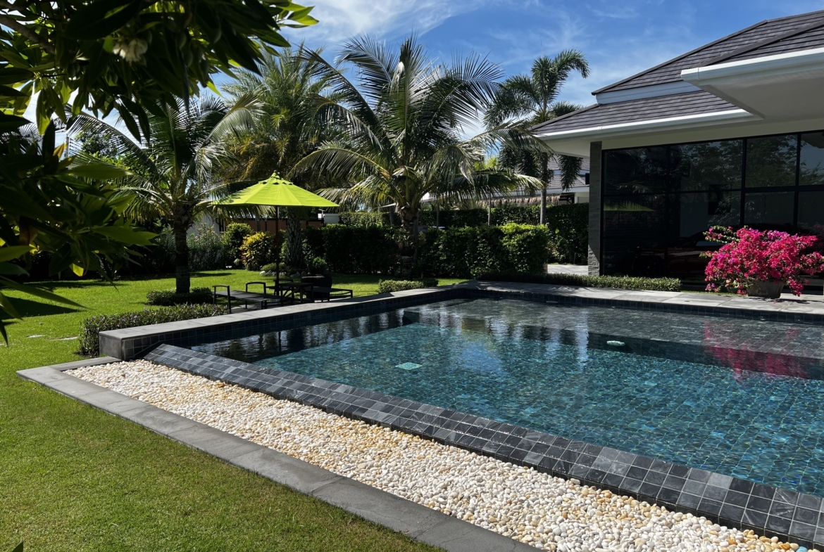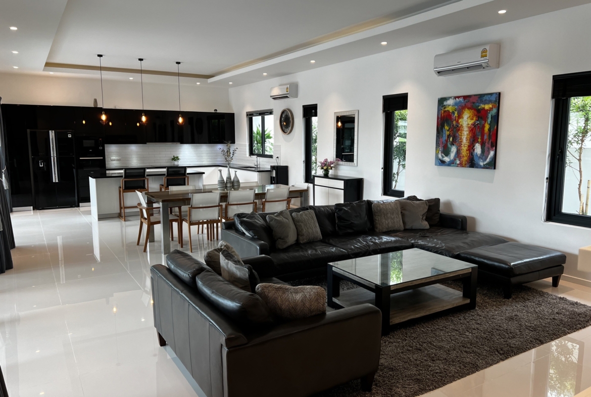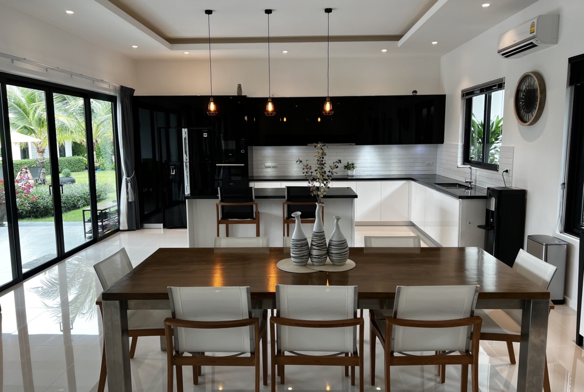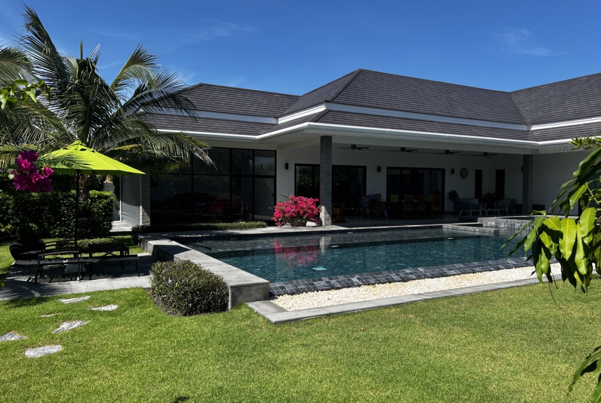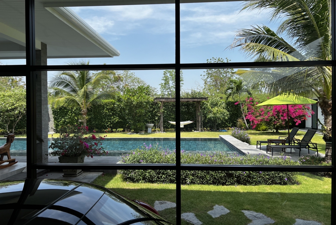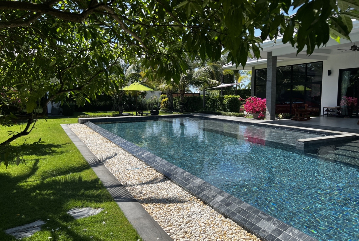 A luxury villa surrounded by a beautiful, lush tropical landscape located just 2km from the beach between Cha Am and Hua Hin. The property comes fully furnished with very high quality furniture/fittings including a modern style kitchen, large italian leather sofas, commercial grade gym equipment, double glazed windows and much more.