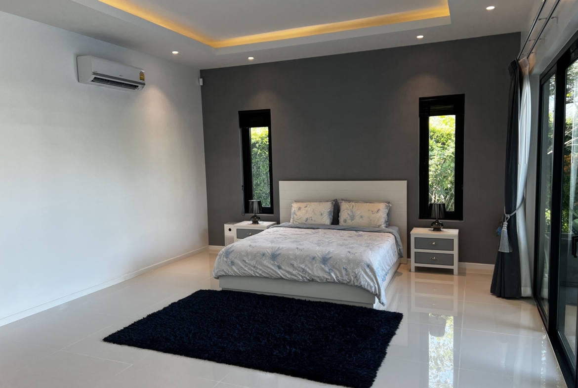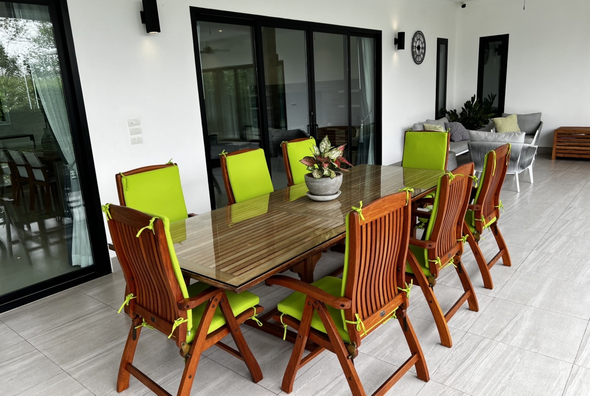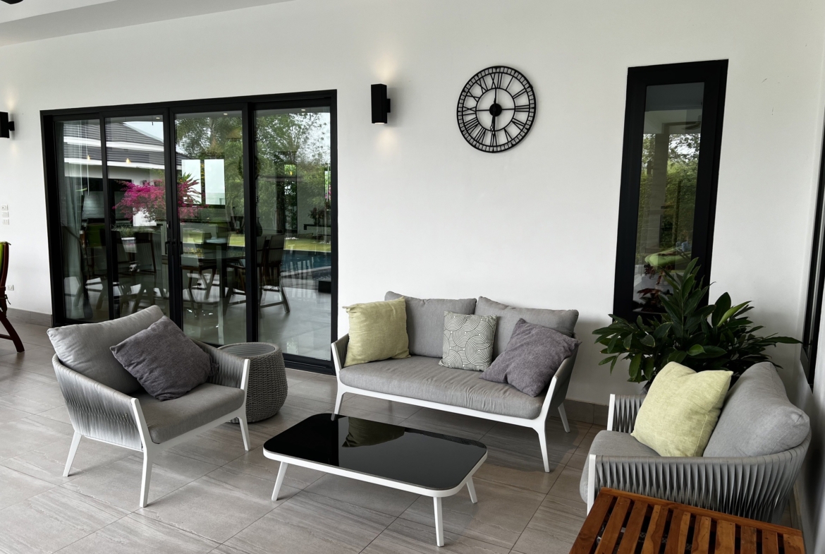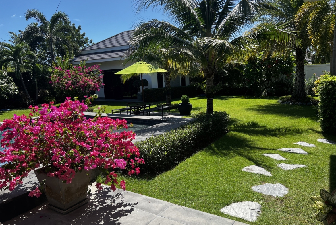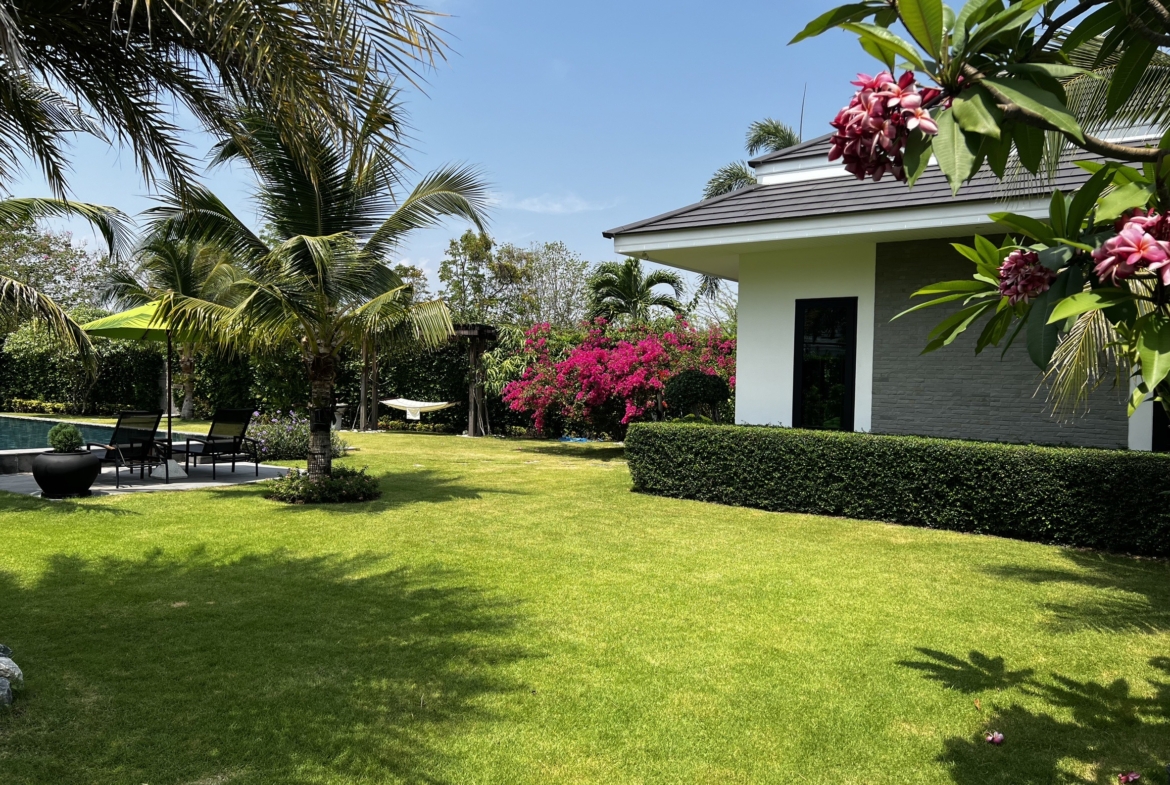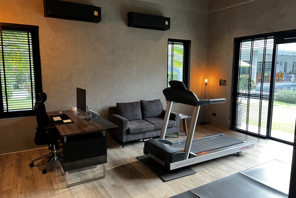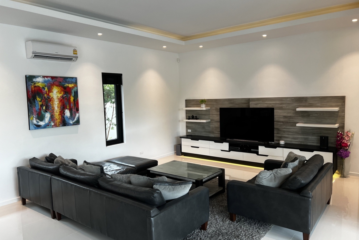 A luxury villa surrounded by a beautiful, lush tropical landscape located just 2km from the beach between Cha Am and Hua Hin. The property comes fully furnished with very high quality furniture/fittings including a modern style kitchen, large italian leather sofas, commercial grade gym equipment, double glazed windows and much more.