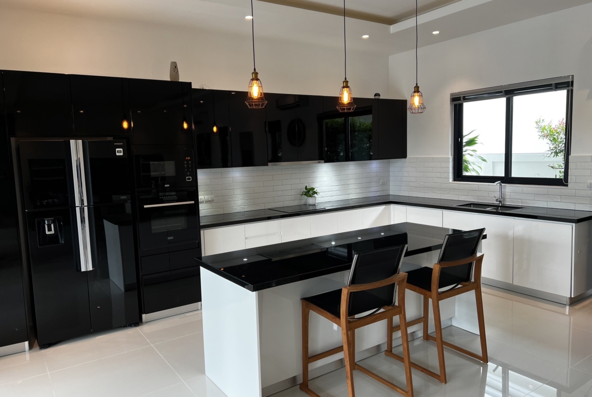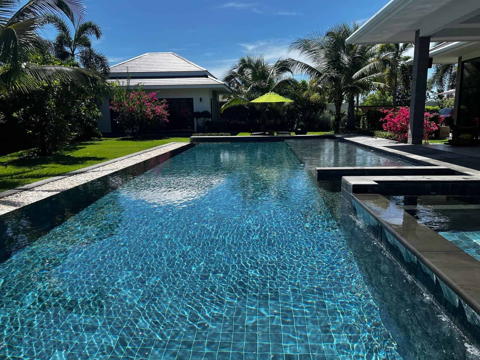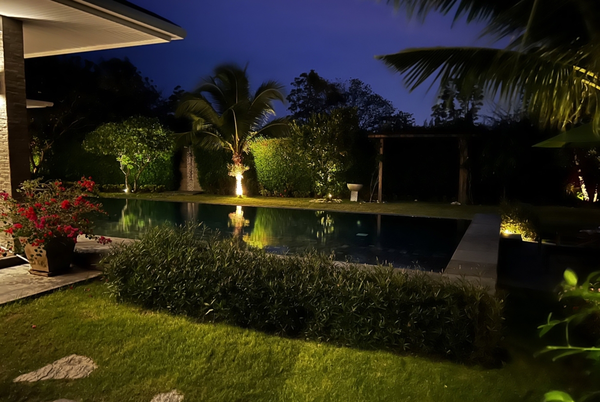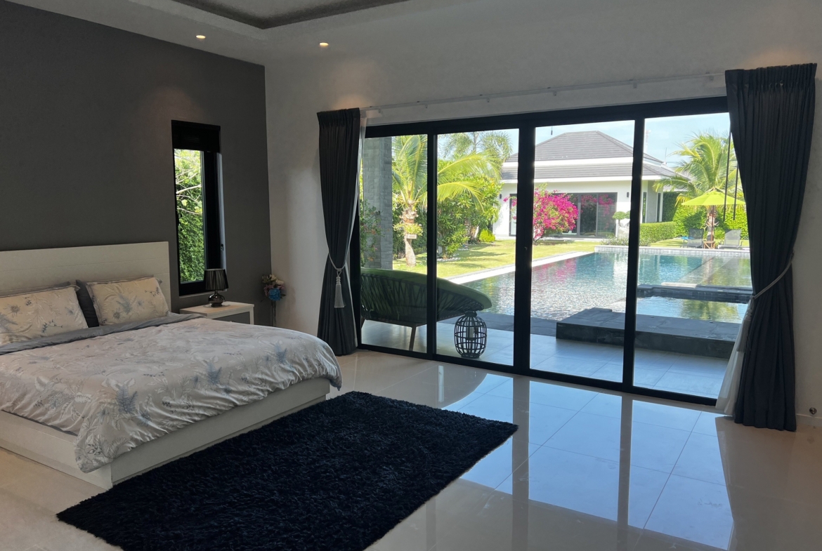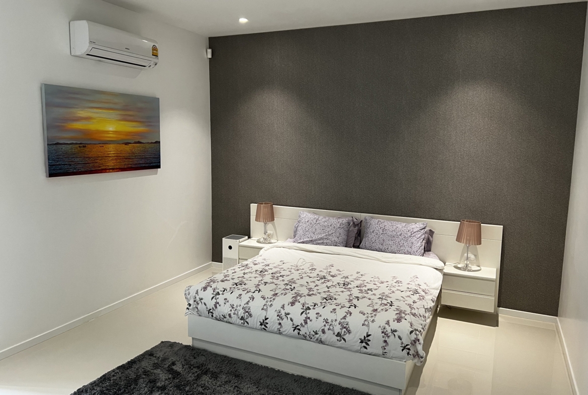 A luxury villa surrounded by a beautiful, lush tropical landscape located just 2km from the beach between Cha Am and Hua Hin. The property comes fully furnished with very high quality furniture/fittings including a modern style kitchen, large italian leather sofas, commercial grade gym equipment, double glazed windows and much more.