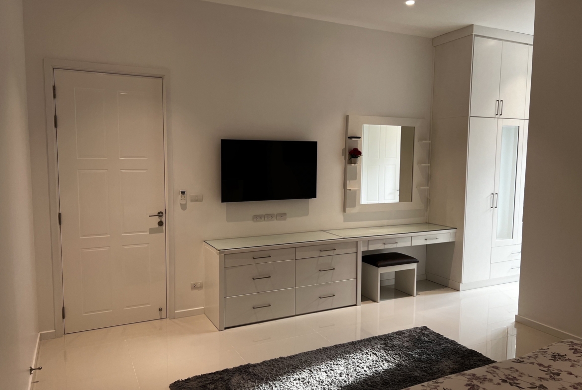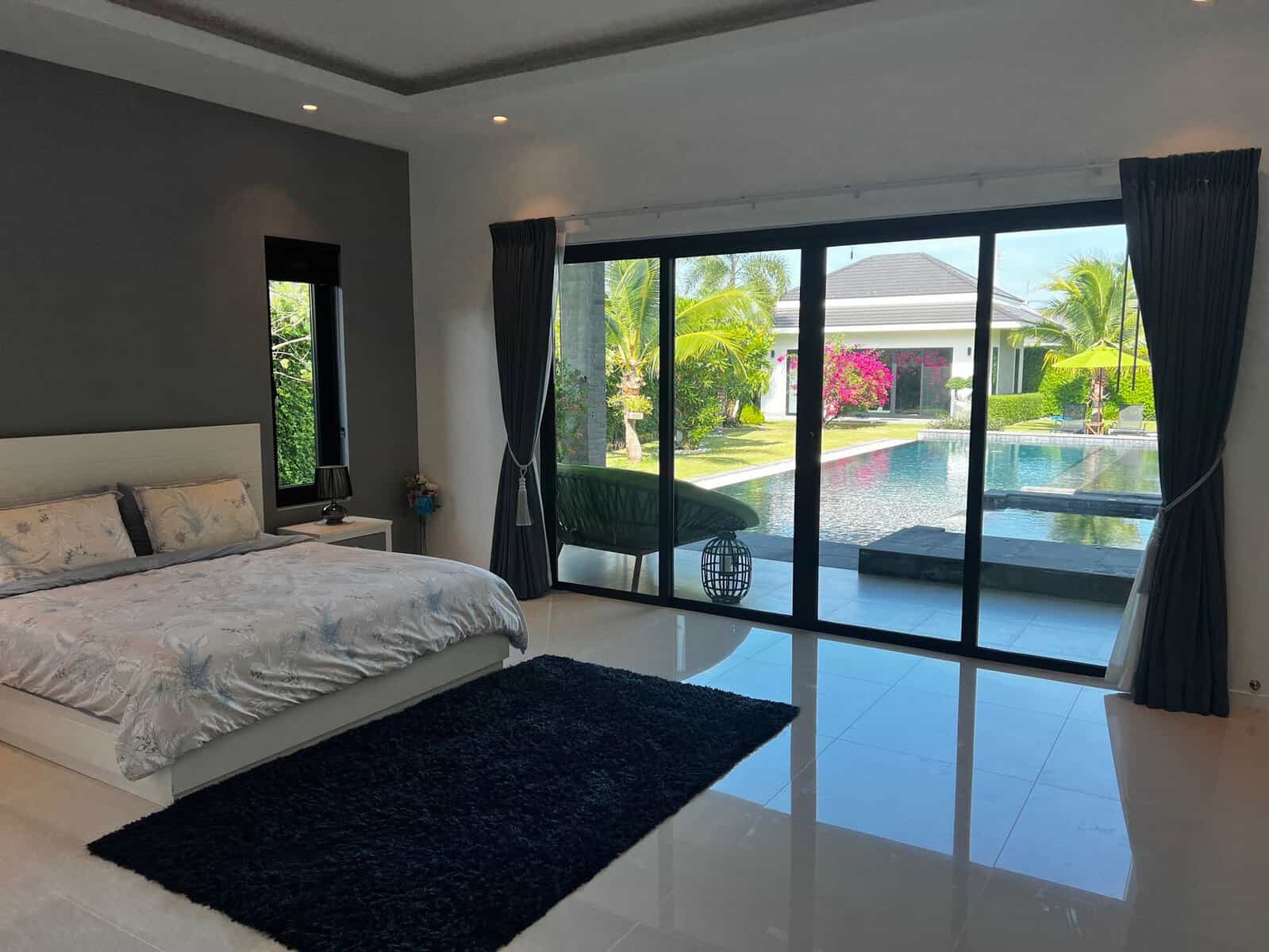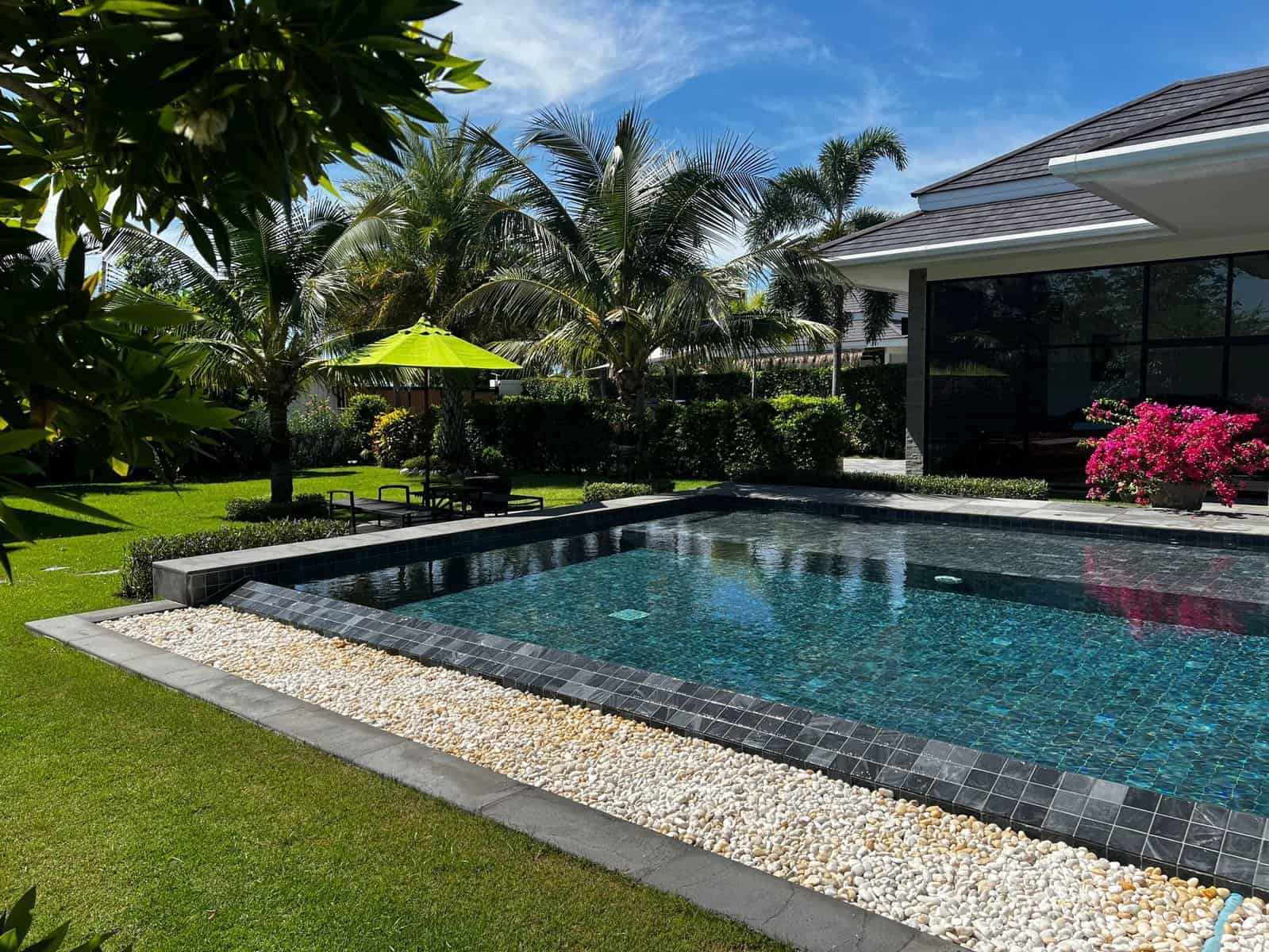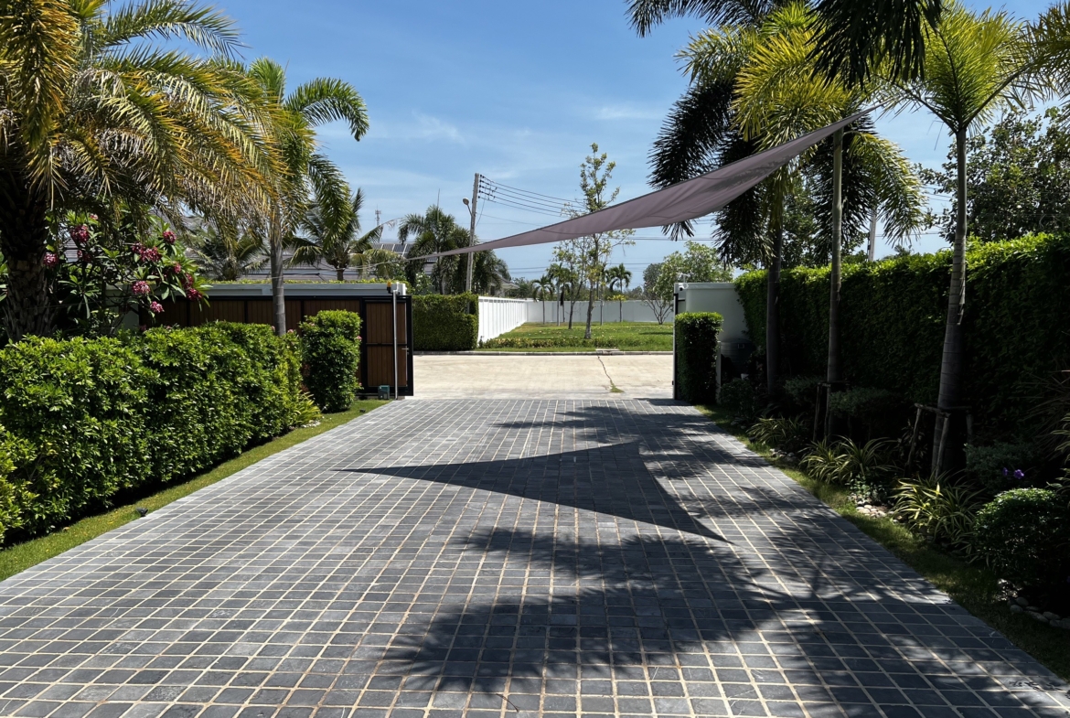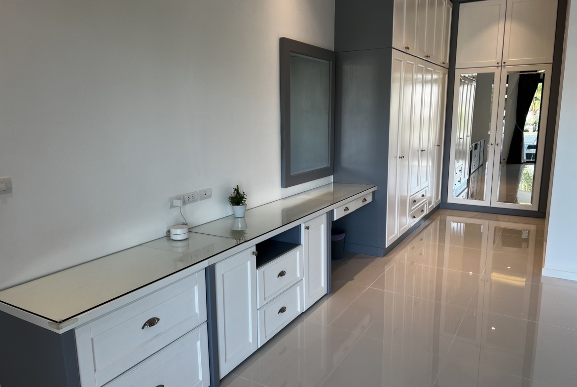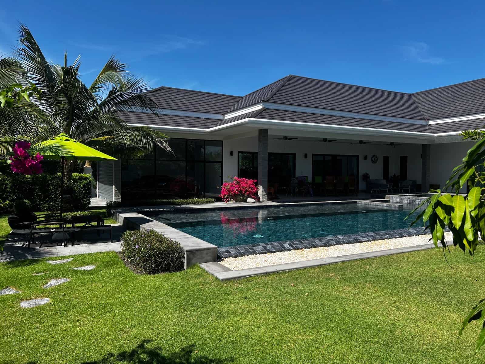 A luxury villa surrounded by a beautiful, lush tropical landscape located just 2km from the beach between Cha Am and Hua Hin. The property comes fully furnished with very high quality furniture/fittings including a modern style kitchen, large italian leather sofas, commercial grade gym equipment, double glazed windows and much more.