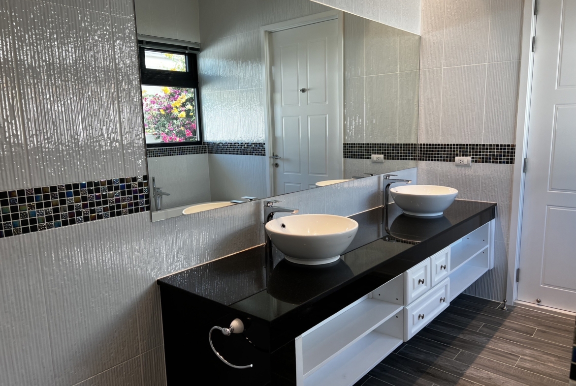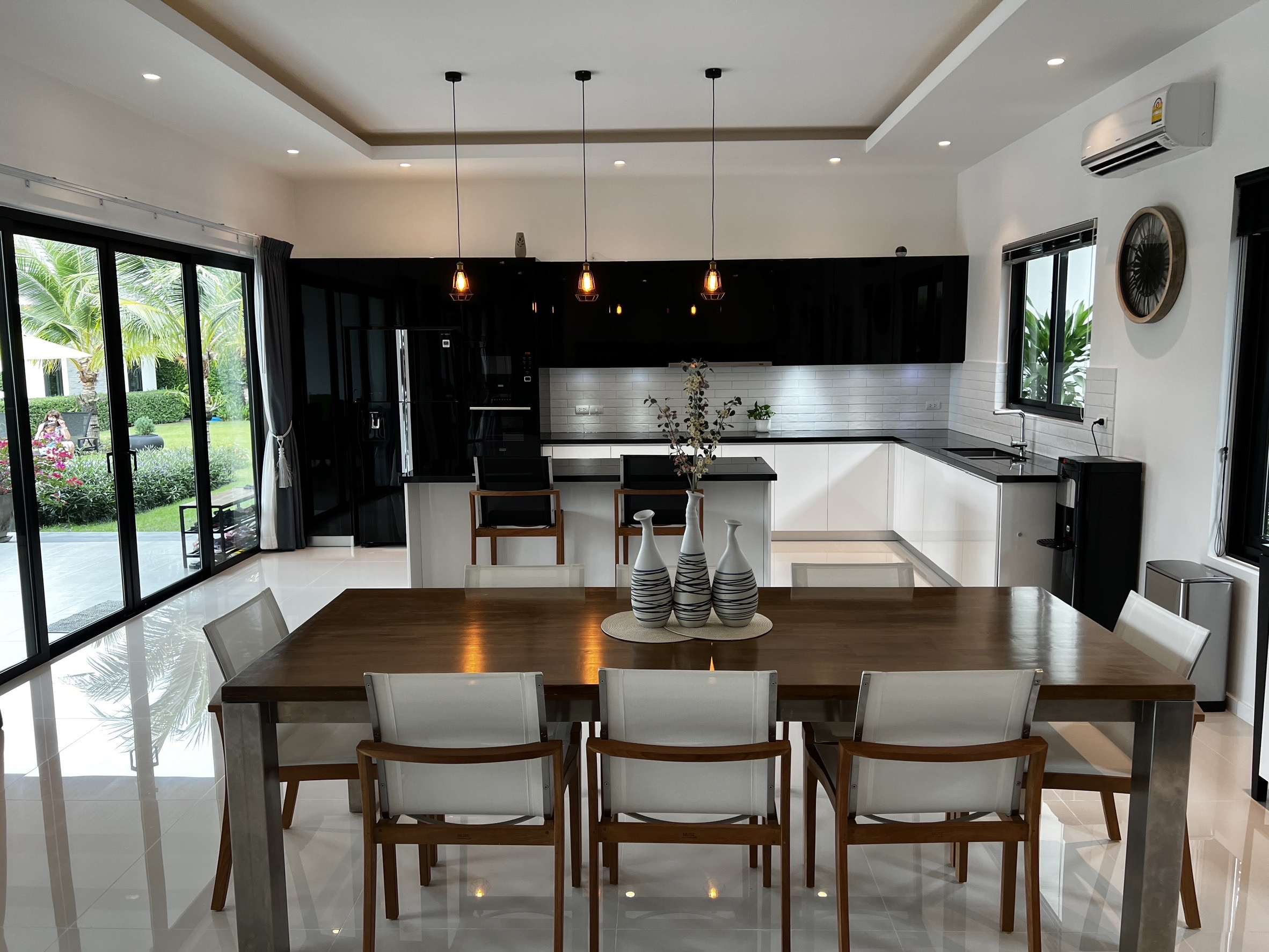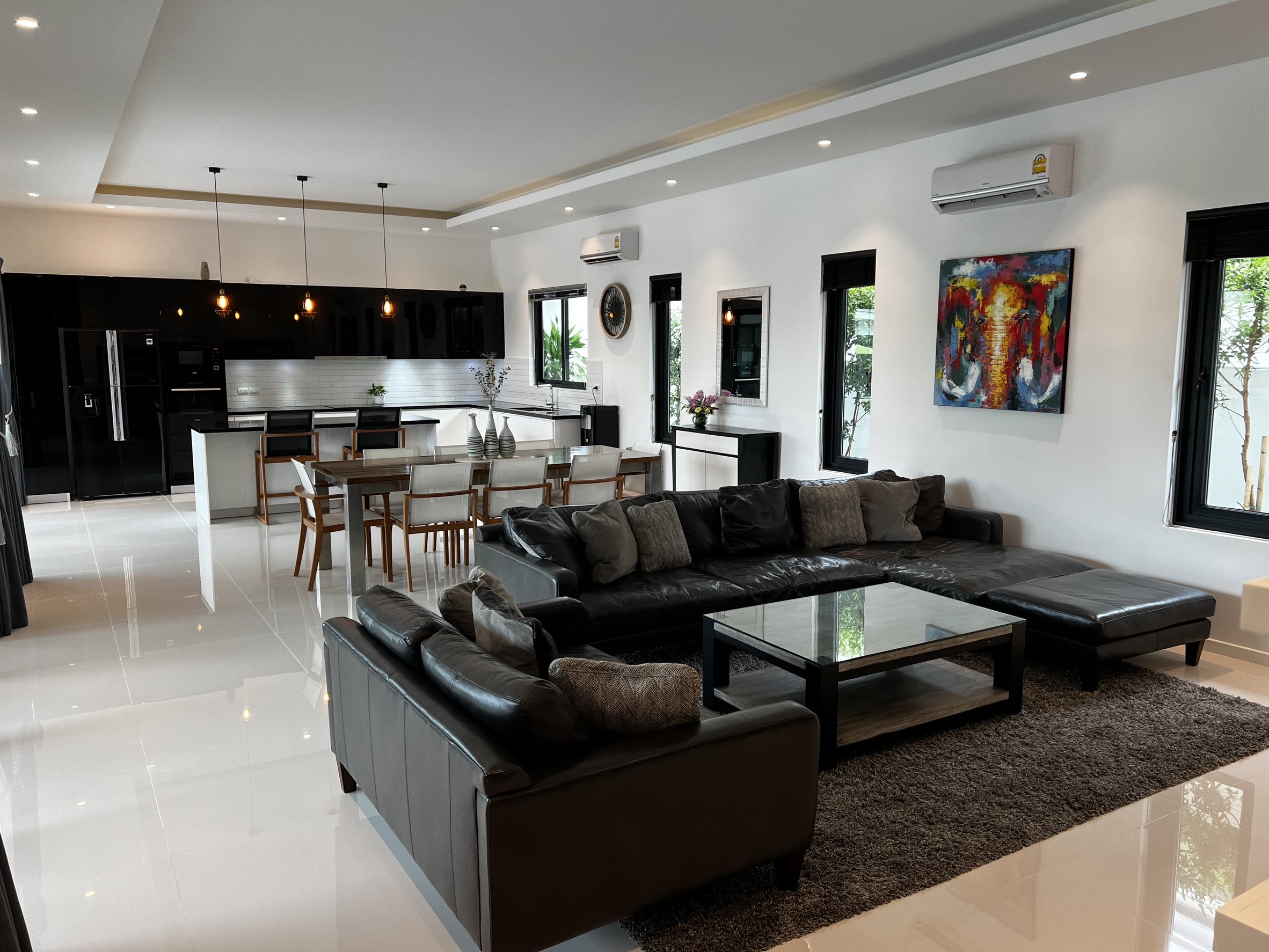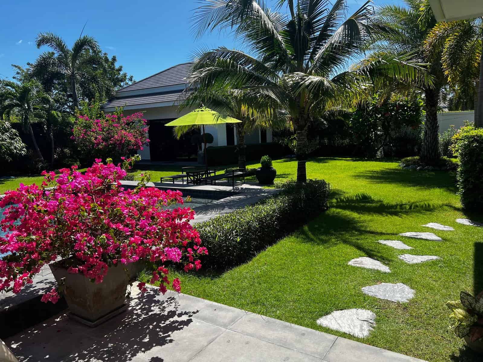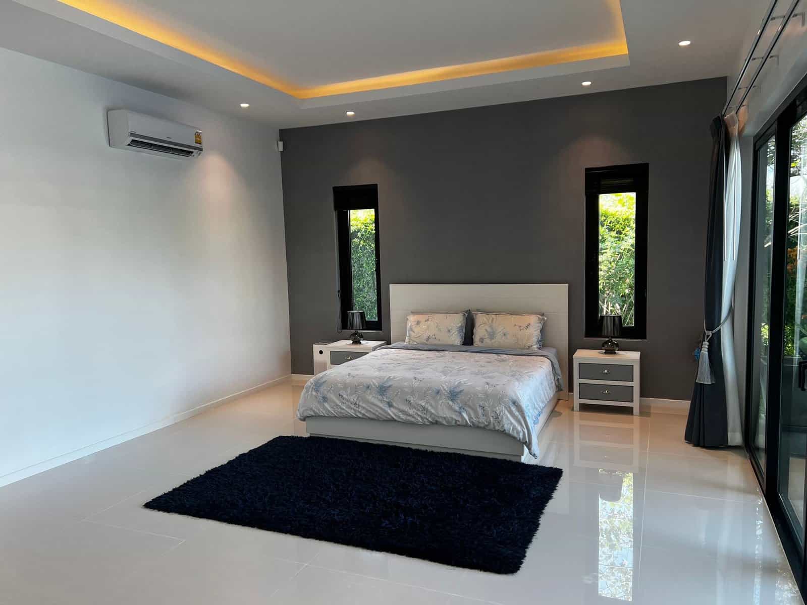 A luxury villa surrounded by a beautiful, lush tropical landscape located just 2km from the beach between Cha Am and Hua Hin. The property comes fully furnished with very high quality furniture/fittings including a modern style kitchen, large italian leather sofas, commercial grade gym equipment, double glazed windows and much more.