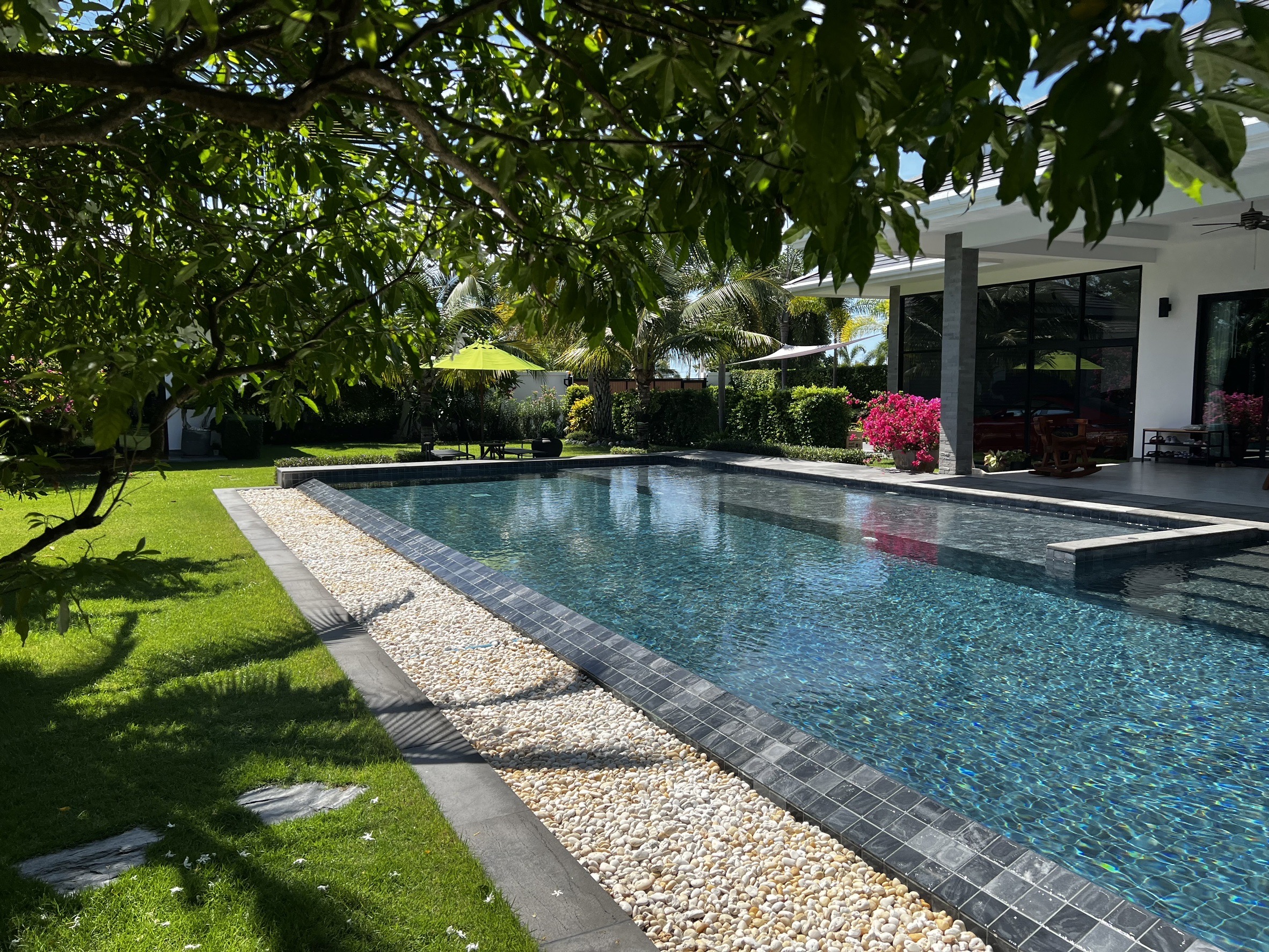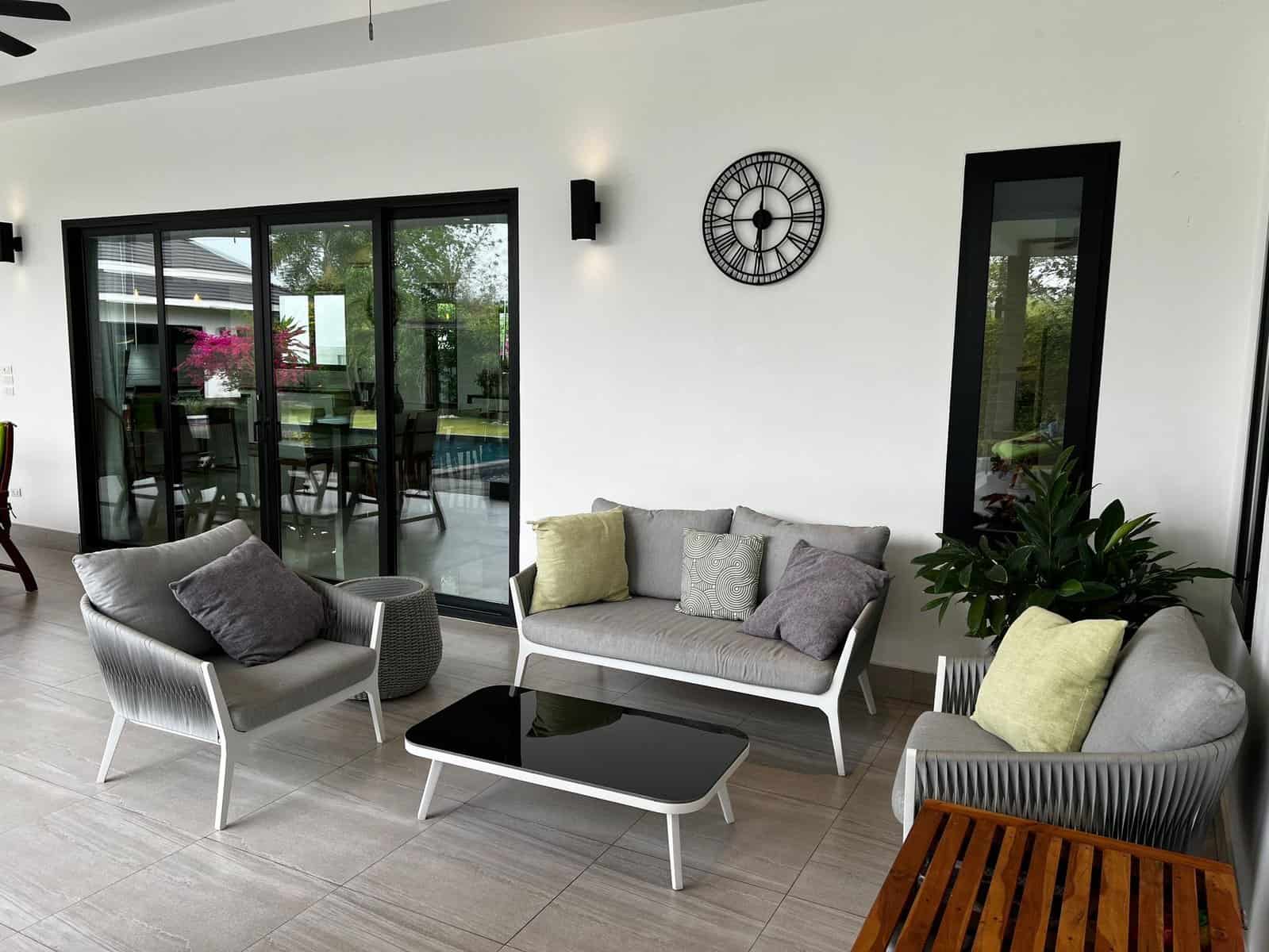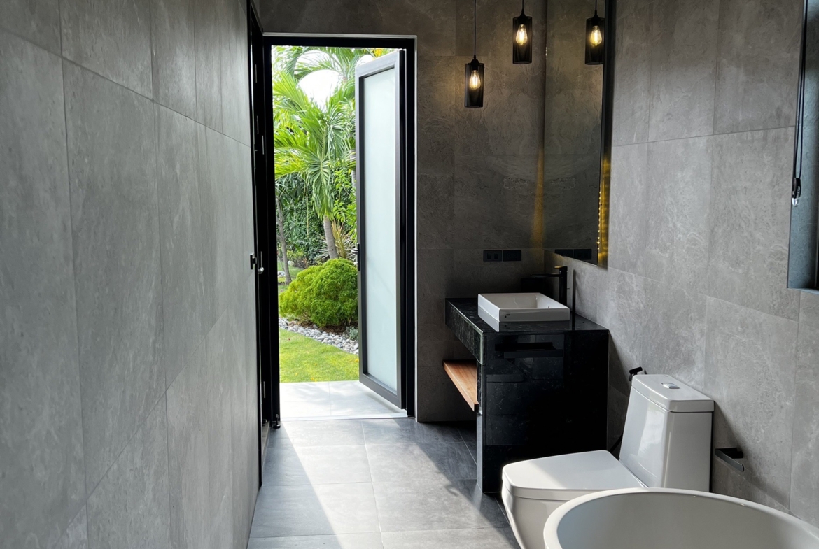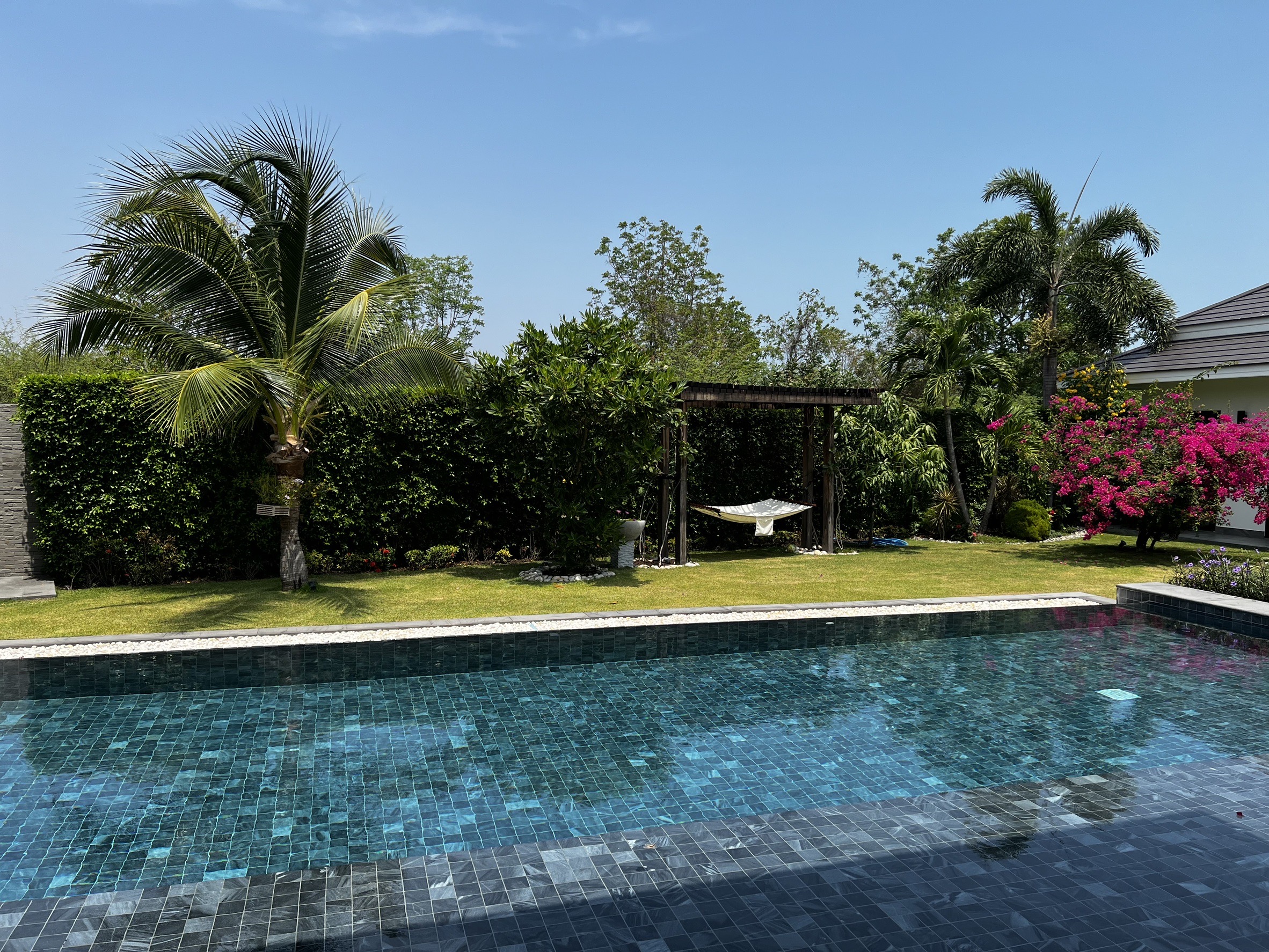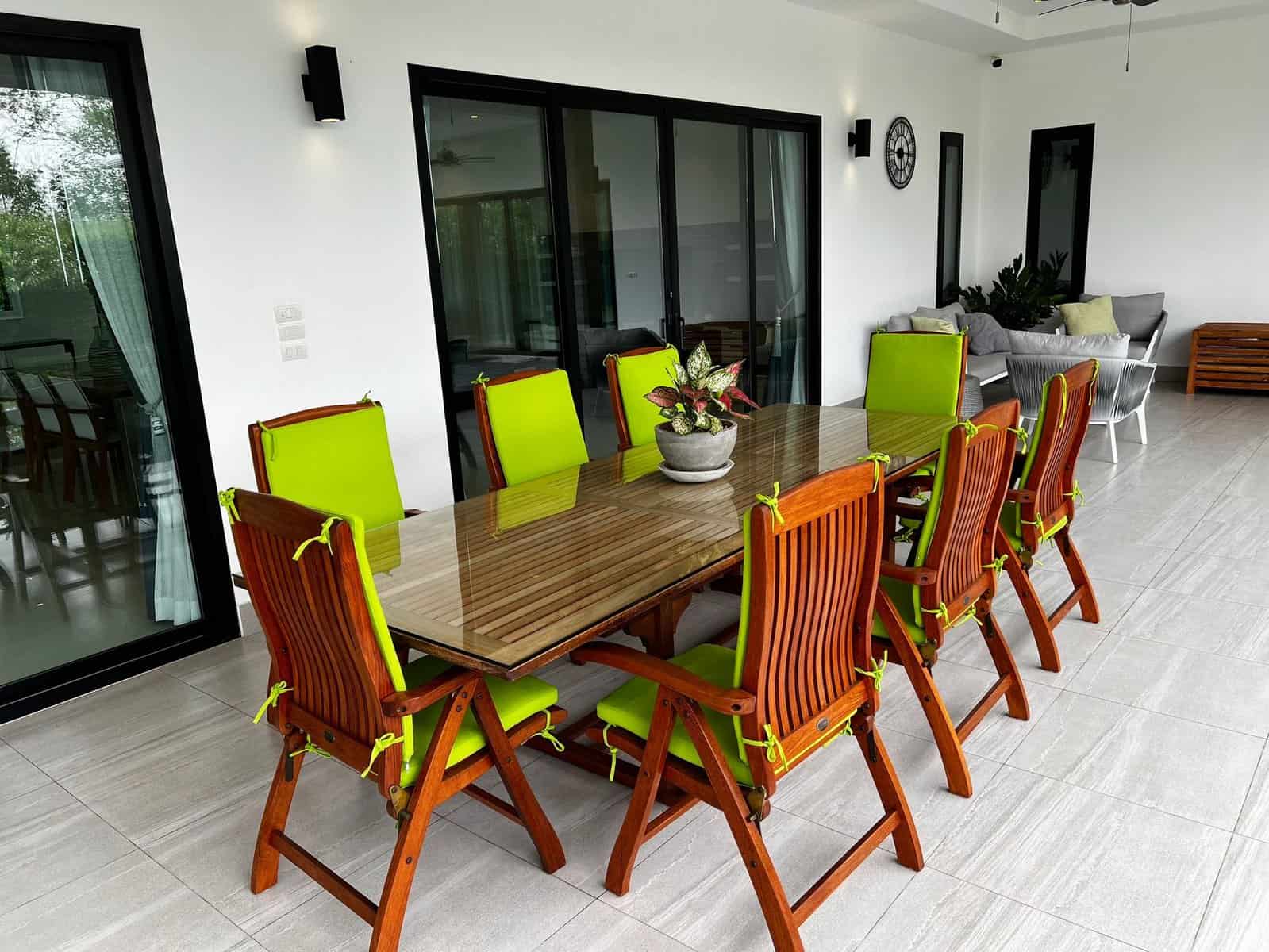 A luxury villa surrounded by a beautiful, lush tropical landscape located just 2km from the beach between Cha Am and Hua Hin. The property comes fully furnished with very high quality furniture/fittings including a modern style kitchen, large italian leather sofas, commercial grade gym equipment, double glazed windows and much more.