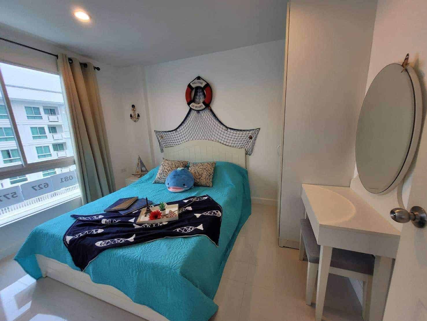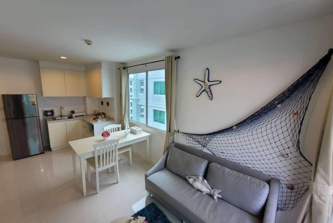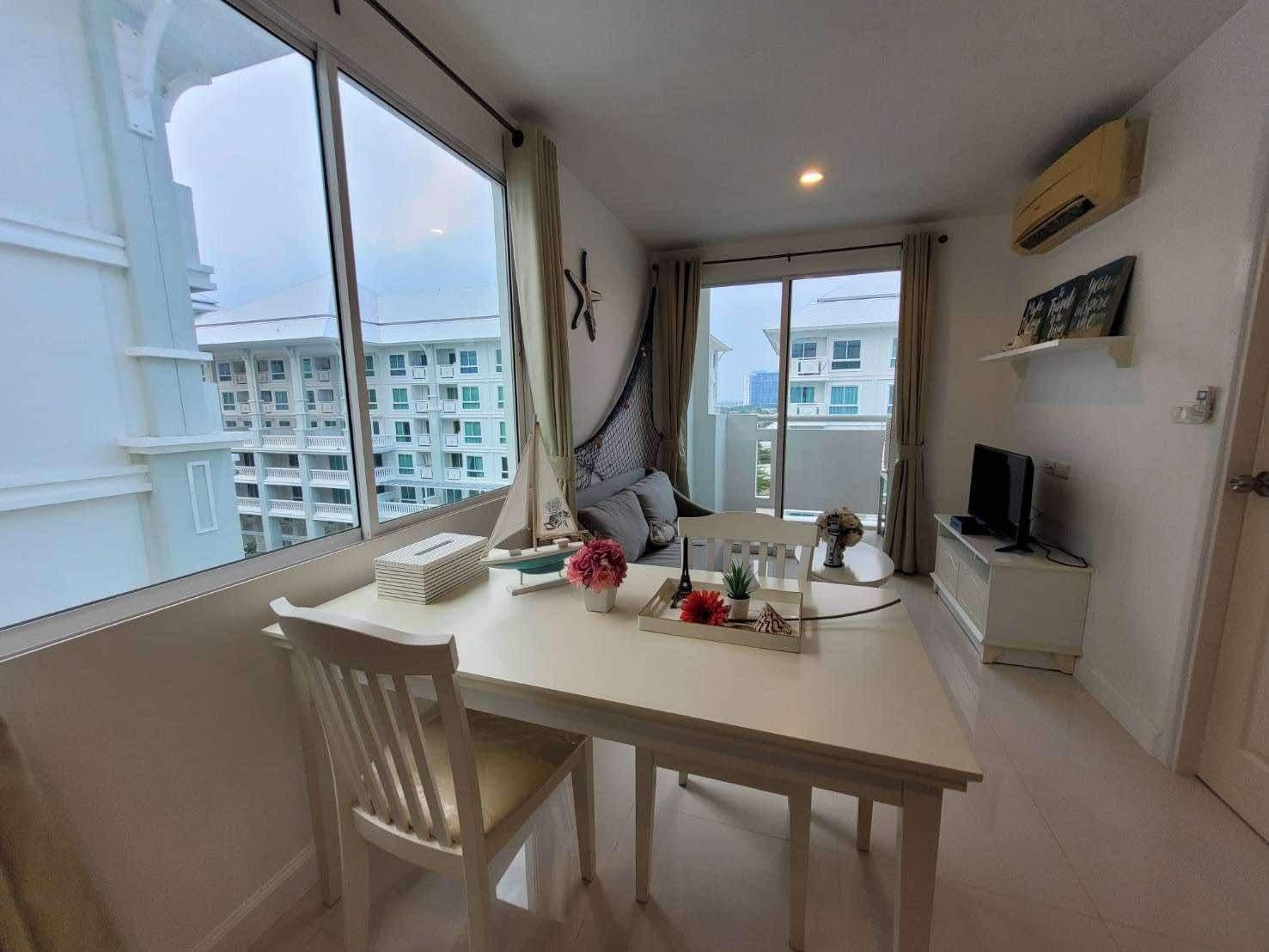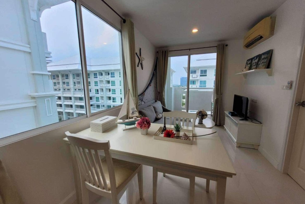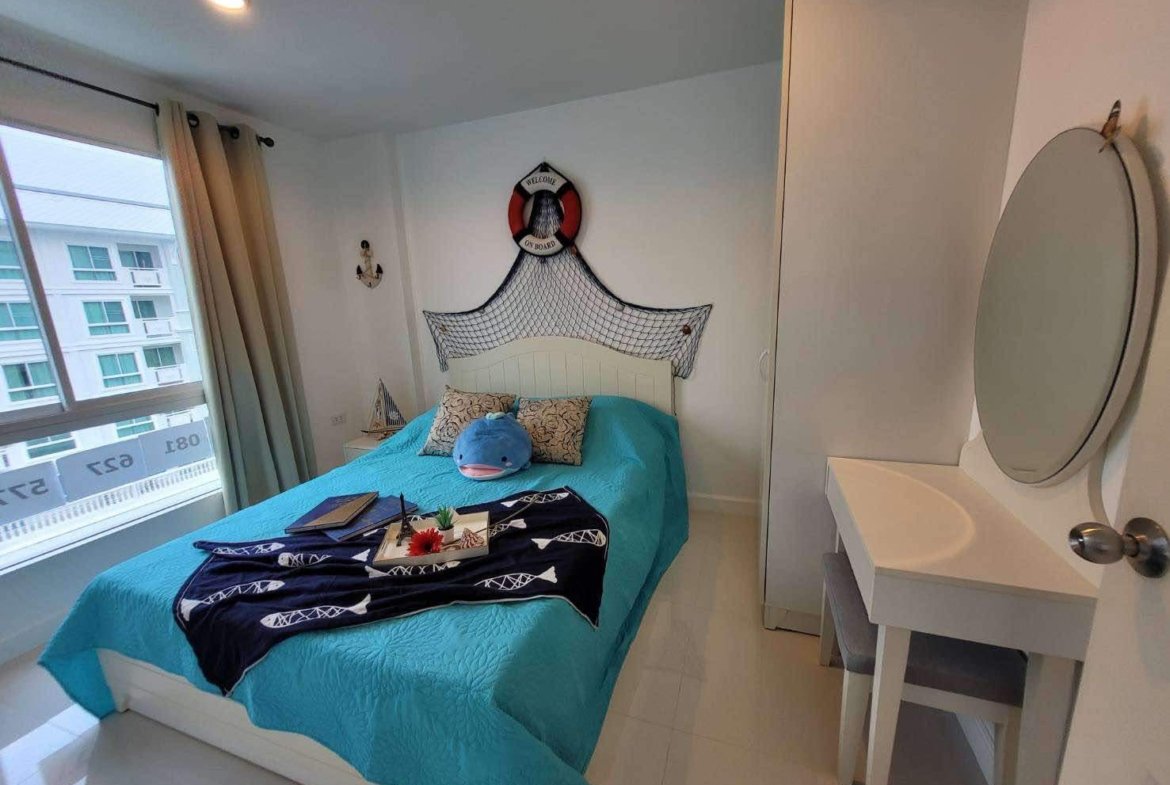 A corner unit in The Seaside City (The Energy) Cha-am Hua Hin, located on the 7th floor of Building E, the closest building to the sea. This 34 sq.m. room is fully furnished and equipped with electrical appliances, offering a great deal compared to the current project pricing. Despite its larger size, this brand-new, never-used room is priced at only 2.59 MB, significantly cheaper than the 32 sq.m. units selling for 2.79 MB. The project features the largest common area in Hua Hin, including a private beach, bowling alley, fitness center, basketball court, sauna, and a meditation chapel, providing a luxurious and convenient lifestyle.