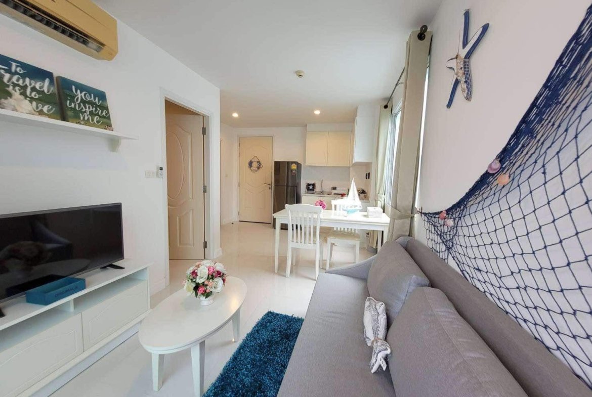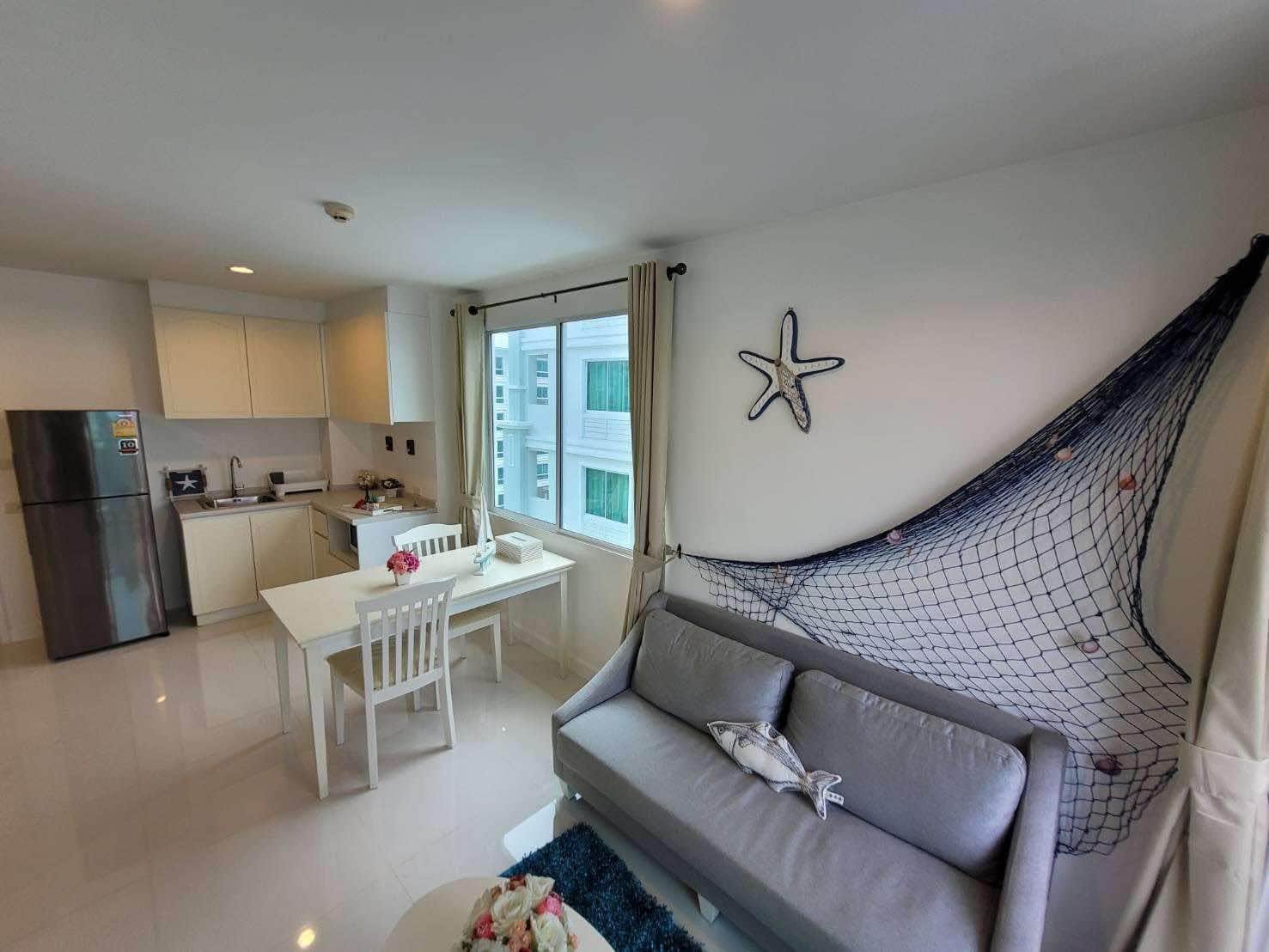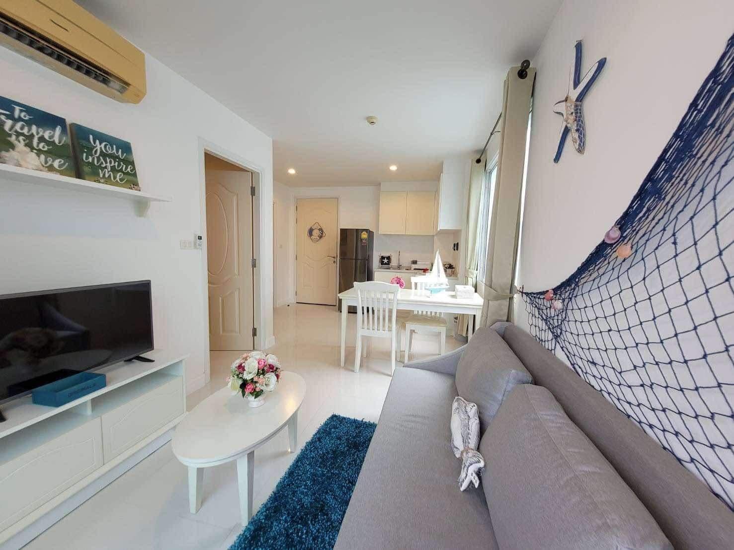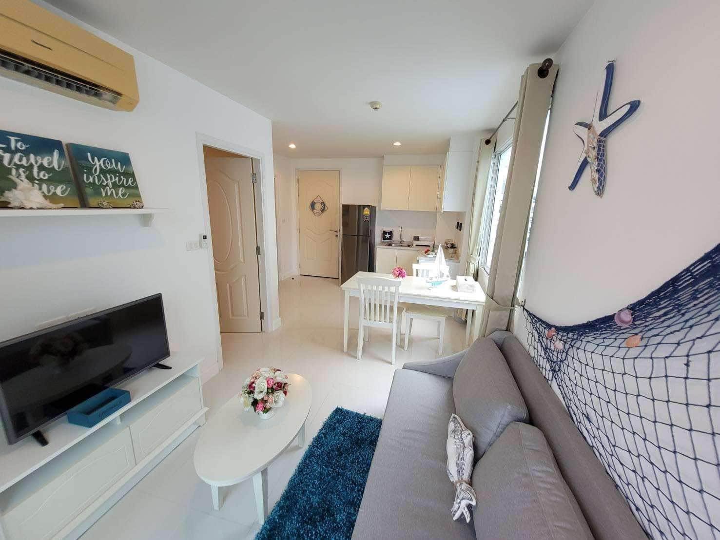 A corner unit in The Seaside City (The Energy) Cha-am Hua Hin, located on the 7th floor of Building E, the closest building to the sea. This 34 sq.m. room is fully furnished and equipped with electrical appliances, offering a great deal compared to the current project pricing. Despite its larger size, this brand-new, never-used room is priced at only 2.59 MB, significantly cheaper than the 32 sq.m. units selling for 2.79 MB. The project features the largest common area in Hua Hin, including a private beach, bowling alley, fitness center, basketball court, sauna, and a meditation chapel, providing a luxurious and convenient lifestyle.