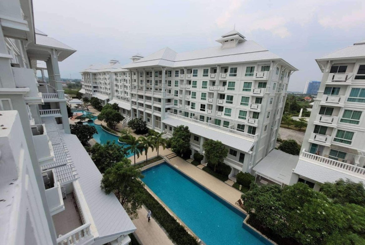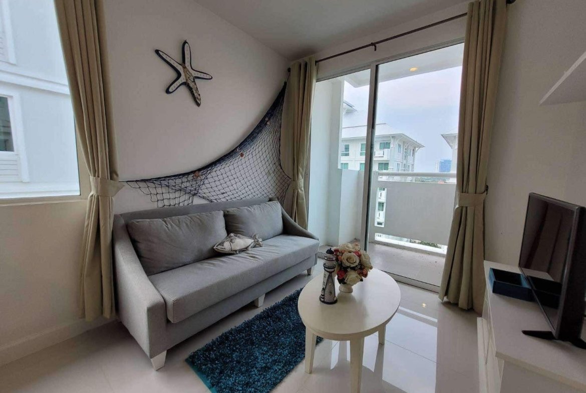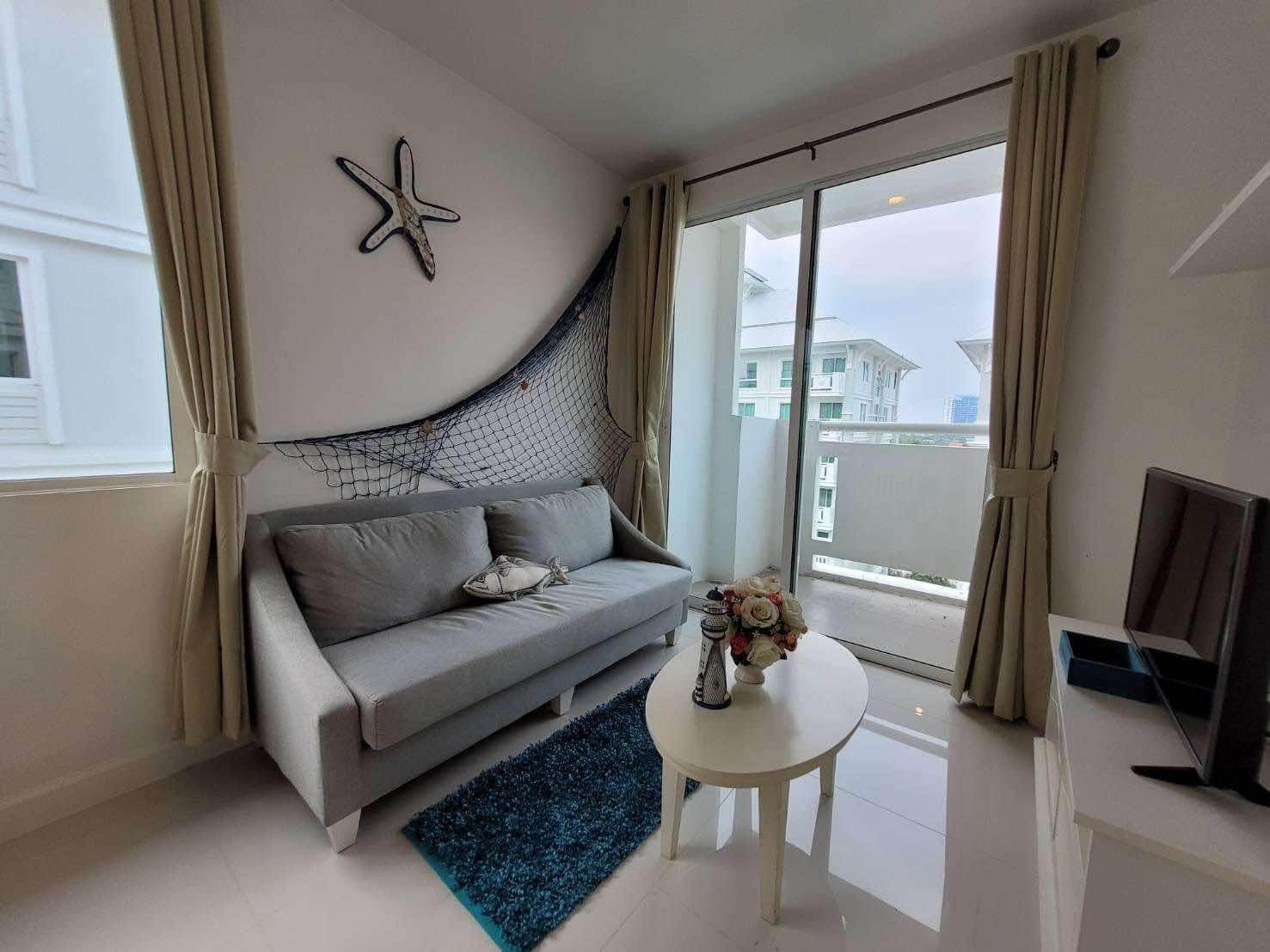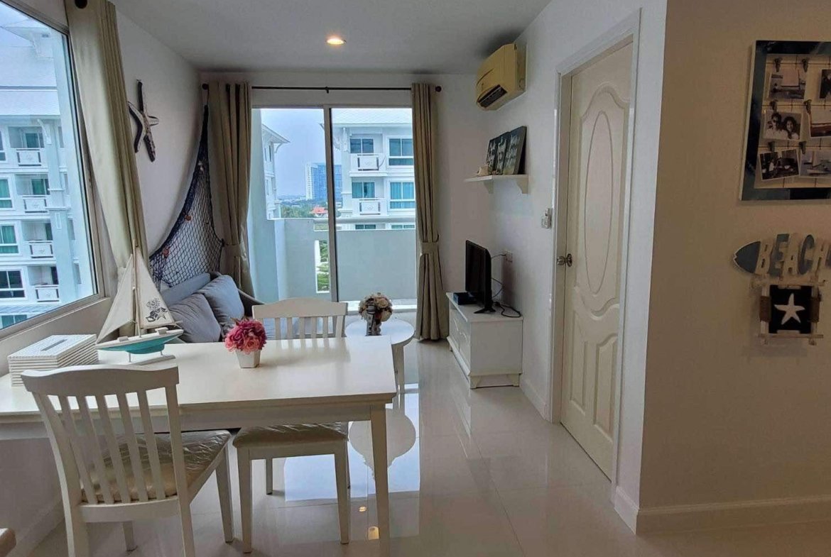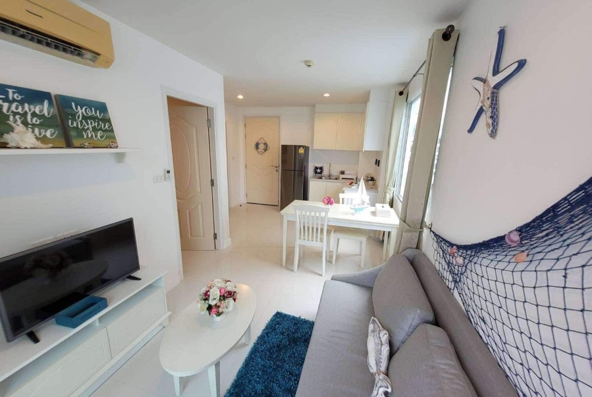 A corner unit in The Seaside City (The Energy) Cha-am Hua Hin, located on the 7th floor of Building E, the closest building to the sea. This 34 sq.m. room is fully furnished and equipped with electrical appliances, offering a great deal compared to the current project pricing. Despite its larger size, this brand-new, never-used room is priced at only 2.59 MB, significantly cheaper than the 32 sq.m. units selling for 2.79 MB. The project features the largest common area in Hua Hin, including a private beach, bowling alley, fitness center, basketball court, sauna, and a meditation chapel, providing a luxurious and convenient lifestyle.