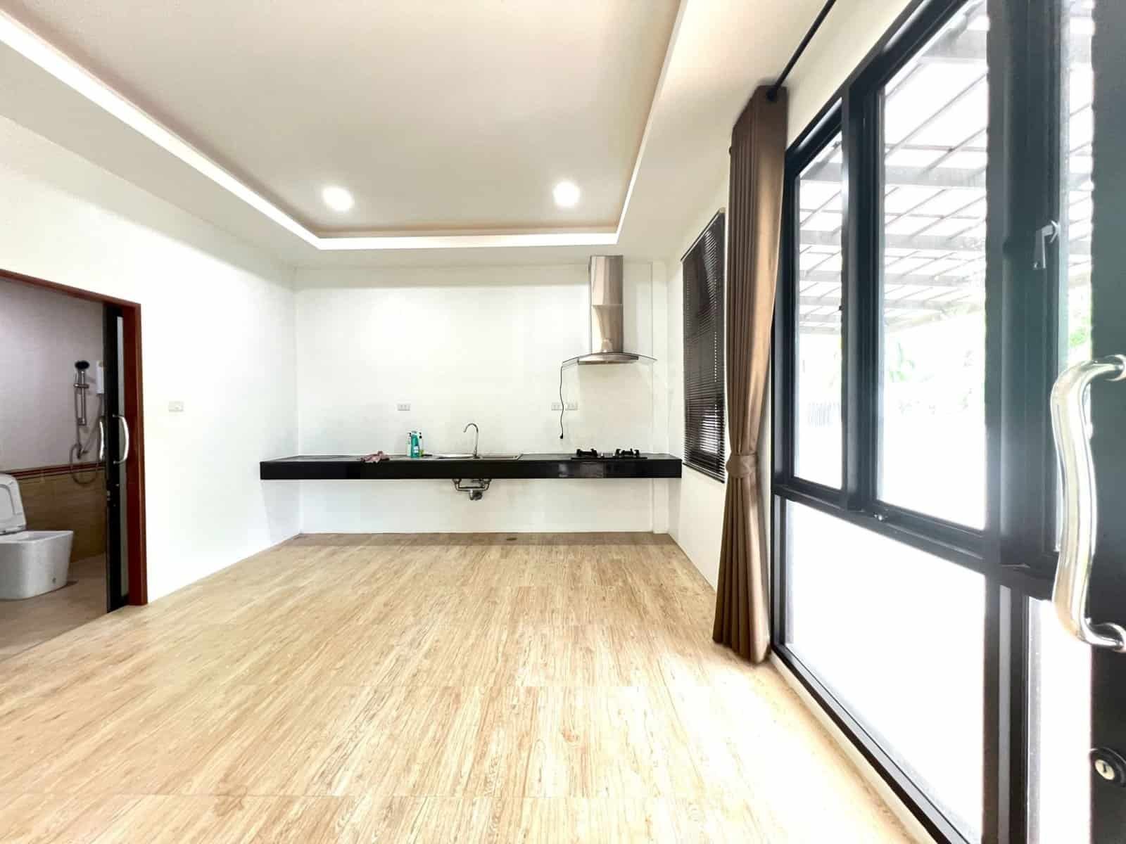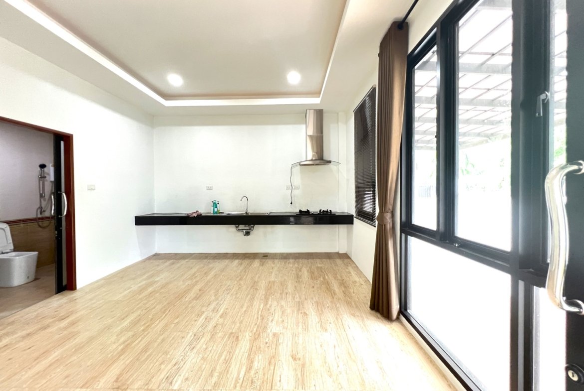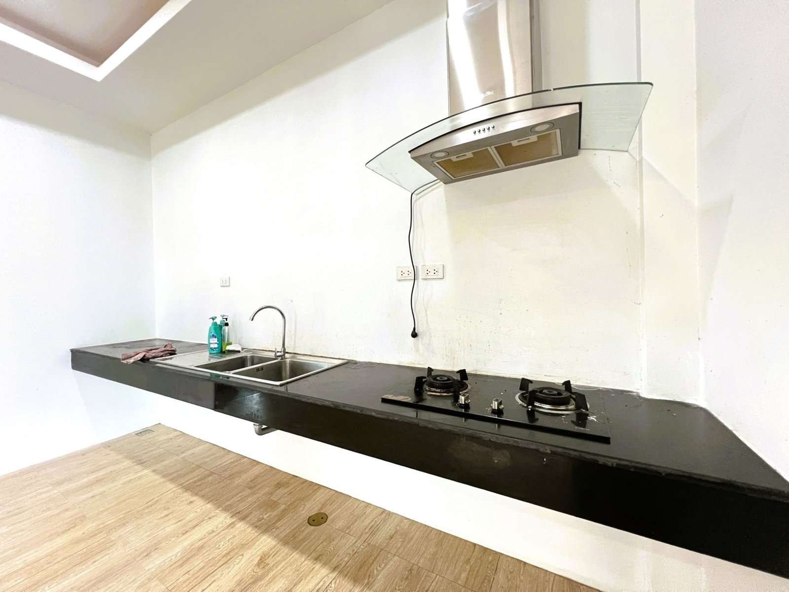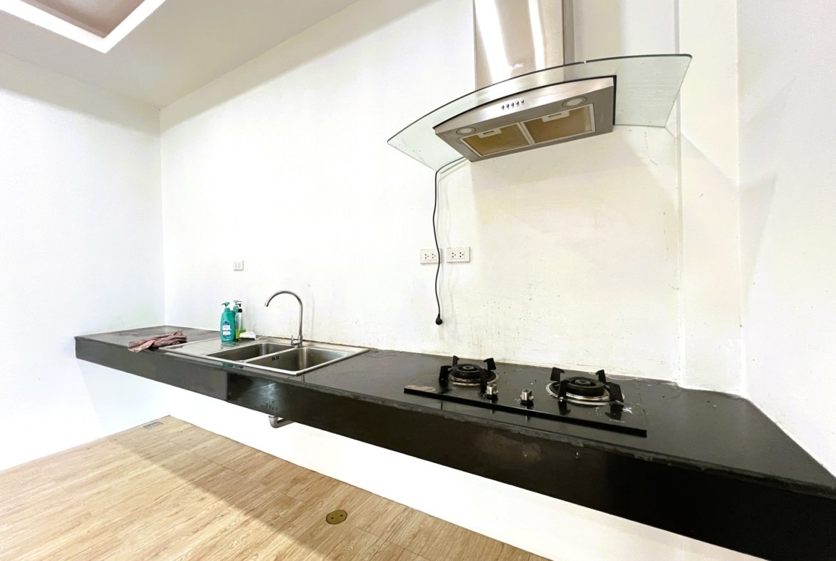 - Kitchen: Equipped with stovetop, food exhaust hood, and sink