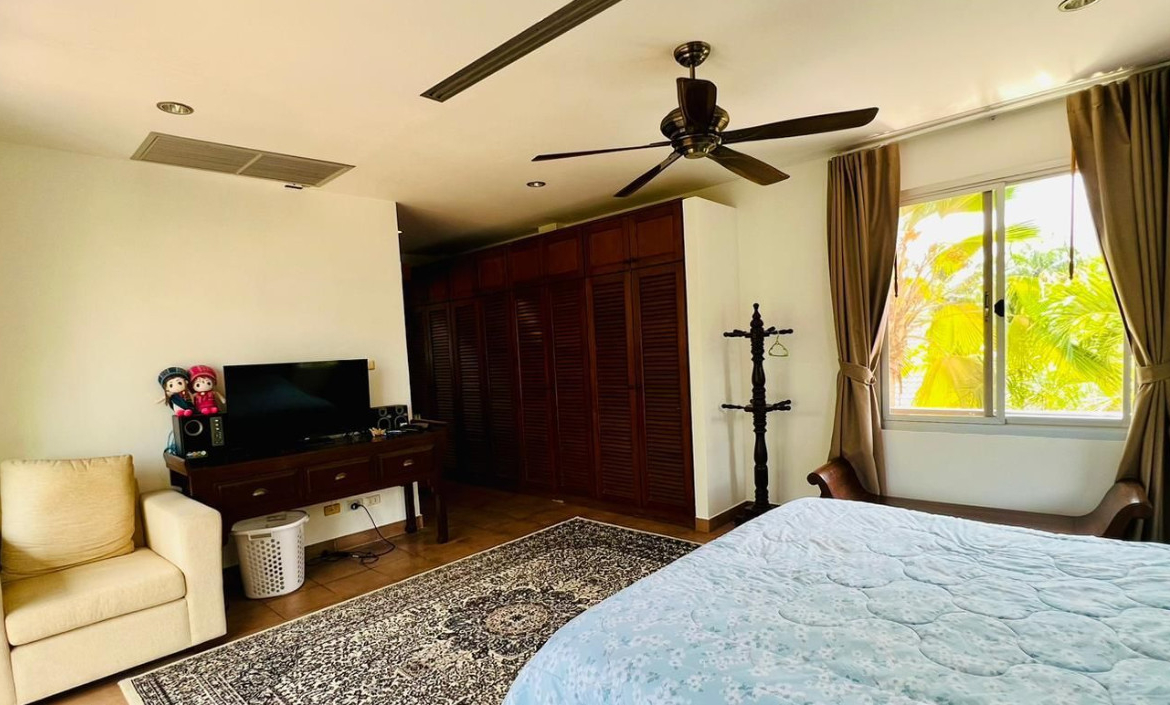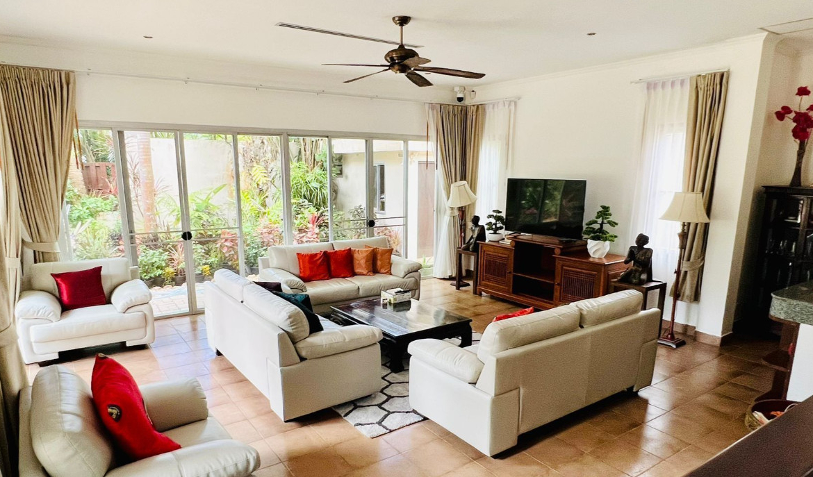 Beautiful mature private garden with lots of new flowers Large deep salt water pool 4 large bedrooms all with en-suite showers Large high gated forecourt shared with another house Within the forecourt completely walled garden with 6 high wattage solar lights which automatically switch on as it becomes dark Large Concrete Garden Room with a toilet 6 Toilets. One in each Ensuite, one downstairs and one in the garden room No CAM fees All rooms have Air Conditioning and Large Ceiling Fans