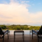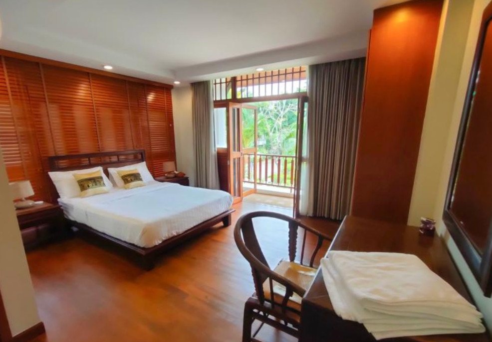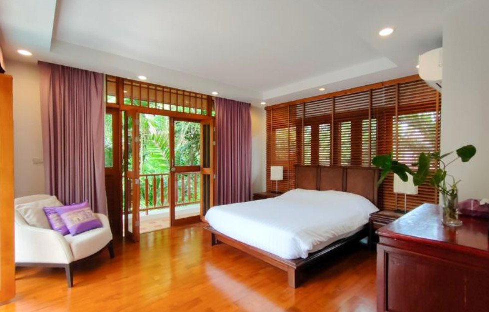 The villa is thoughtfully designed for comfort and indoor-outdoor living, featuring extensive wooden bi-folding windows with mosquito screens that open directly to the pool terrace and lush tropical garden views.