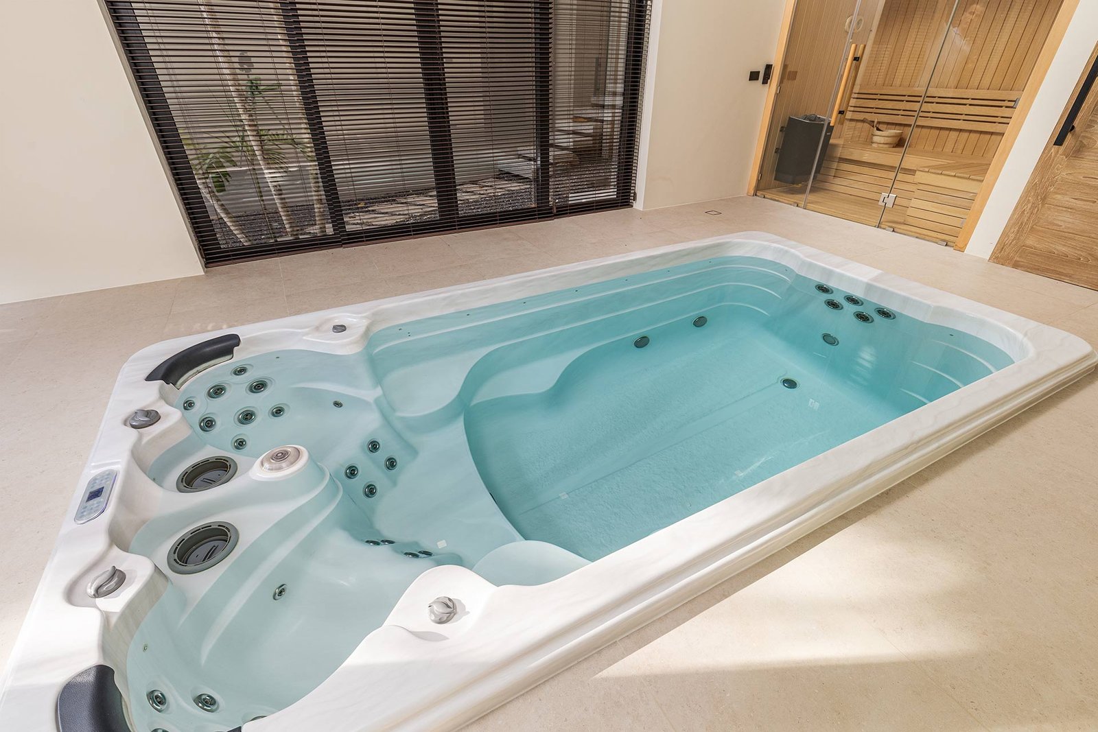 At the heart of the property is a dramatic 20-metre swimming pool, designed for both leisure and lap training, overlooking sweeping natural landscapes. A private wellness suite includes a jacuzzi and sauna with its own en-suite bathroom, alongside a fully equipped private gym.