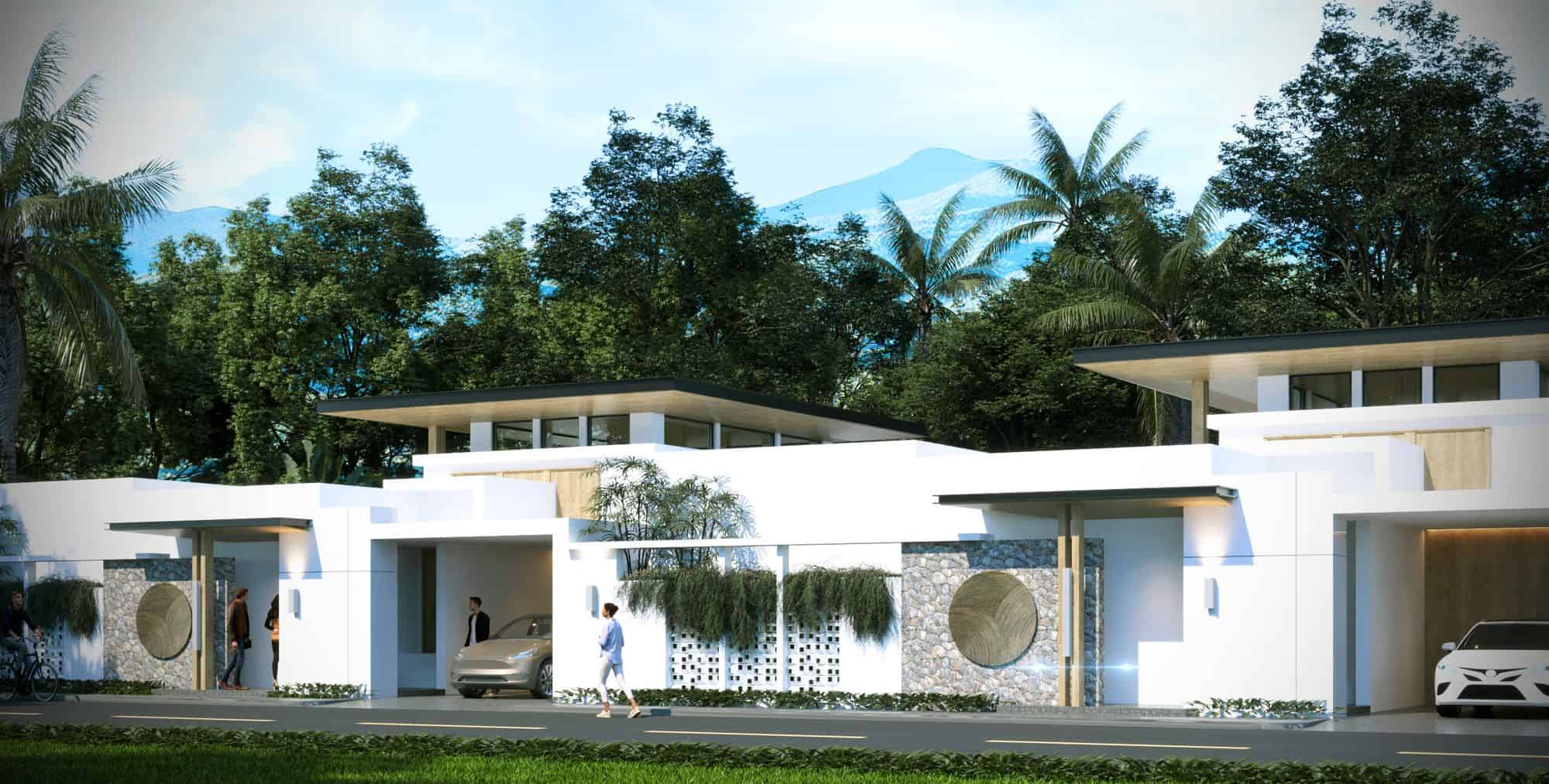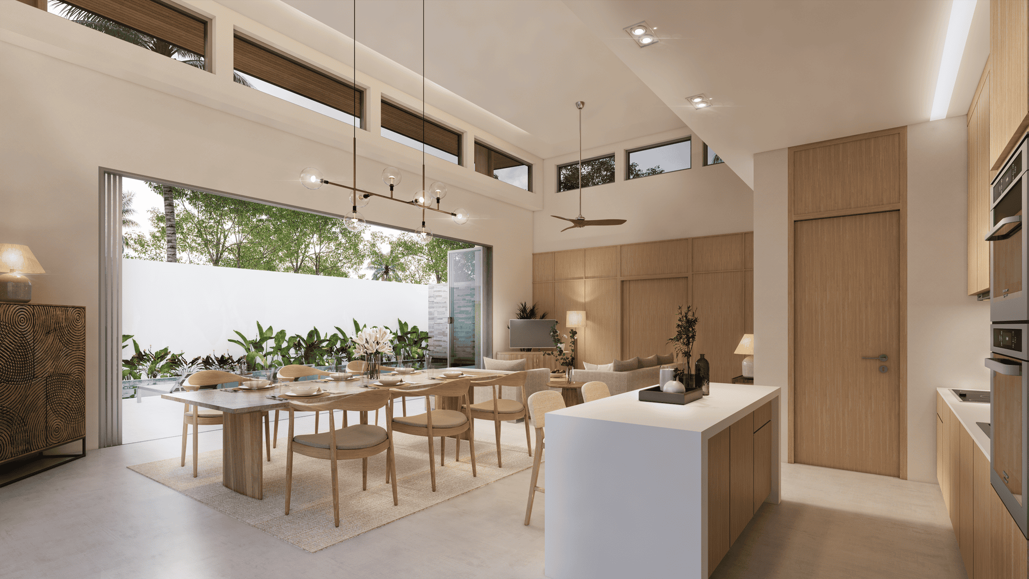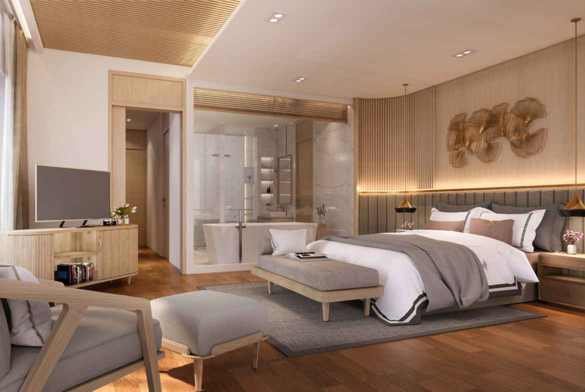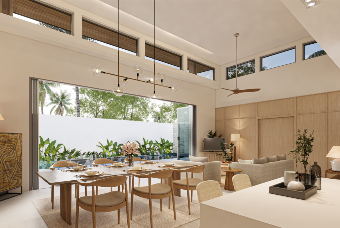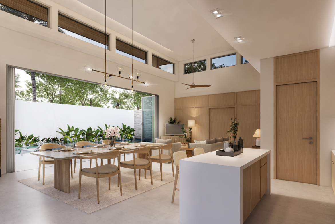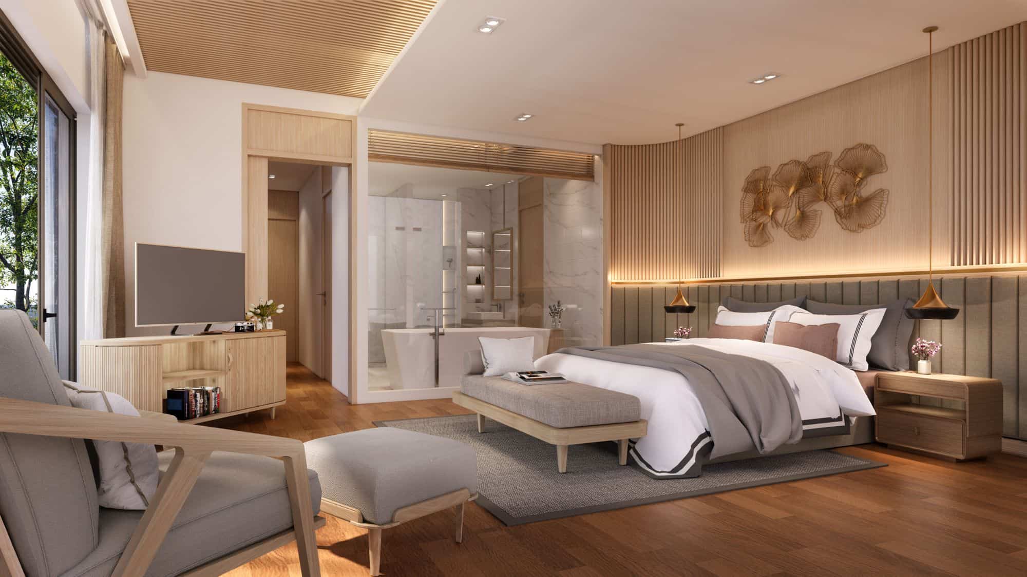 The design of each villa is stylishly simple, featuring either 3 or 4 bedrooms, all of which come with their own ensuite bathrooms. The master bedroom stands out with a walk-through closet and its larger bathroom which includes a separate bathtub and shower. At the heart of these villas, you’ll find a well-lit open-plan living and dining area with high ceilings, as well as a western-style kitchen complete with an island or breakfast bar.