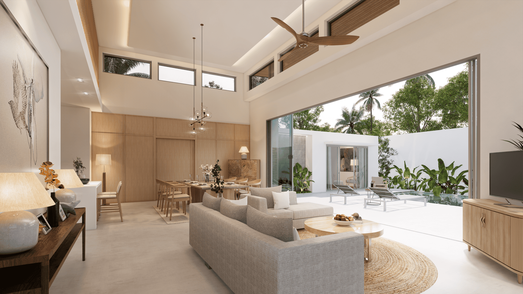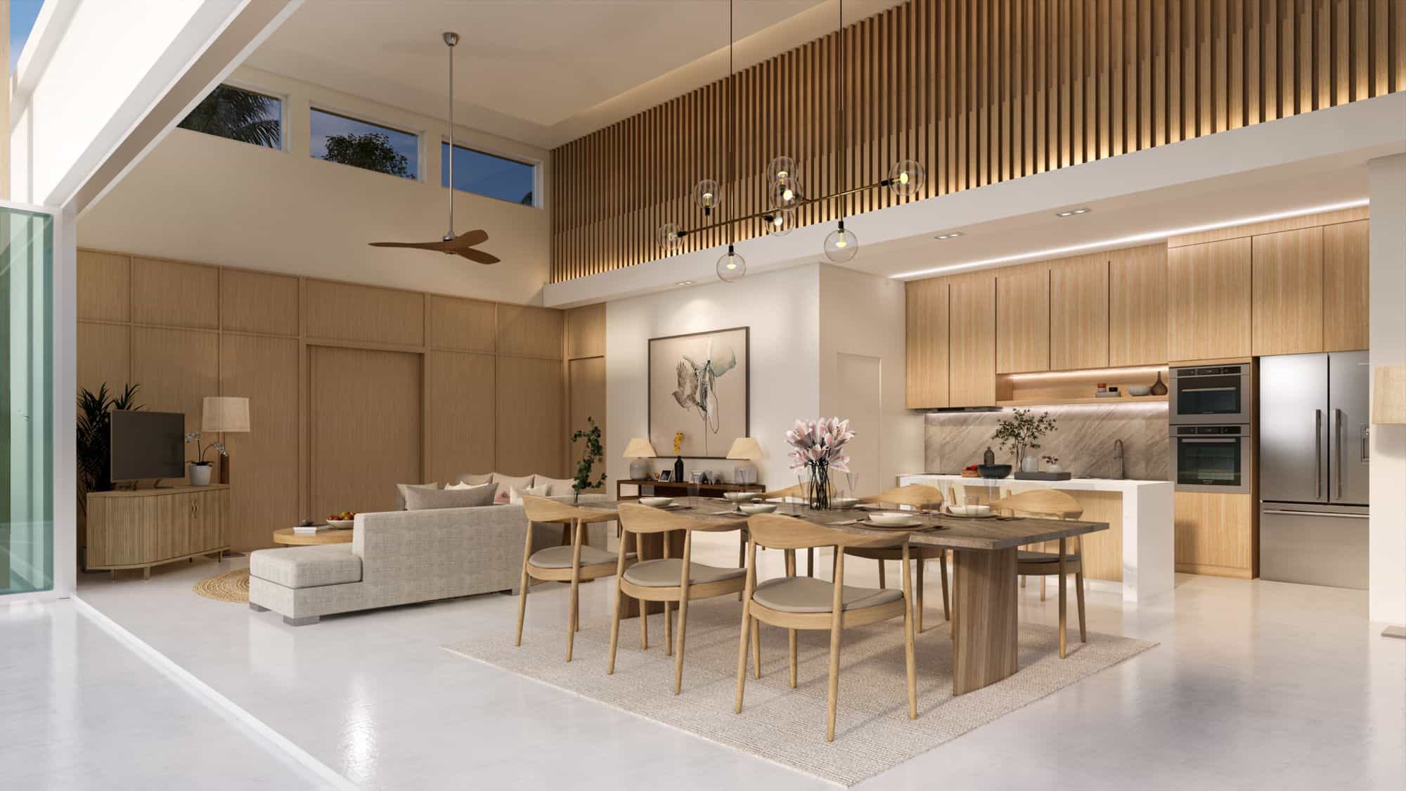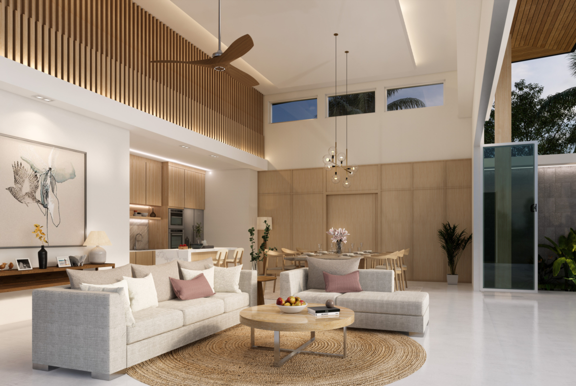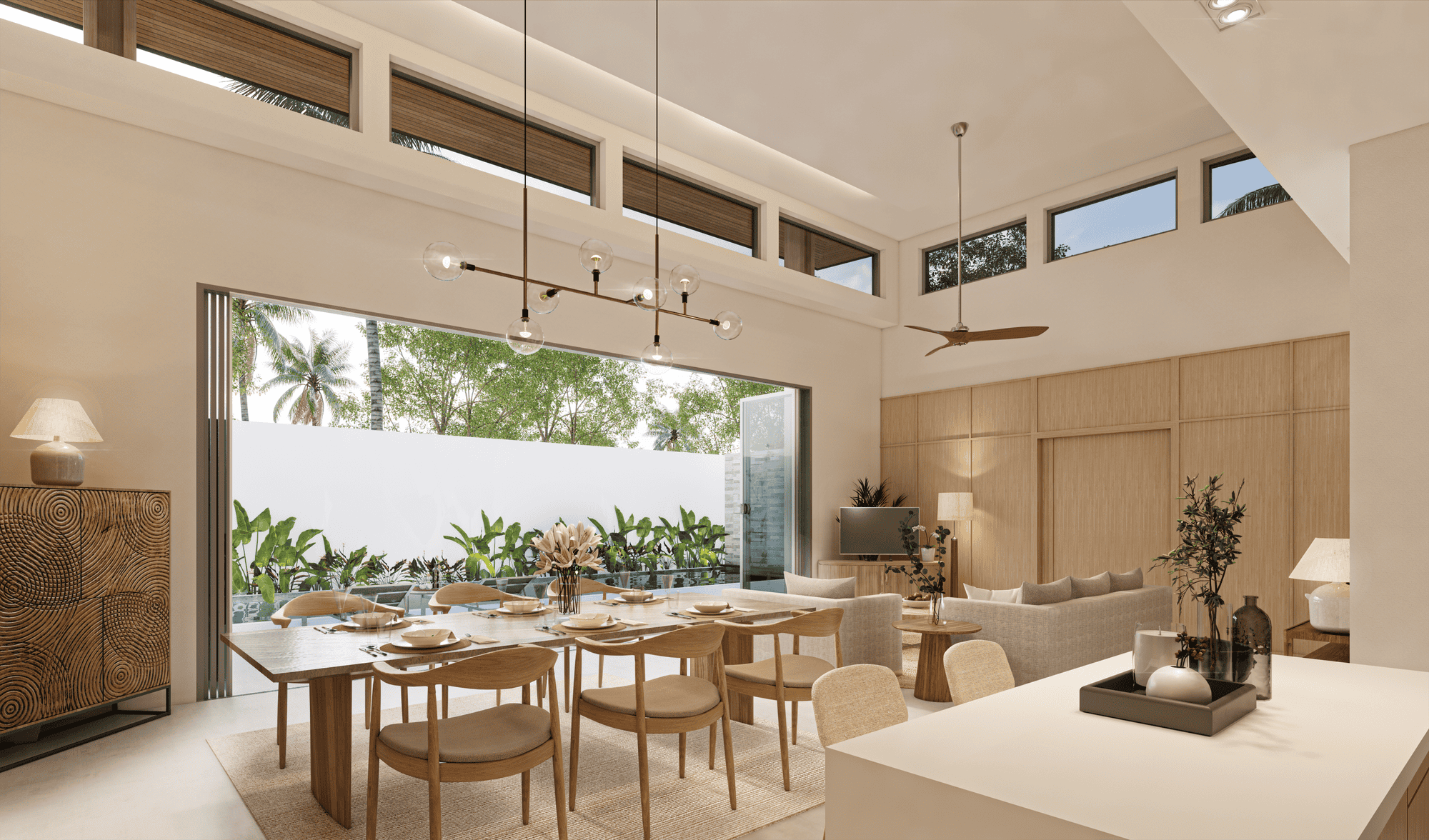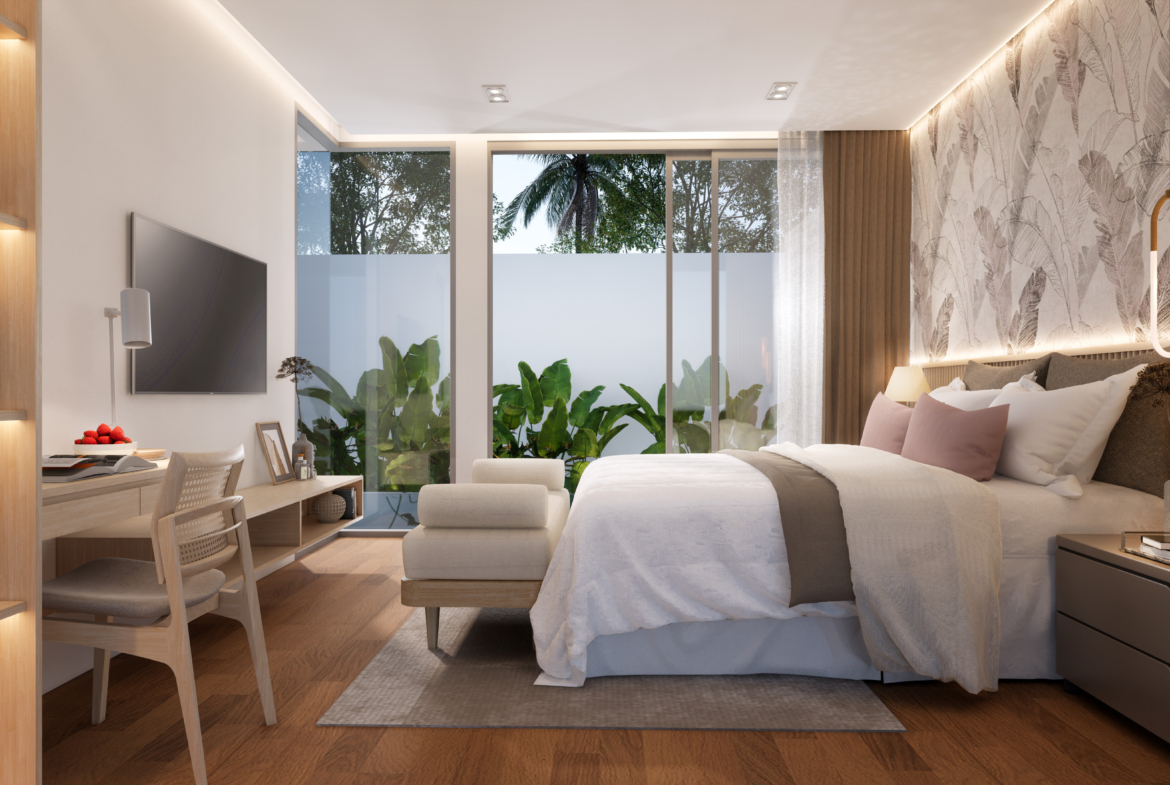 The design of each villa is stylishly simple, featuring either 3 or 4 bedrooms, all of which come with their own ensuite bathrooms. The master bedroom stands out with a walk-through closet and its larger bathroom which includes a separate bathtub and shower. At the heart of these villas, you’ll find a well-lit open-plan living and dining area with high ceilings, as well as a western-style kitchen complete with an island or breakfast bar.