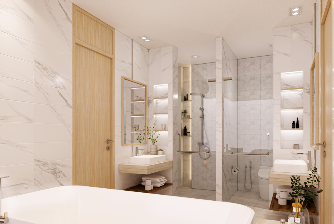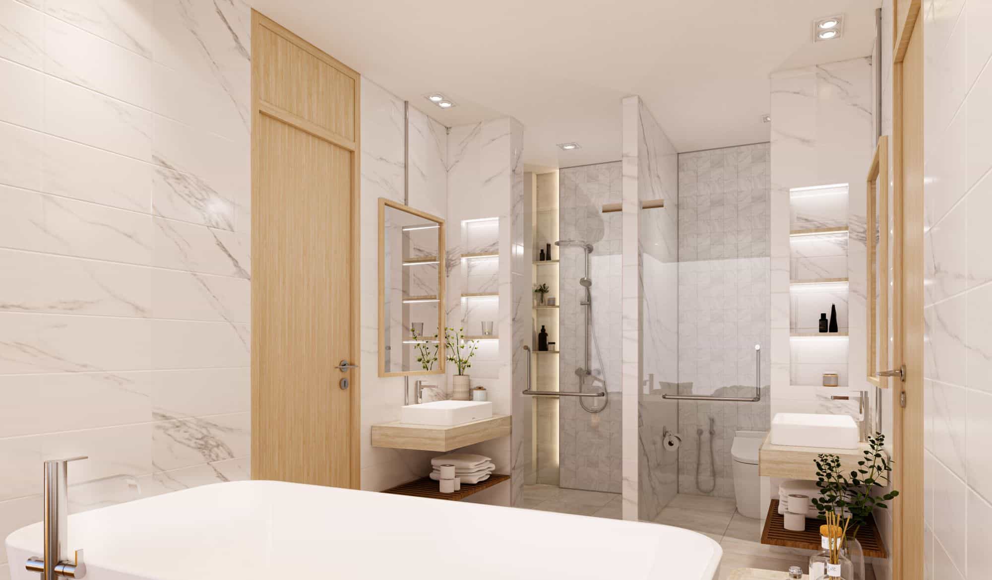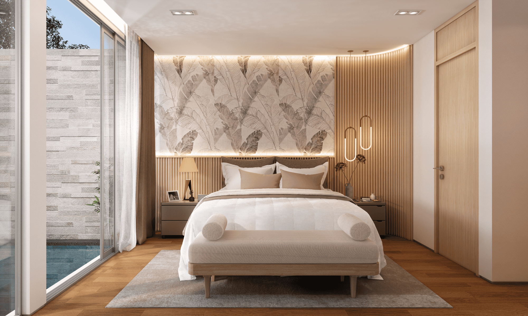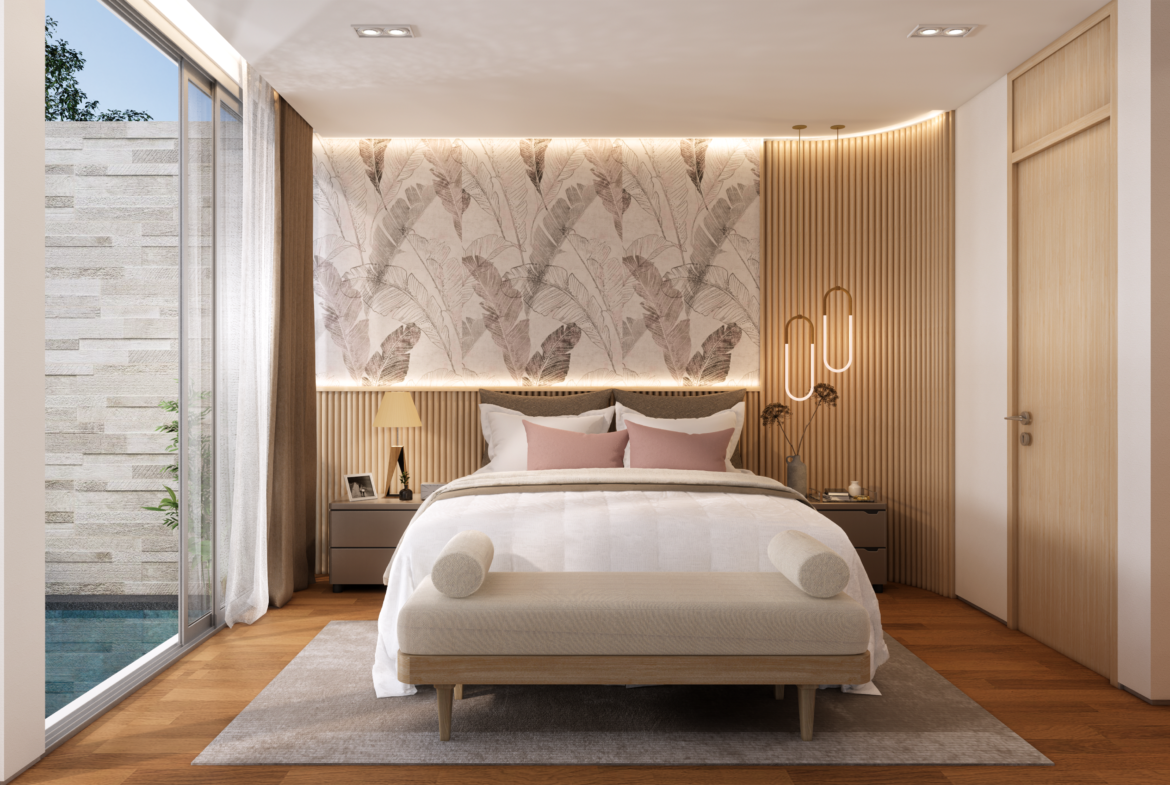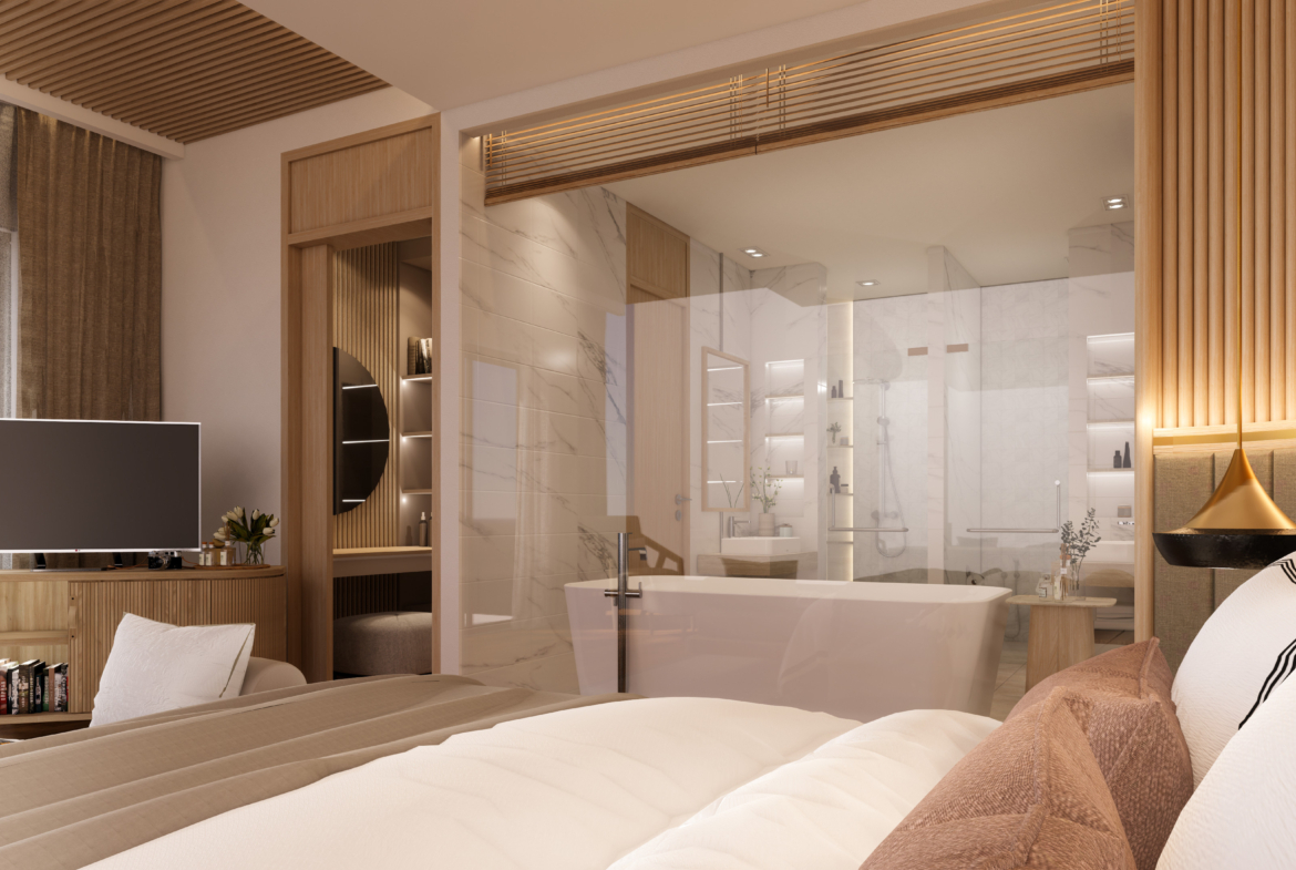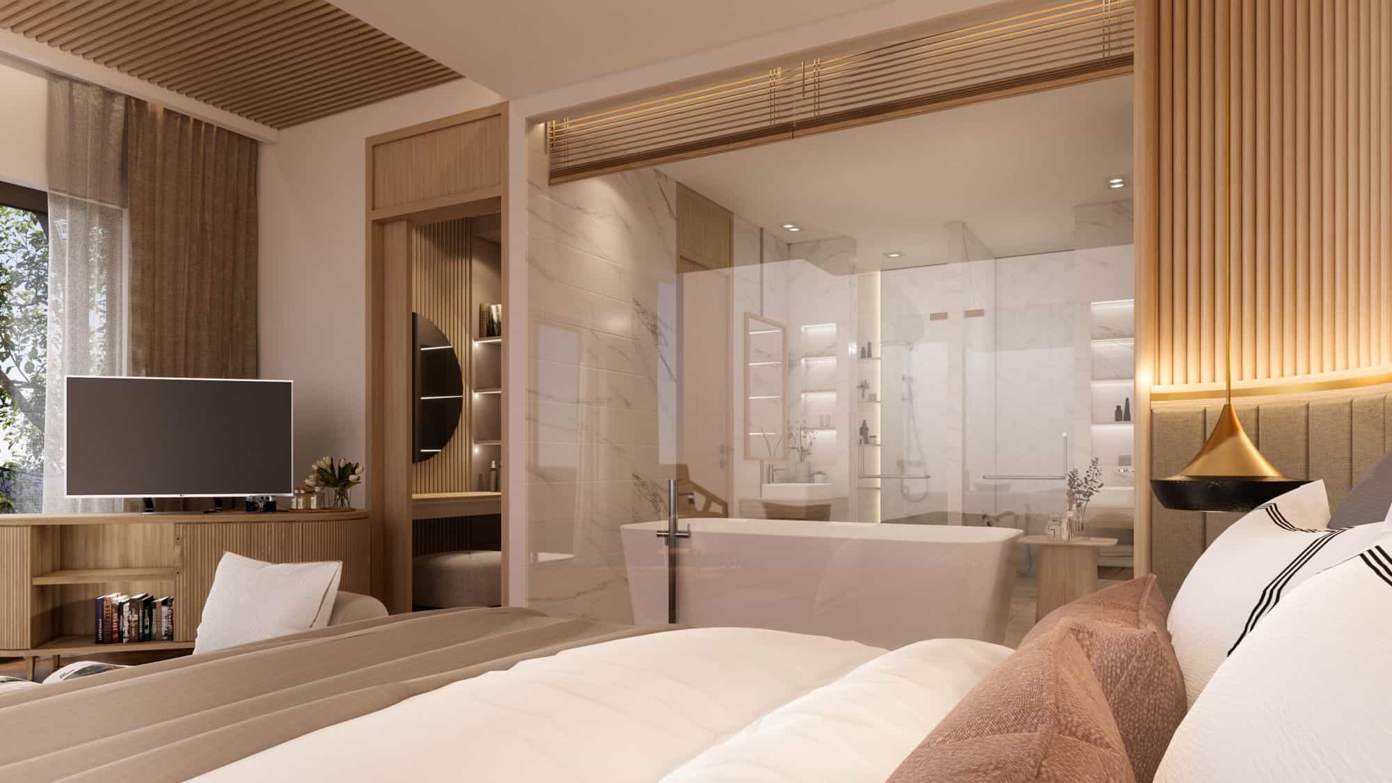 The design of each villa is stylishly simple, featuring either 3 or 4 bedrooms, all of which come with their own ensuite bathrooms. The master bedroom stands out with a walk-through closet and its larger bathroom which includes a separate bathtub and shower. At the heart of these villas, you’ll find a well-lit open-plan living and dining area with high ceilings, as well as a western-style kitchen complete with an island or breakfast bar.