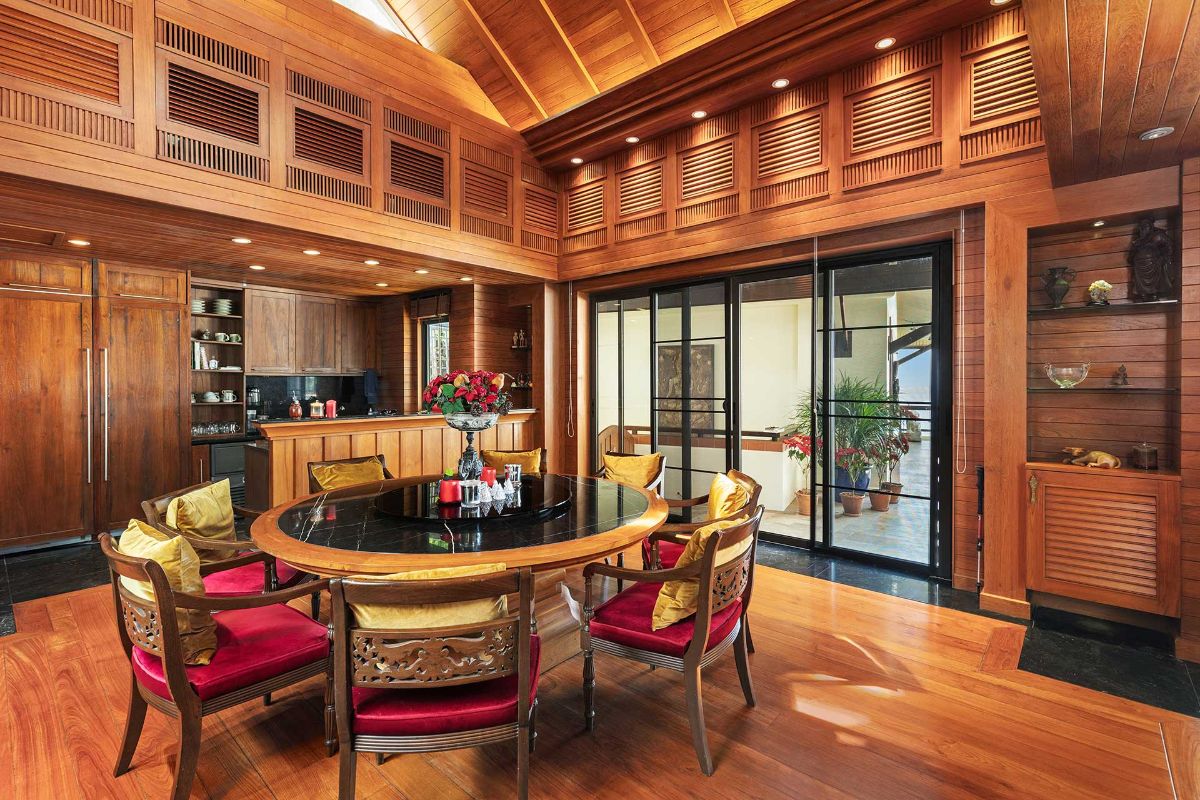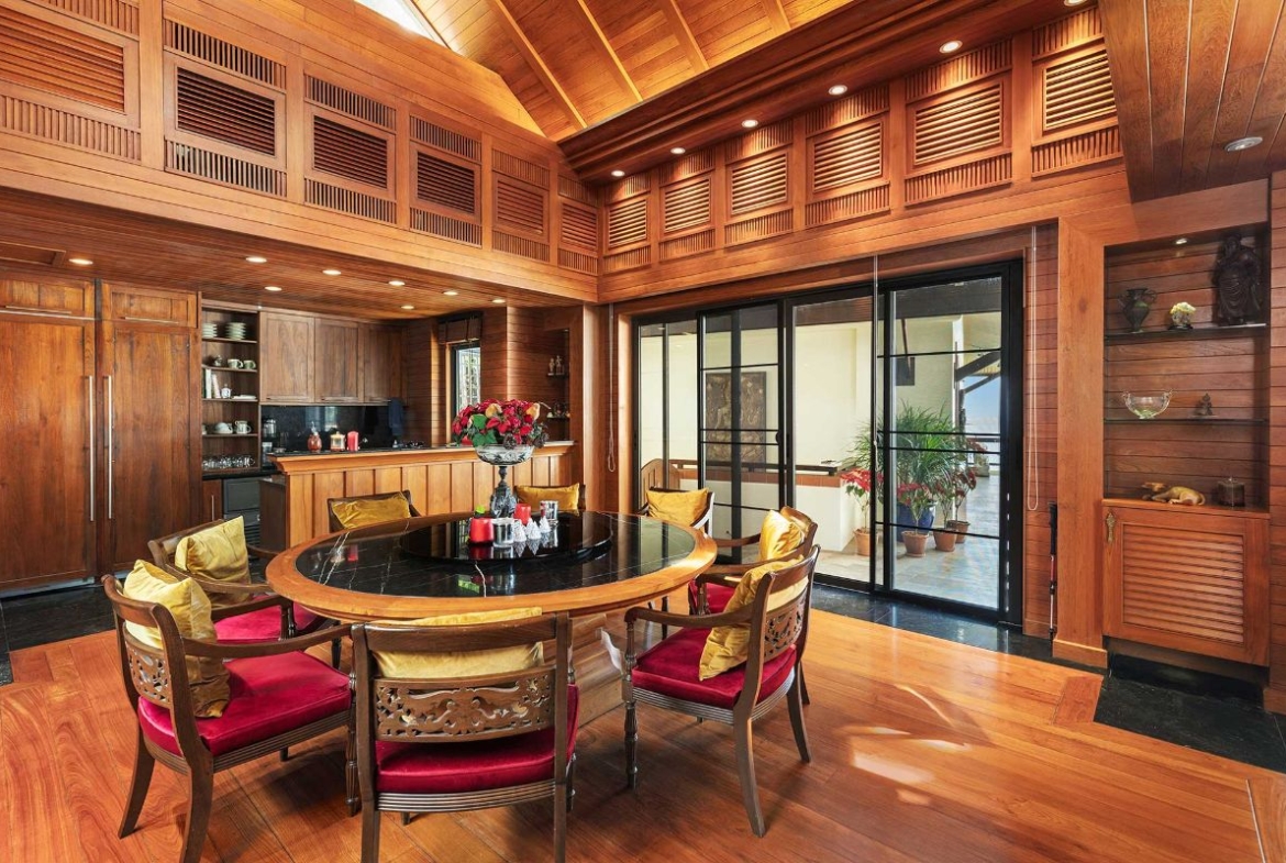 The spacious dining room has a 10-seat marble top and wooden trim dining table and upholstered velvet chair seats with wooden frames. Past this room, is the marble foyer with beautiful wooden panels painted by a famous Thai artist which connects to the living room. Looking out dining room glass doors toward the wood decking and the entrance pond adorned with water plants and mini waterfall.