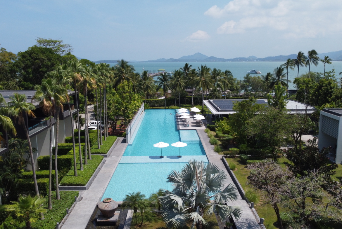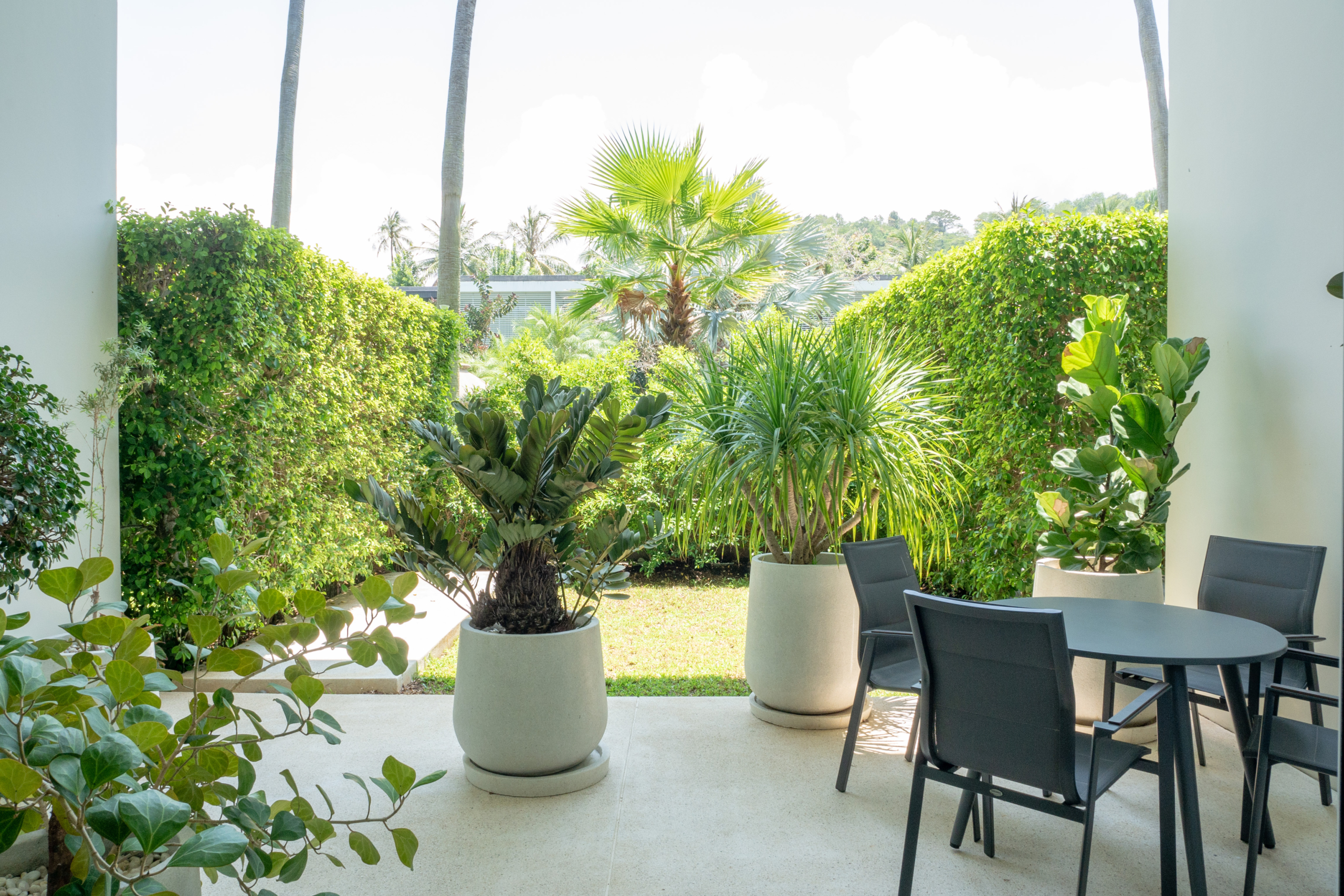 Contemporary and modern, spacious, duplex foreign freehold condo for sale at Baan Yamu, offering 2 bedrooms upstairs that share 1 large bathroom with dual access from the bedrooms. The master bedroom boasts tranquil views overlooking the lush gardens, feature pool, and surrounding hills.