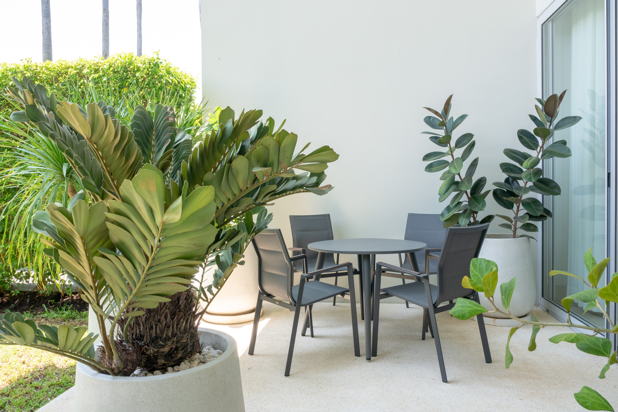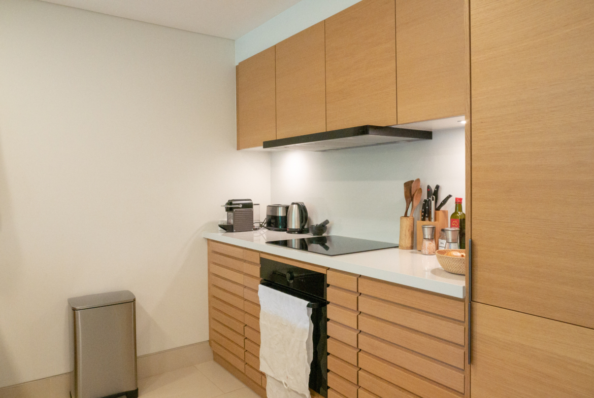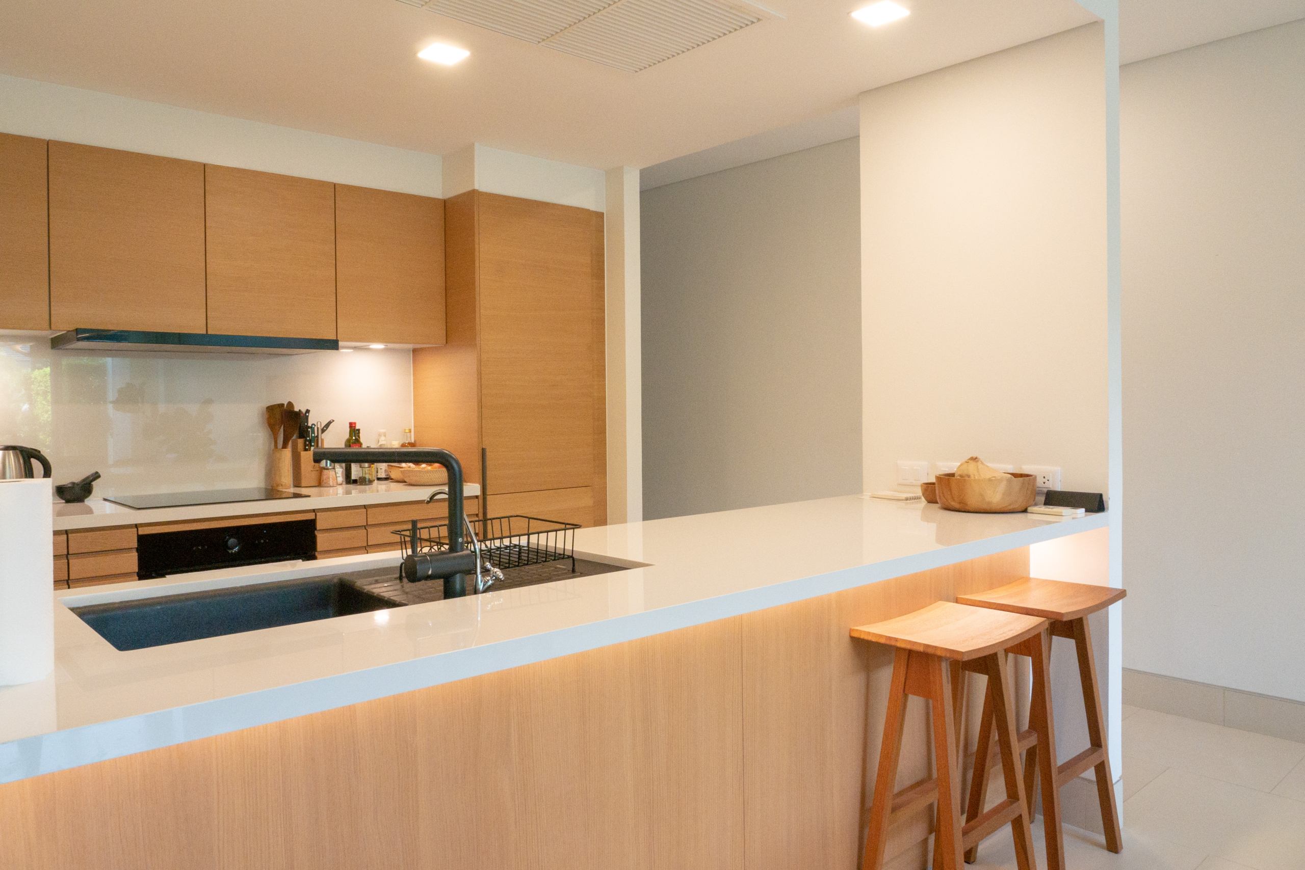 Step into the property and you’ll find the open plan kitchen, dining and living room with loft style high ceiling which opens onto the garden, enjoy dining outside in the comfort of your own private terrace perfect for hosting BBQs and al fresco meals. Recently renovated in 2023, this condo boasts a brand new full western kitchen from renowned brand Kulk with sleek oak cabinets and a filtered drinking water system. It also features high-end appliances such as an electric stove top, oven, built-in microwave, and fridge freezer. The condo has also been upgraded with new built-in wood closets and cabinets, and all lighting has been changed to energy-efficient LED lights.