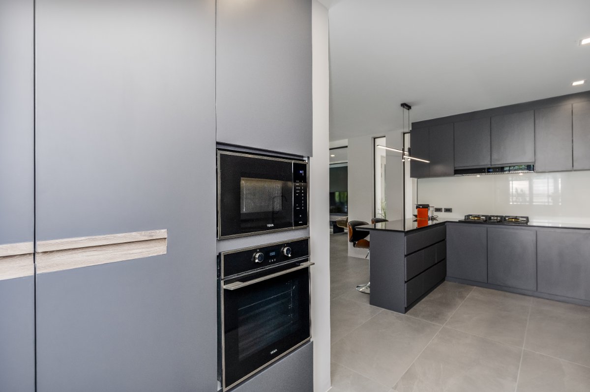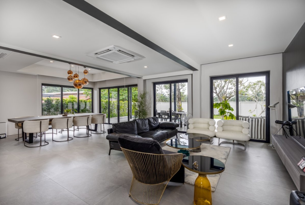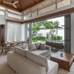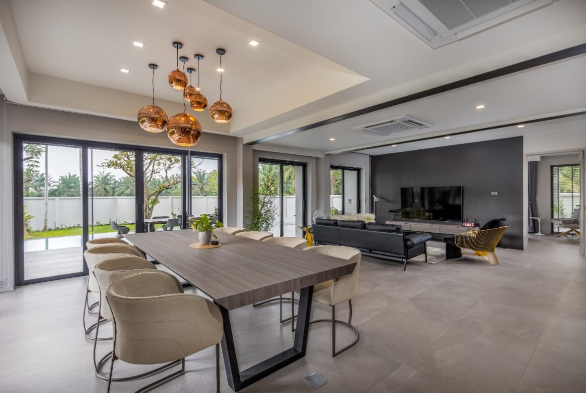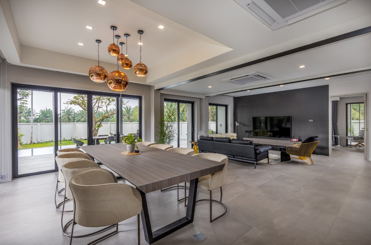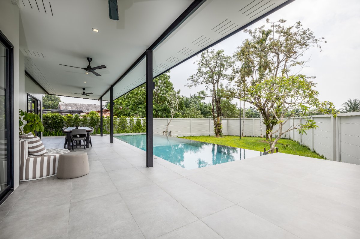 This modern villa for sale in Phuket is designed for seamless indoor-outdoor living. The open-plan living and dining area connects directly to the 12-meter saltwater pool and a 60 sqm covered terrace, ideal for alfresco dining, lounging, and entertaining.