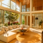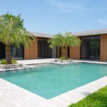 The open plan living opens fully onto the pool terrace through full-length glass and features vaulted redwood ceilings with fans, here and throughout the property. The full Western kitchen is designer-perfect, with grey marble tops and redwood cabinetry punctuated by a generous stainless fridge and sleek built-in appliances. The dining area sits adjacent. The lounge has a wall-mounted TV.