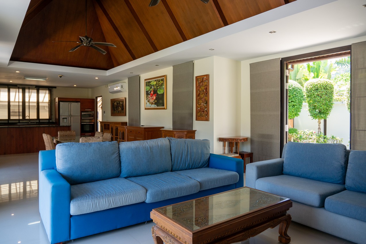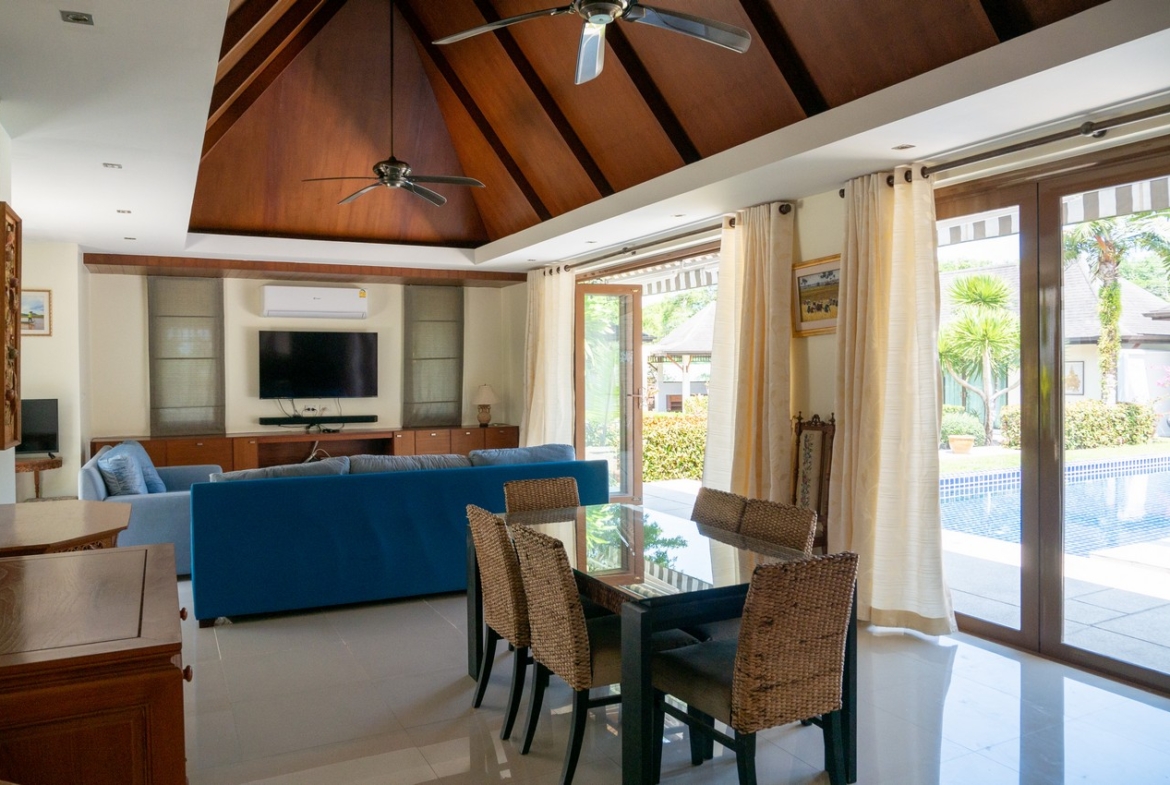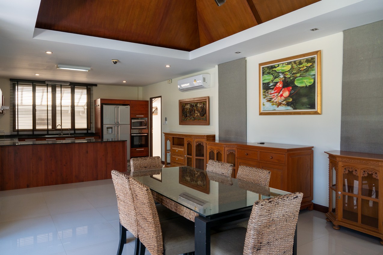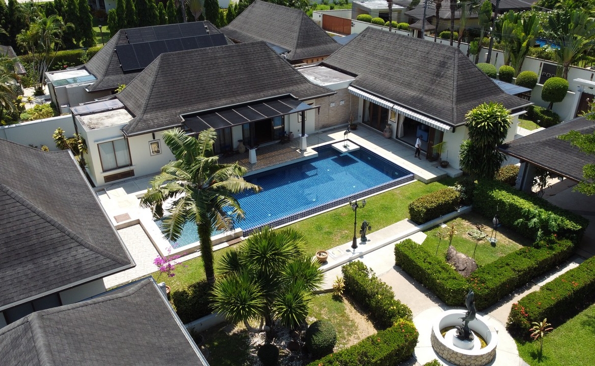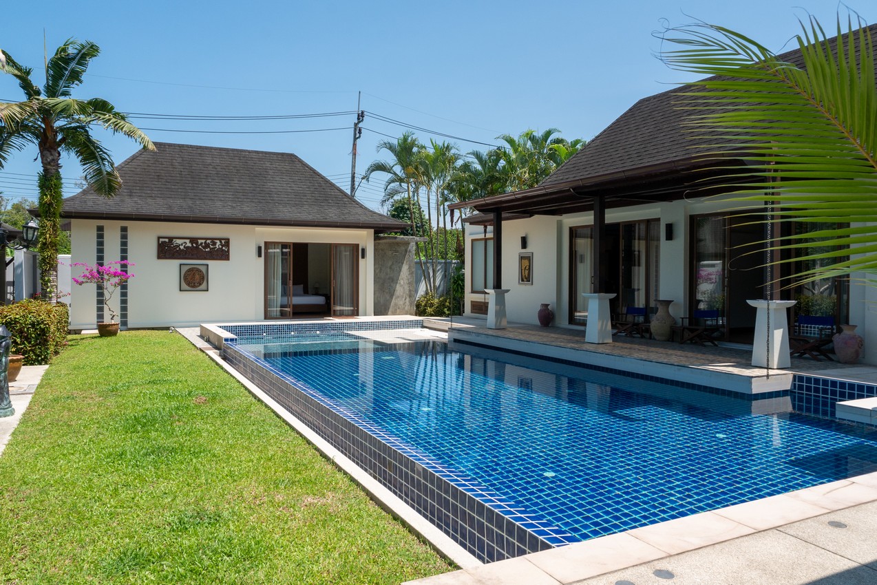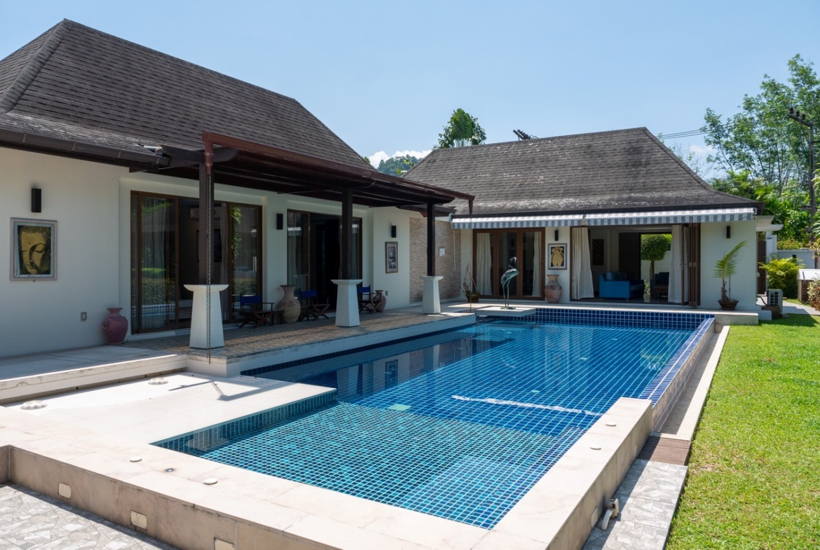 This well-built four-bedroom pool villa is very private, sitting on a quiet street with no through traffic and few other neighbors. The grounds are stunning, with a lush garden and pool terrace at the centre of a pavilion-style layout. It is close to the airport, golfing, yachting, and Phuket’s best international schools. The area is home to a number of high-end residences and yet still retains a relaxed charm.