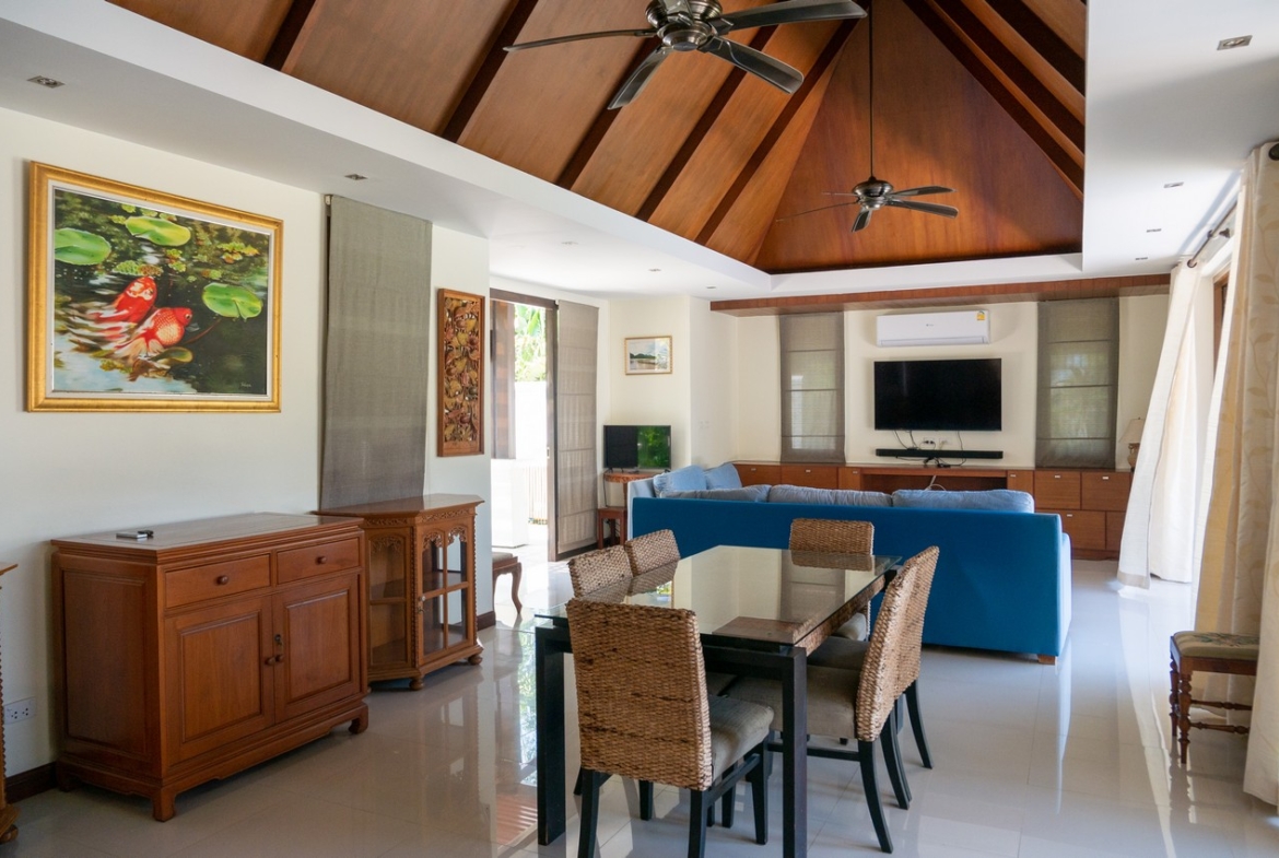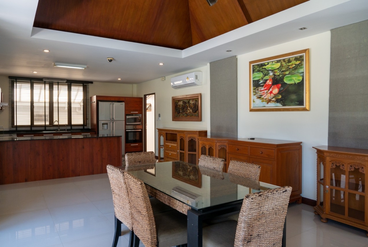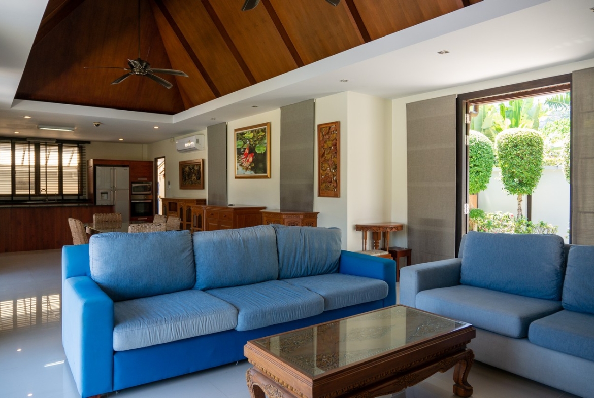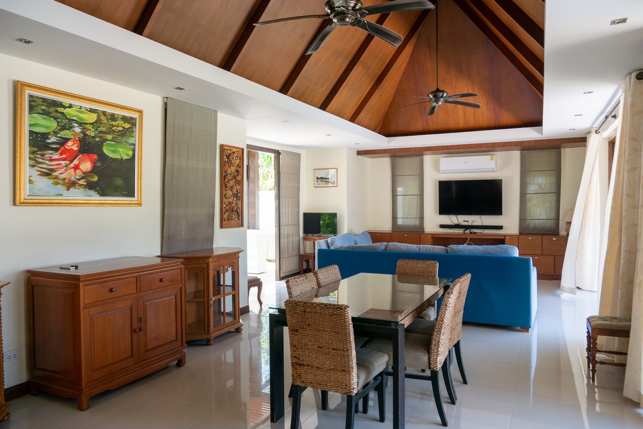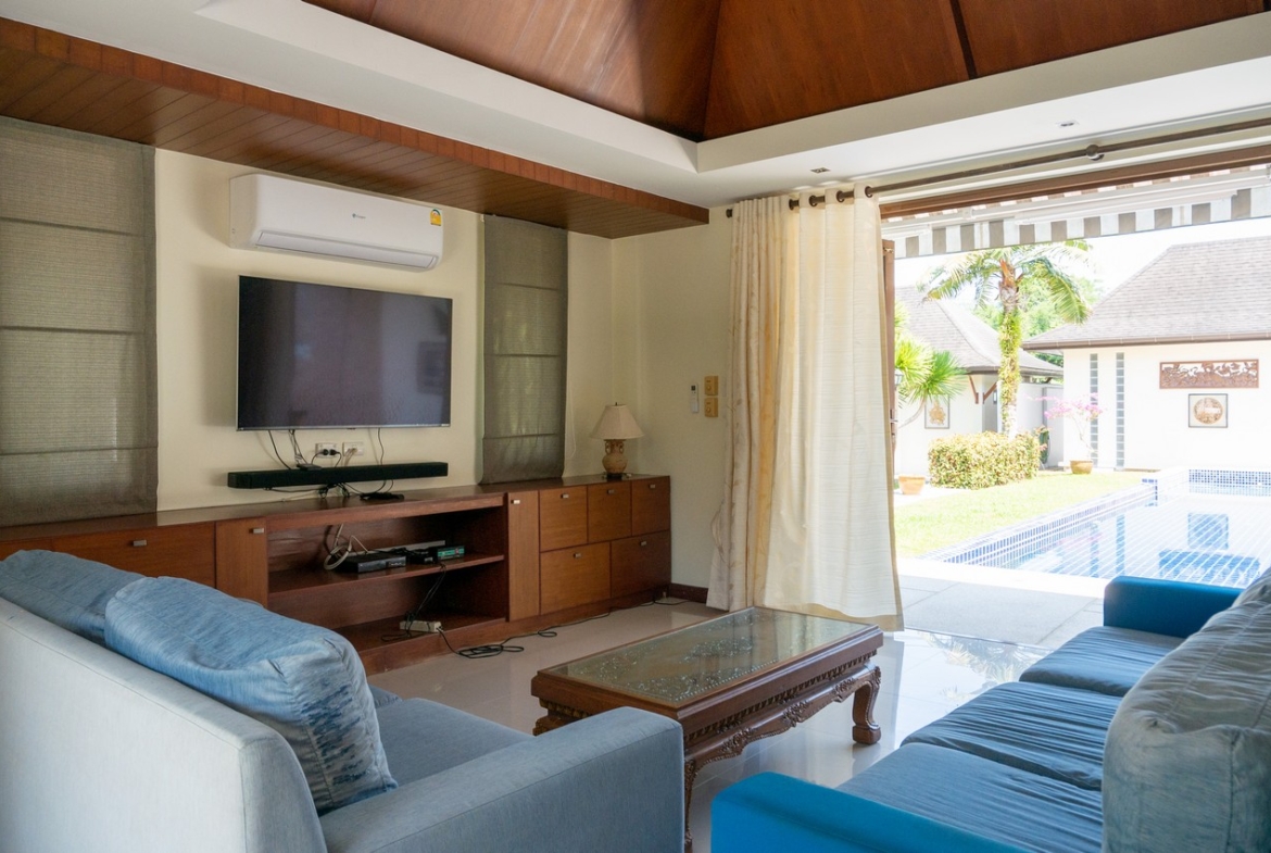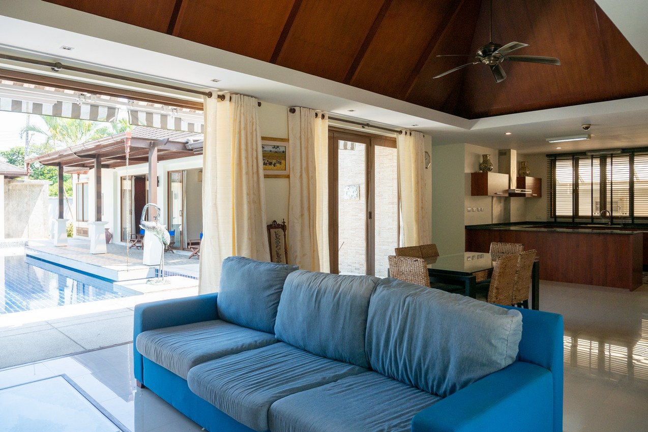 This well-built four-bedroom pool villa is very private, sitting on a quiet street with no through traffic and few other neighbors. The grounds are stunning, with a lush garden and pool terrace at the centre of a pavilion-style layout. It is close to the airport, golfing, yachting, and Phuket’s best international schools. The area is home to a number of high-end residences and yet still retains a relaxed charm.
