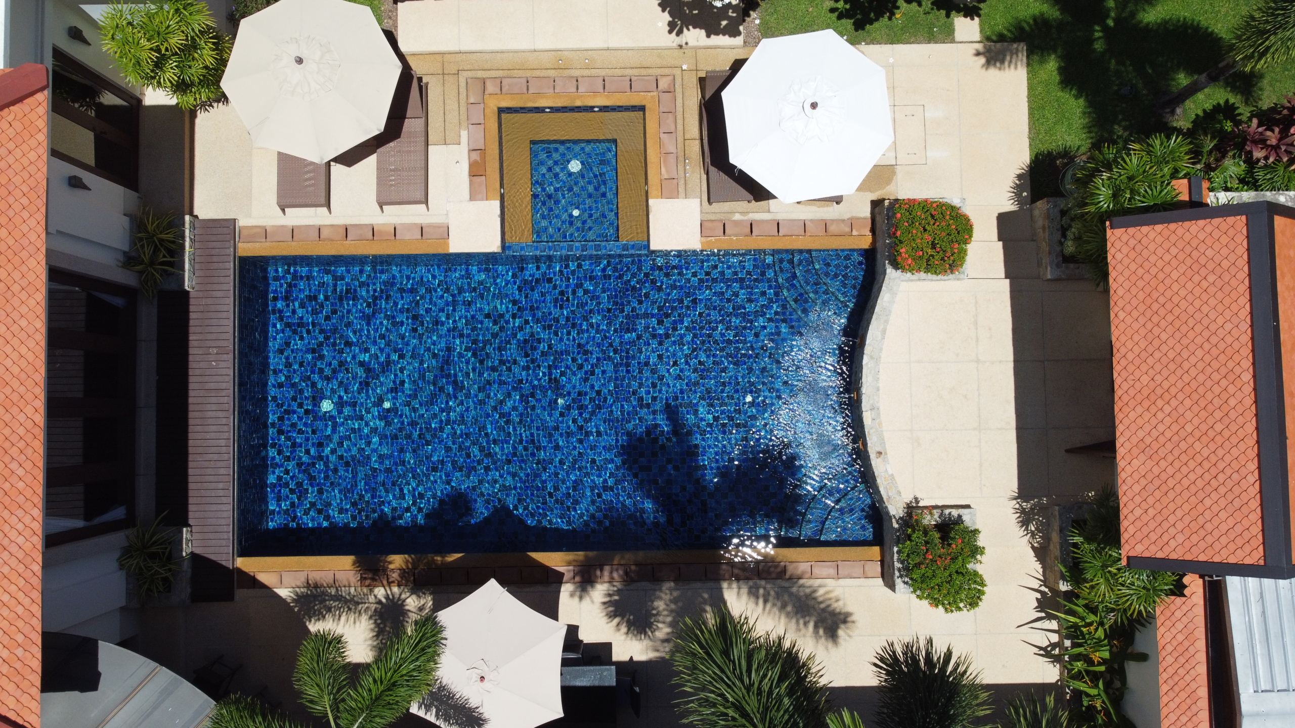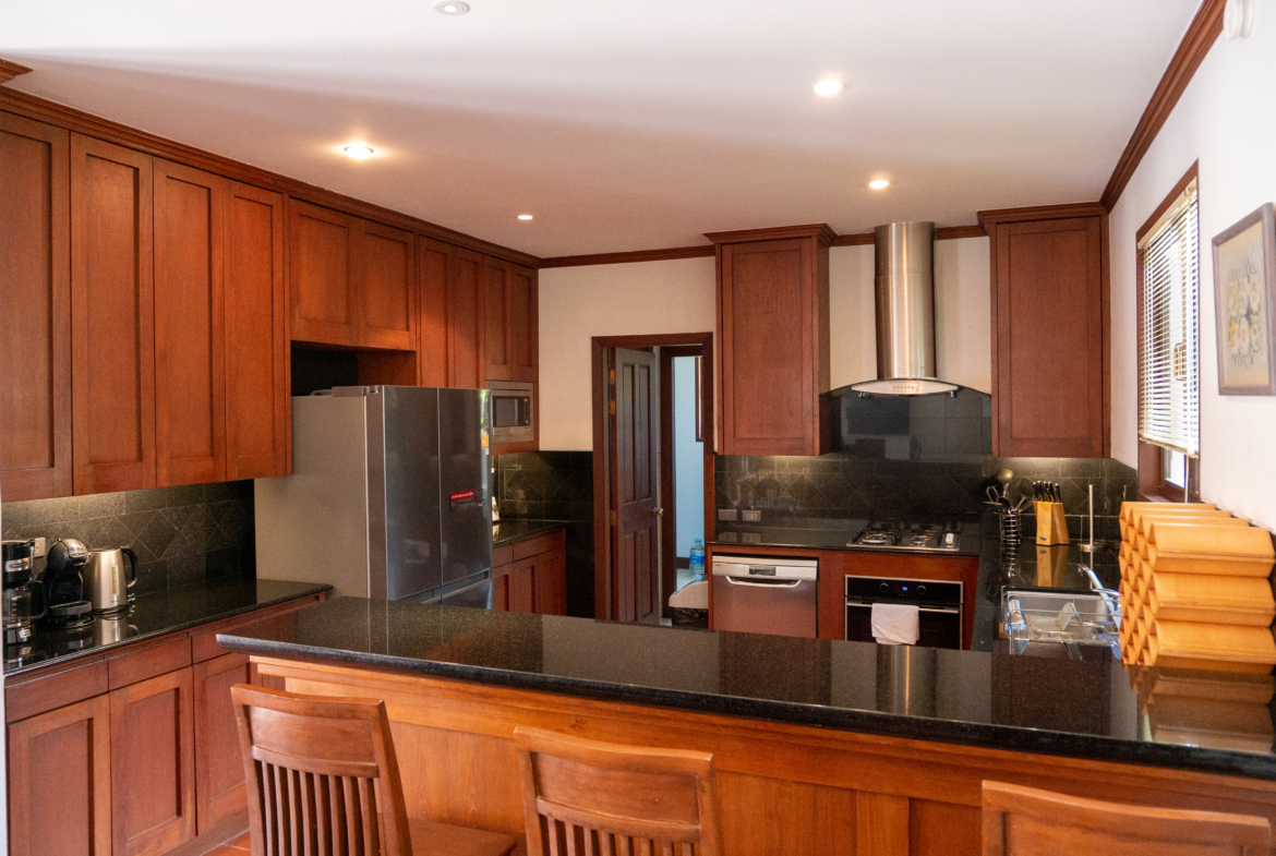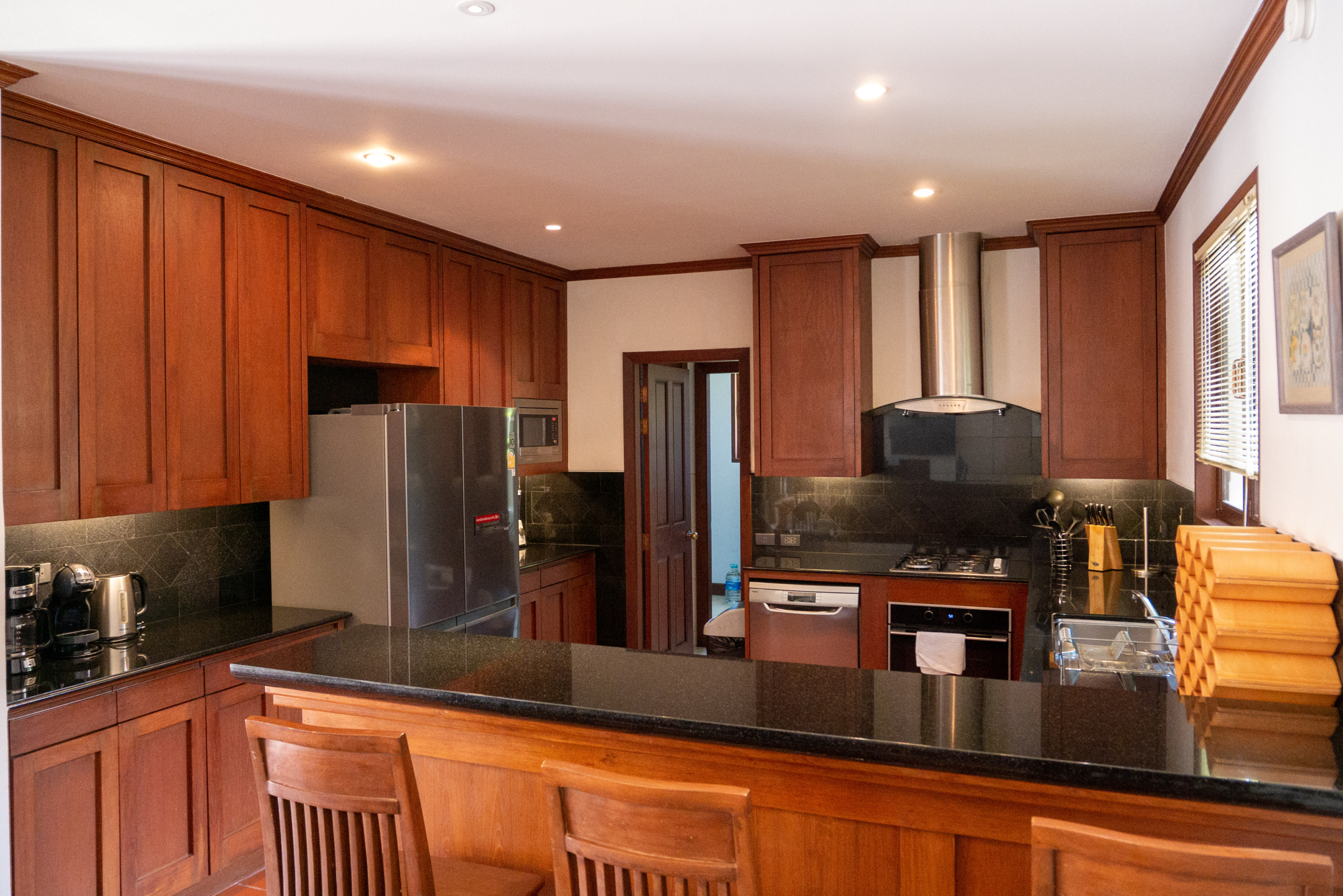 - Open-plan living: The villa’s open-plan design seamlessly connects the kitchen, dining, and living areas, all of which open onto the pool. The living room boasts a high vaulted cathedral-style ceiling and solid wood floors, providing a bright and inviting space unique to Sai Taan Villas.