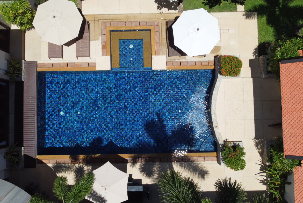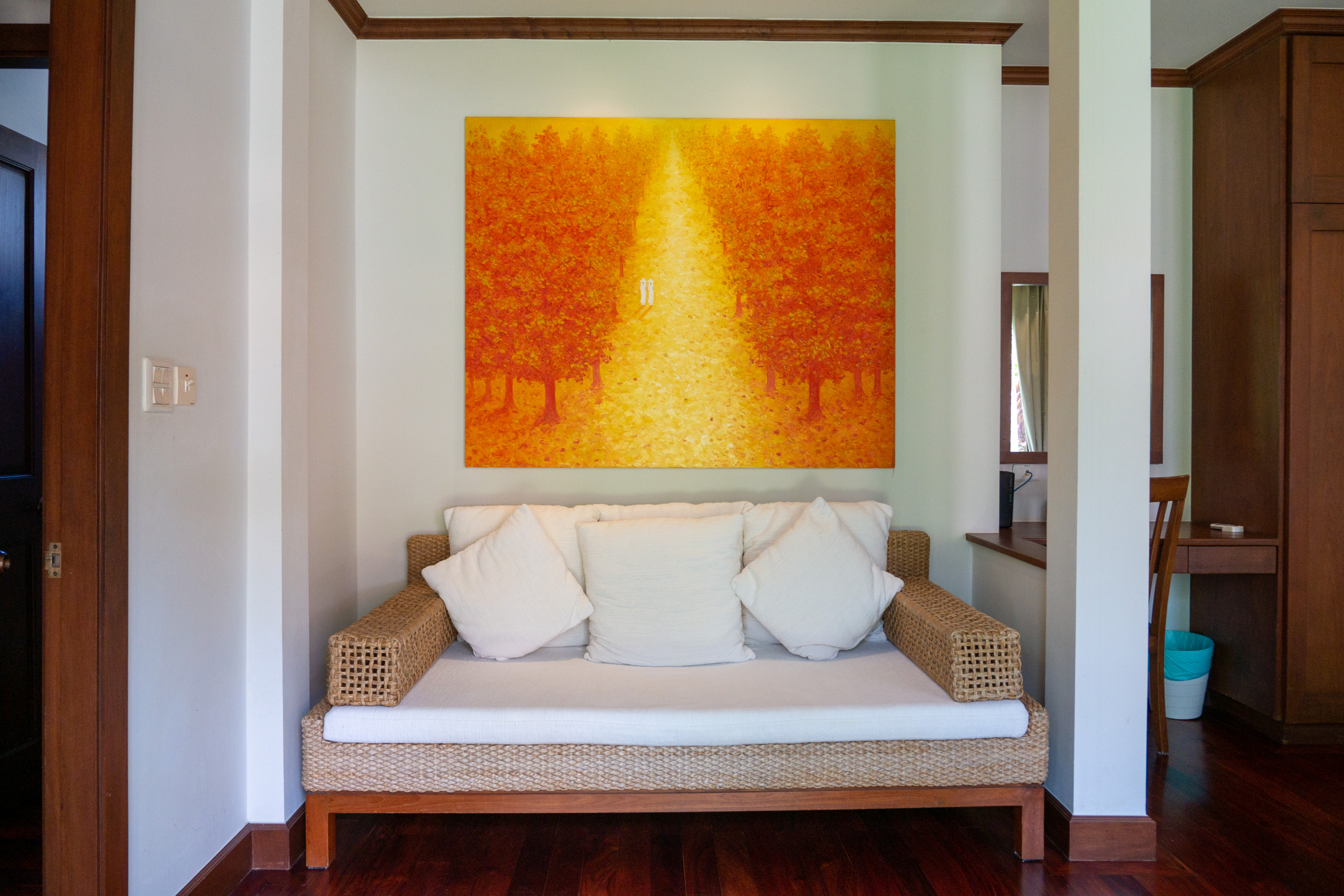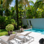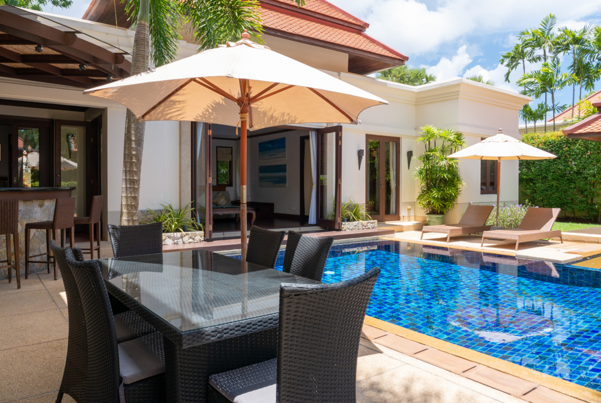- Open-plan living: The villa’s open-plan design seamlessly connects the kitchen, dining, and living areas, all of which open onto the pool. The living room boasts a high vaulted cathedral-style ceiling and solid wood floors, providing a bright and inviting space unique to Sai Taan Villas.