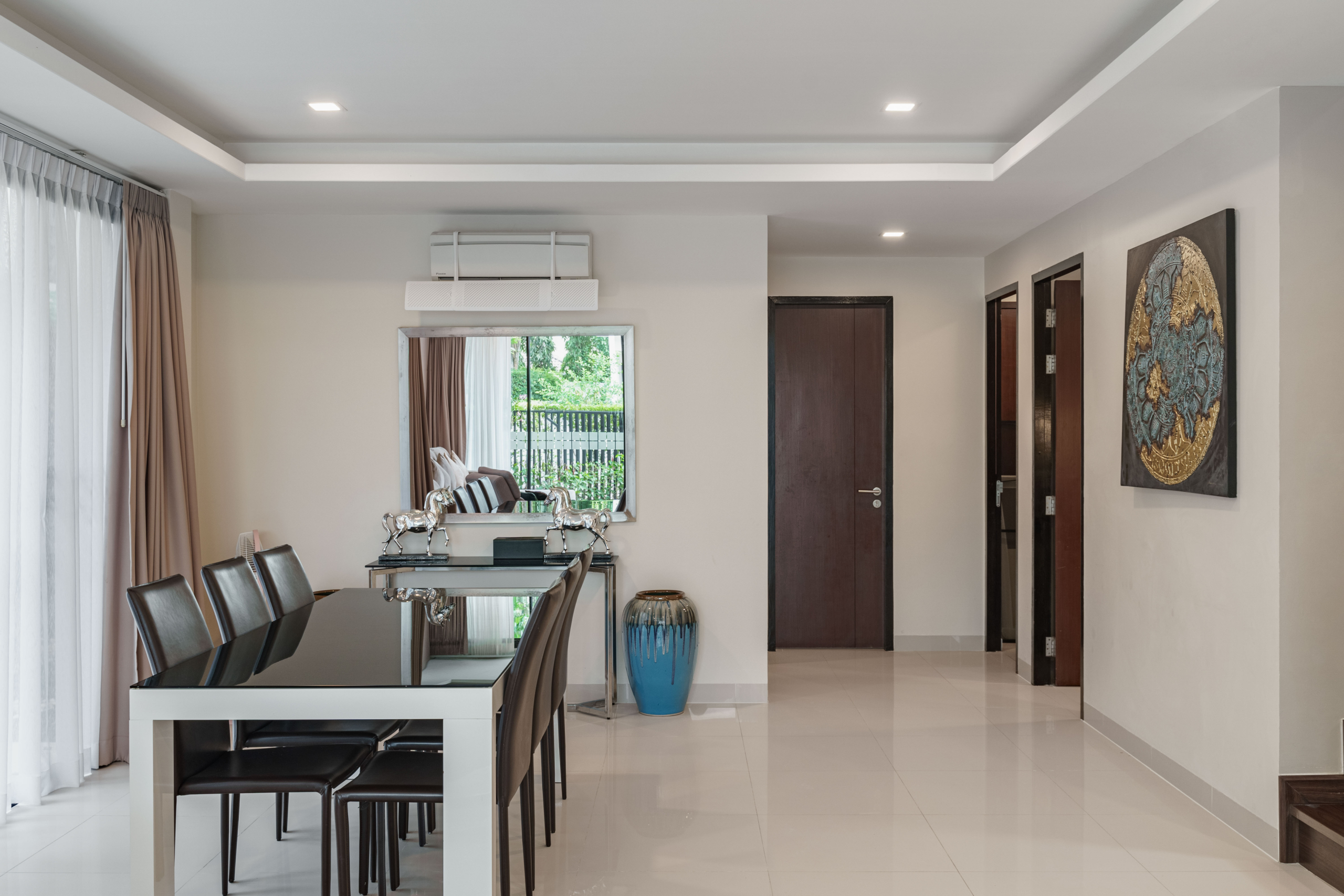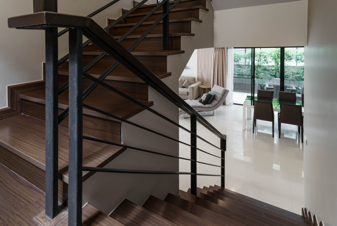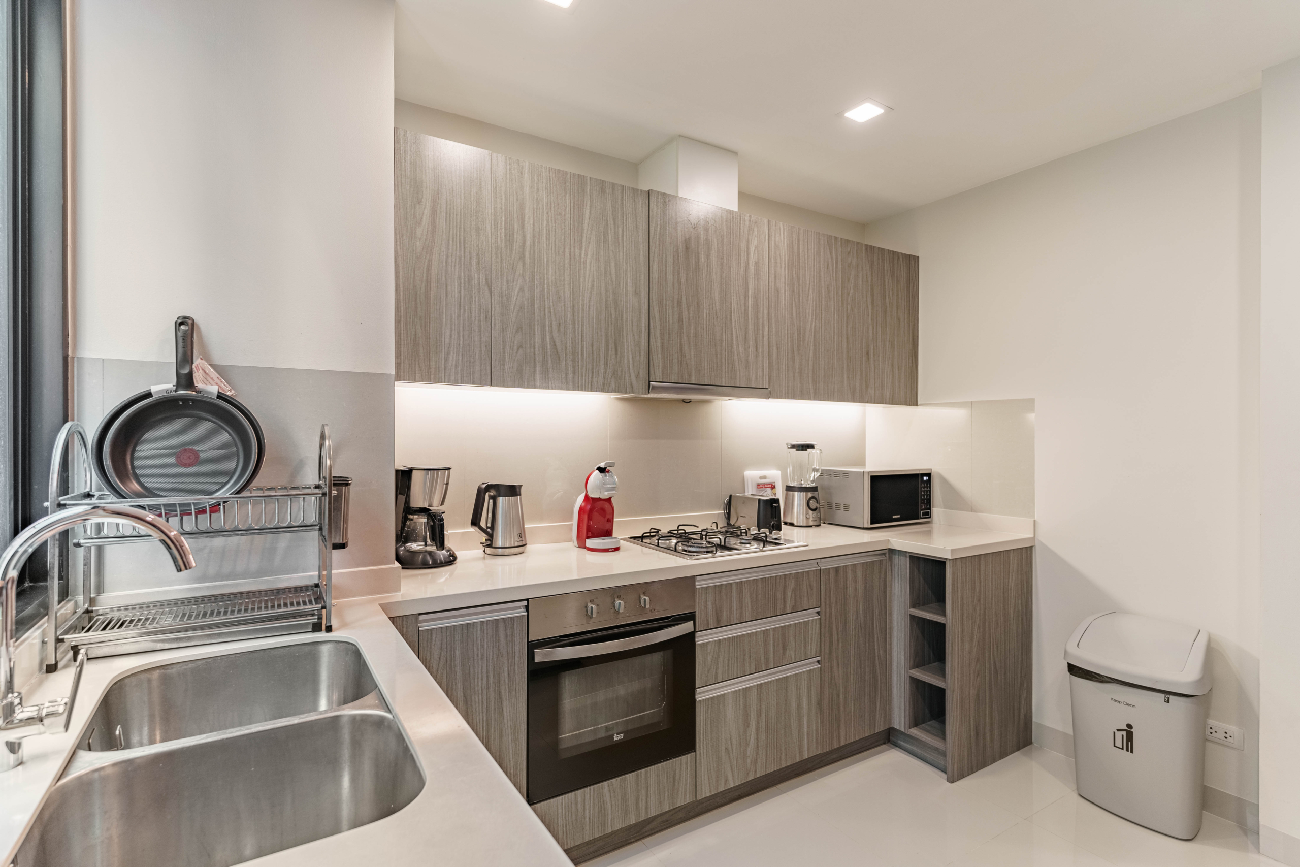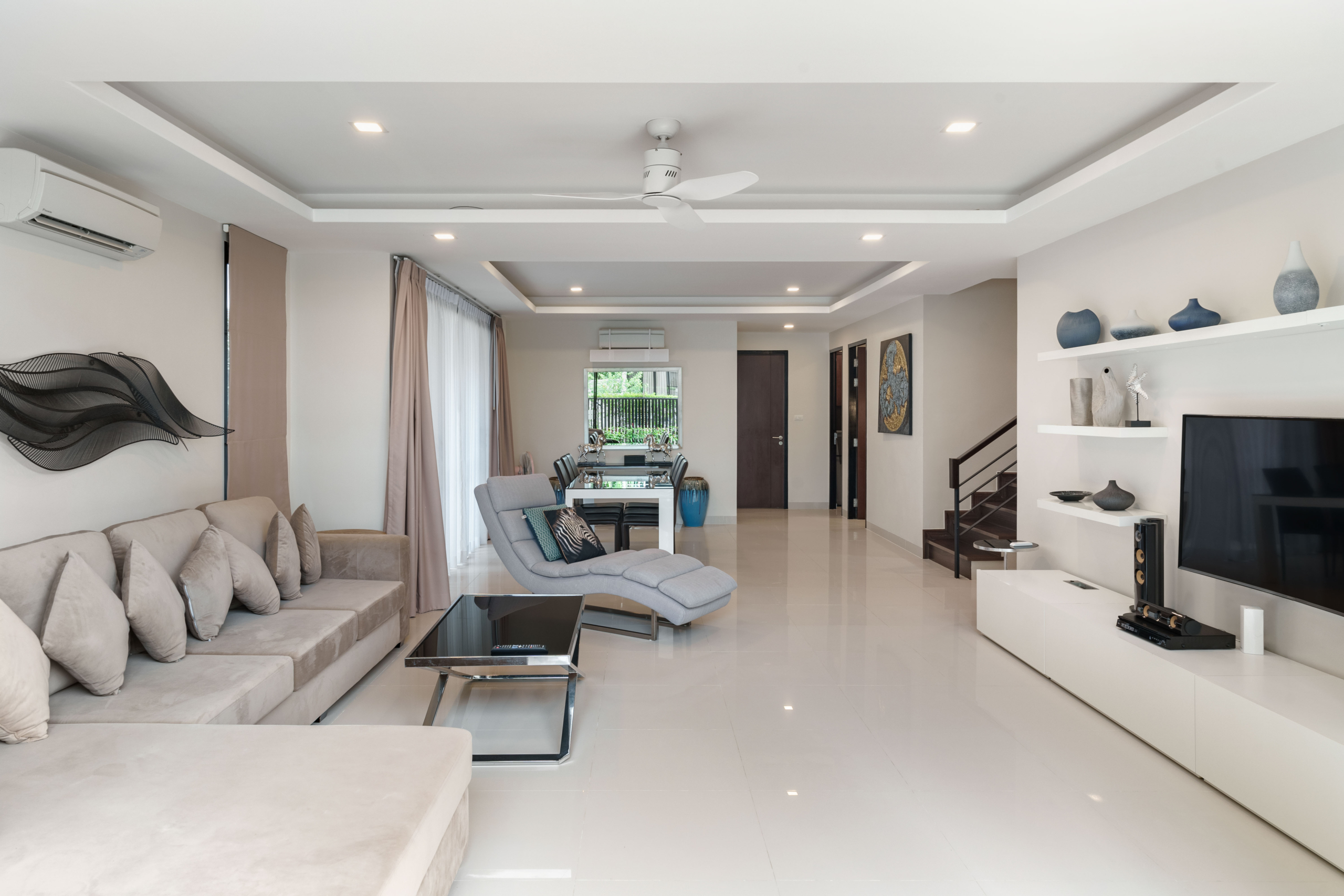 Modern kitchen, open-plan living area, and stylish interiors