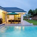 Interiors feature a generous open-plan living and dining area with a fully-equipped kitchen and high vaulted ceilings. Behind the kitchen are a storeroom and a laundry area. All bedrooms come with an ensuite bathroom, with the master bedroom having a larger bathroom with a separate bathtub and shower. The master and second bedrooms enjoy direct access to the pool terrace, swimming pool and garden. These spacious, well designed pool villas are ideal as a holiday home or as a permanent family residence.
