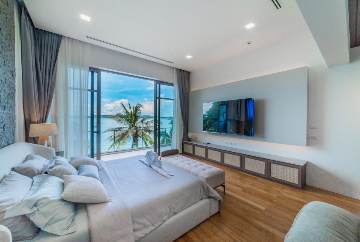 Nestled in a prime beachfront location, this exquisite villa offers direct access to the beach and even features a private mini boat pier, making it ideal for yachting enthusiasts. Expansive floor-to-ceiling glass doors blur the lines between indoor and outdoor living, allowing natural light to flood the interiors while framing unobstructed sea views.