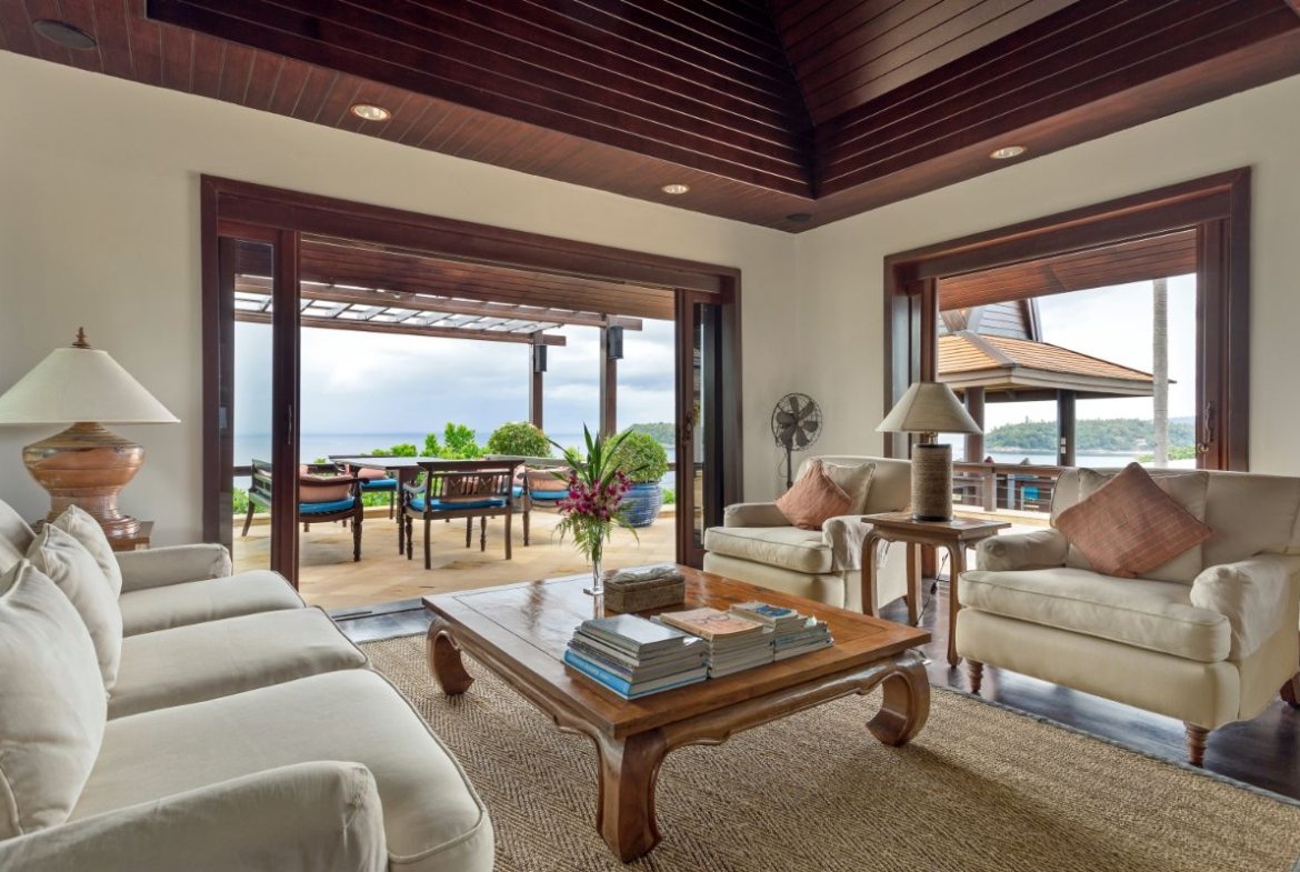 The villa’s separate guest house offers a private retreat with a king-size bed, en-suite bathroom, and a sunken bath overlooking the sea. On the lower floor, three additional bedrooms open to lush tropical gardens where the saltwater infinity-edge pool cascades into smaller pools and a spa pool.