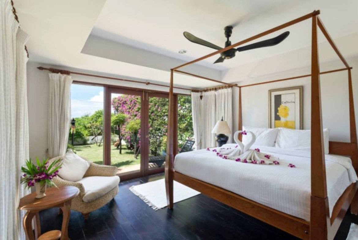 The master suite is a sanctuary of luxury, featuring a king-size four-poster bed adorned with premium linens, a private study, and an expansive en-suite bathroom with a sunken bath. Large windows offer direct views of the infinity pool and the ocean beyond.