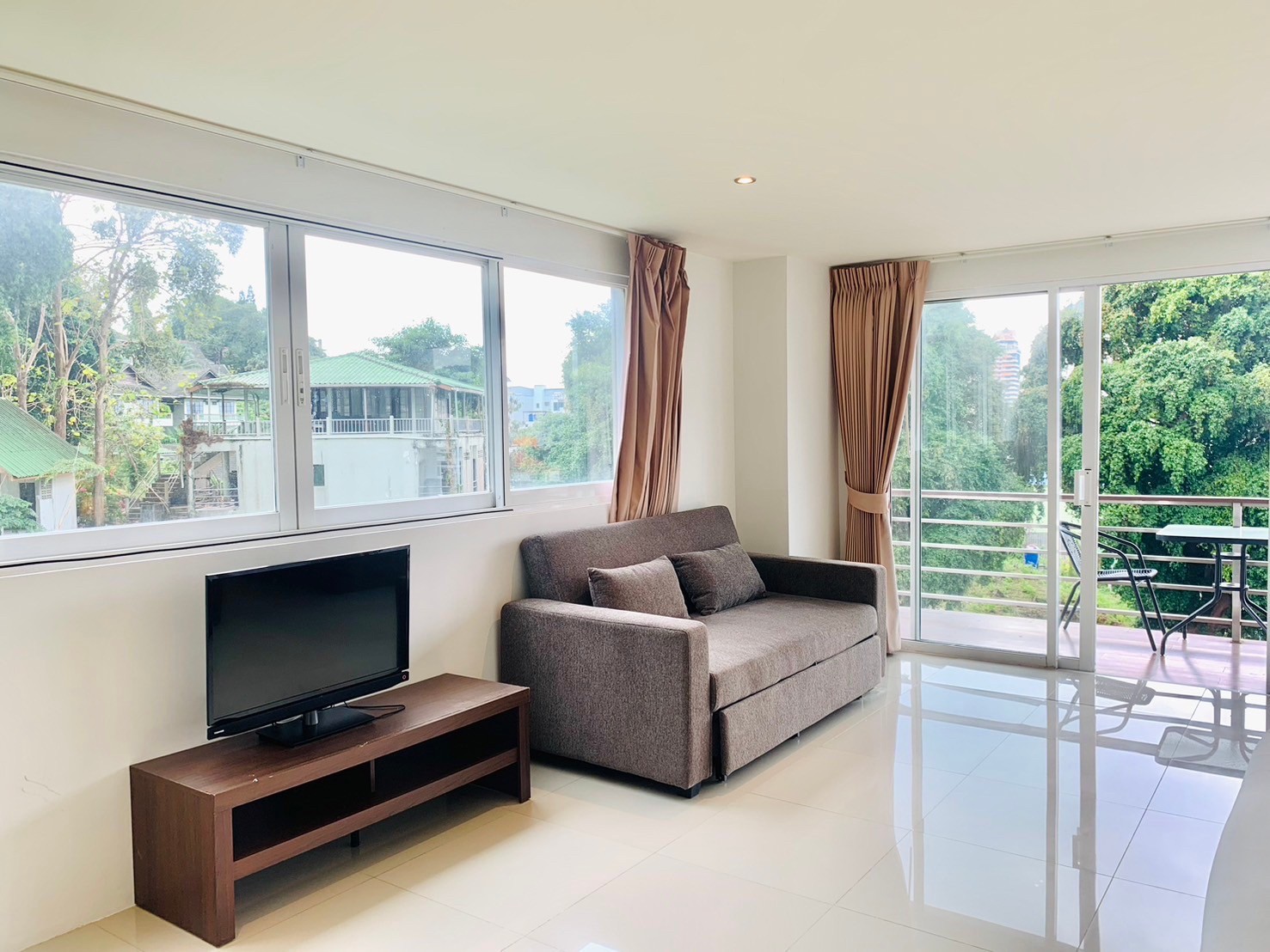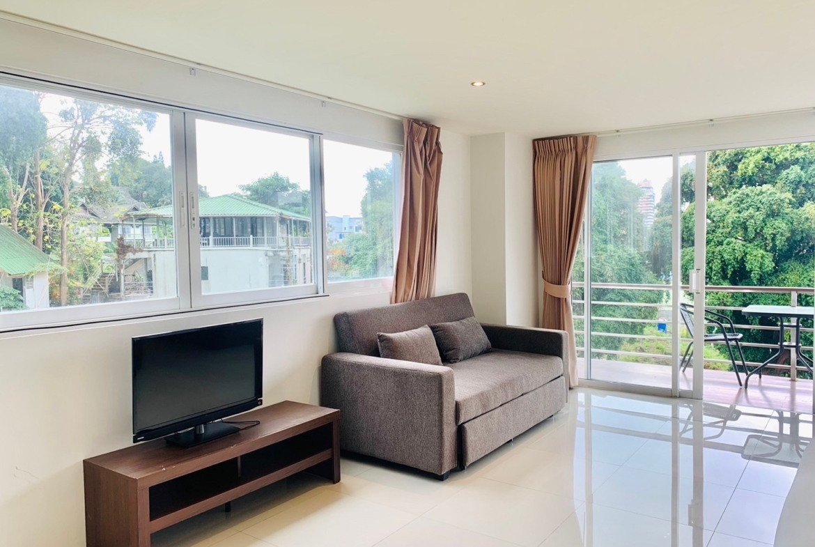 This bright and spacious studio features an open-plan layout, a private balcony with lush garden views, a modern kitchenette, and a contemporary bathroom — creating a relaxing and inviting living space.