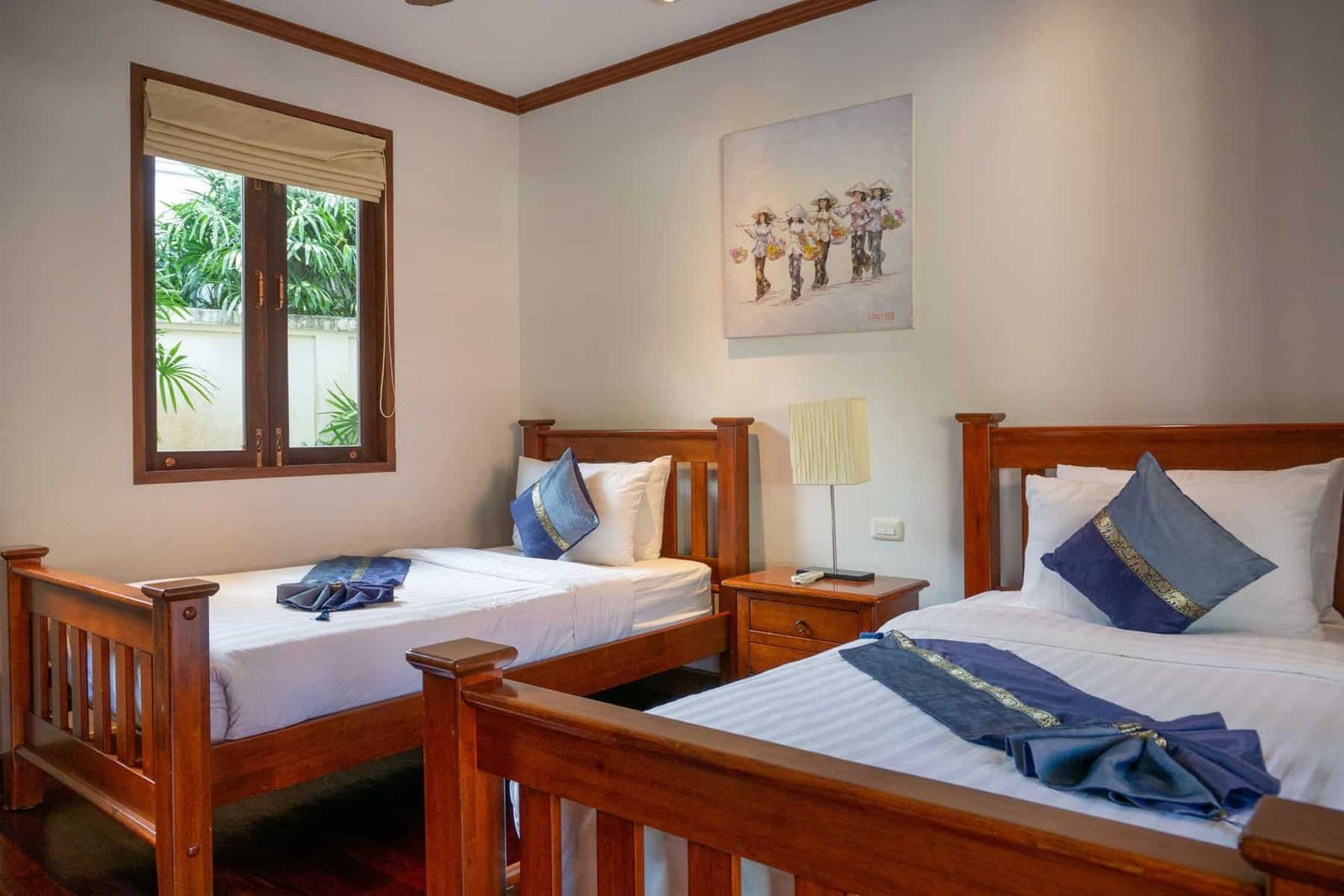 • Open-plan living: The villa’s open-plan design seamlessly connects the kitchen, dining, and living areas, all of which open onto the pool. The living room boasts a high vaulted cathedral-style ceiling and solid wood floors, providing a bright and inviting space unique to Sai Taan Villas.