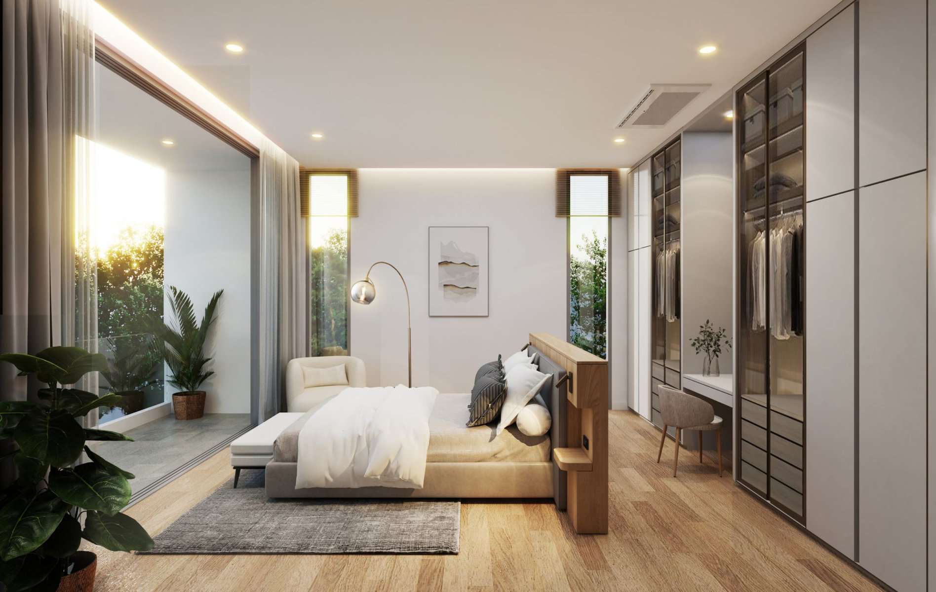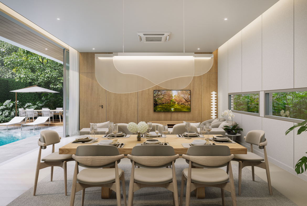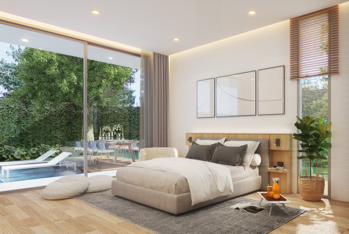 Each of the seven two-storey villas in Bliss Hideaway boasts four bedrooms and five bathrooms, designed with an open, airy layout that maximises natural light. Large windows, floor-to-ceiling glass walls, and high ceilings create a bright and welcoming environment. The interiors feature warm wooden furnishings, complemented by lush greenery and earth-toned décor, enhancing the connection with the tropical landscape.