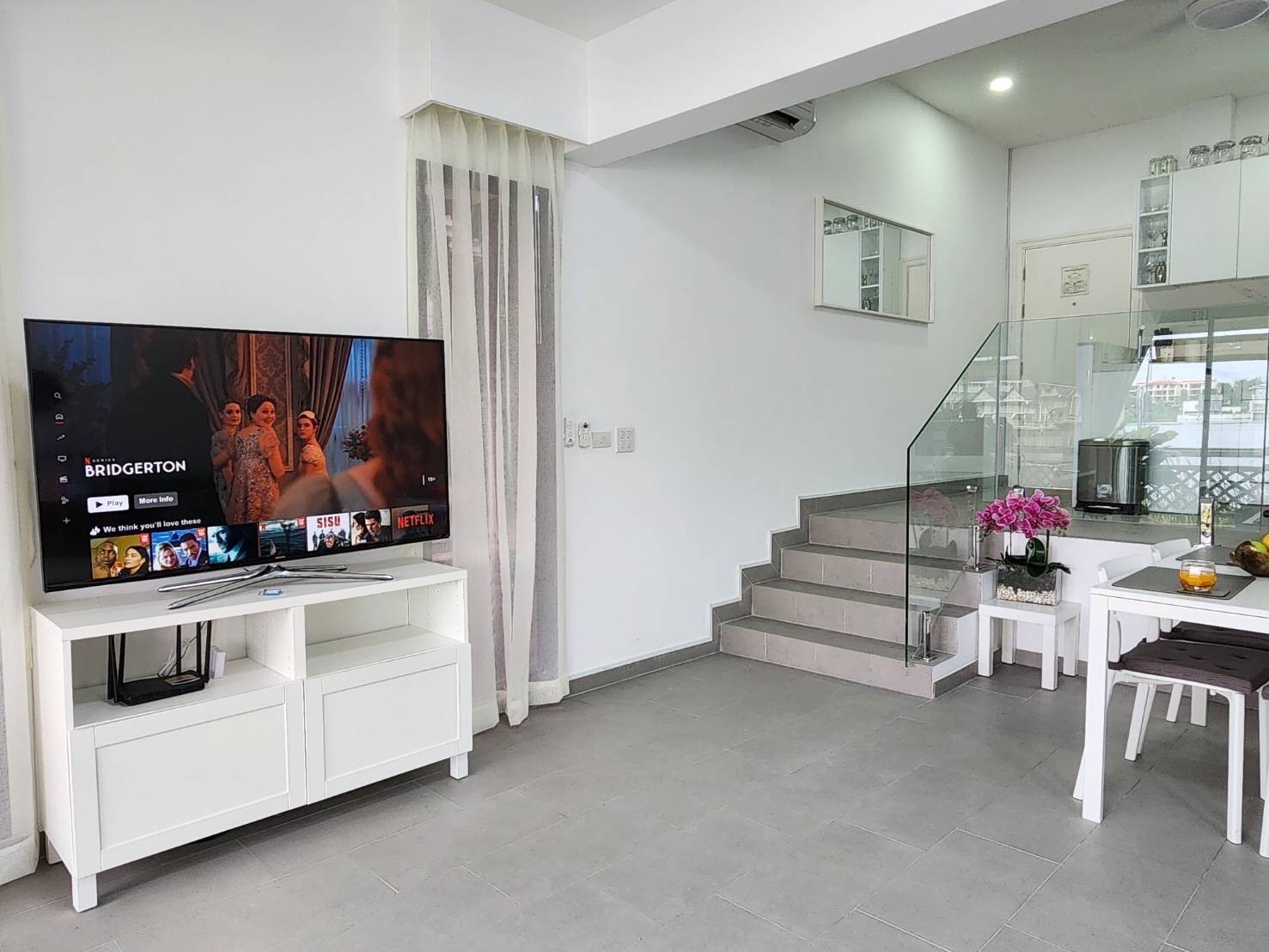 Comfortable living area with sofa bed, smart TV, and USB charging sockets