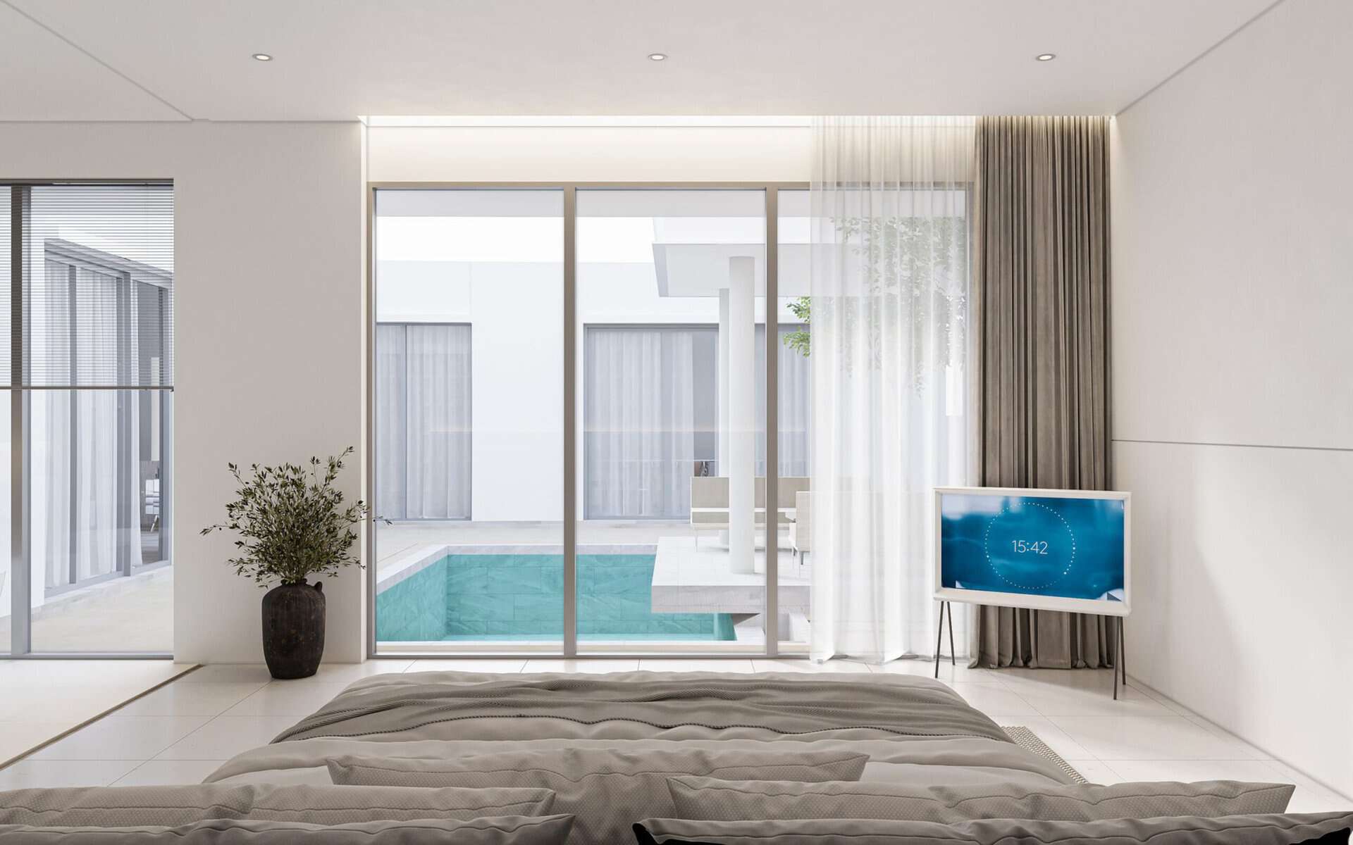 A staircase by the pool terrace ascends to the upper level, which houses the second guest bedroom eqquipped by a bathroom with its own separate bathtub and shower. This bedroom also opens onto a private balcony that overlooks the pool area below.