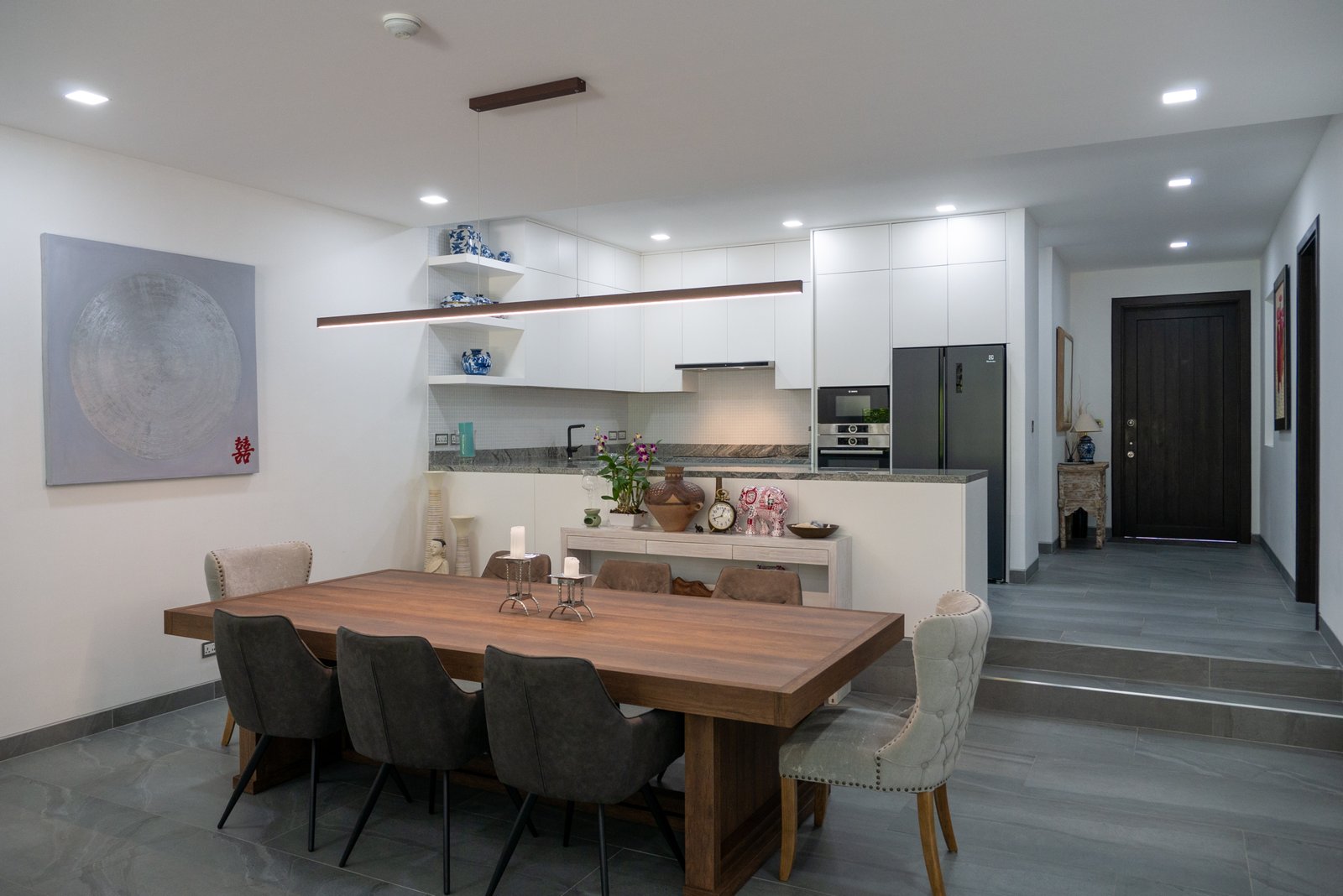Open-Plan Living Area: A spacious split-level design combining kitchen, dining, and living areas, offering a sense of openness and flow, perfect for entertaining or relaxing.