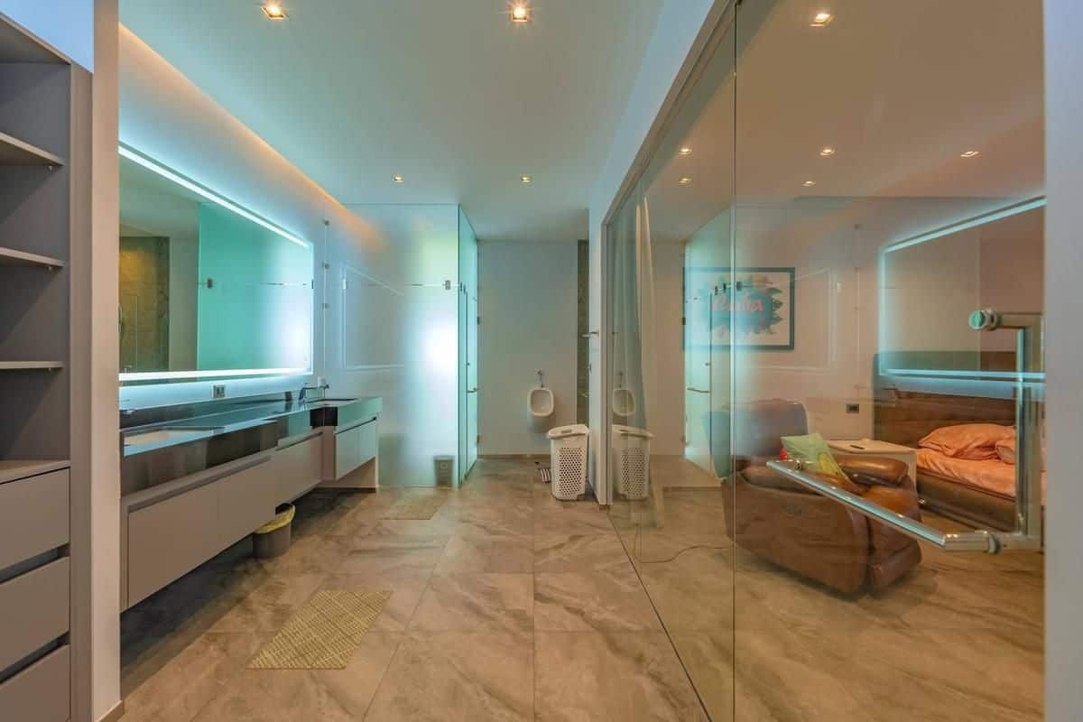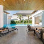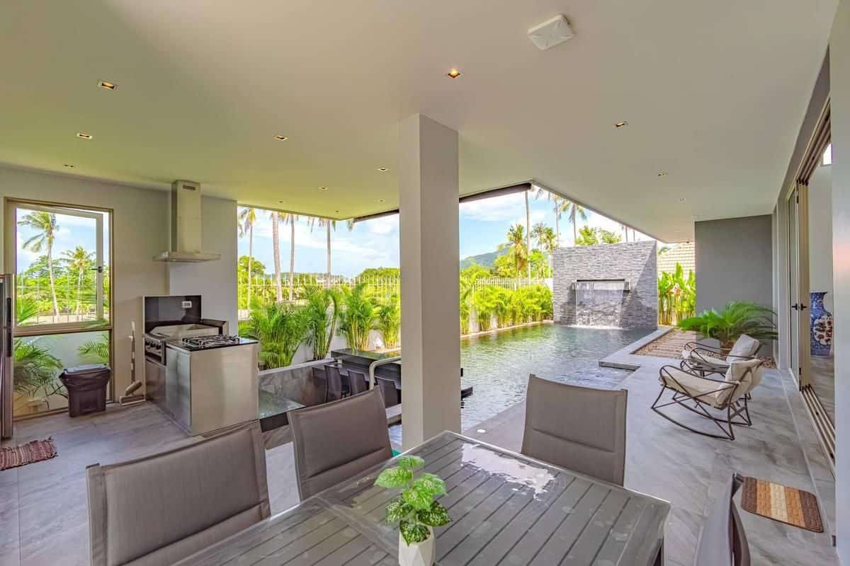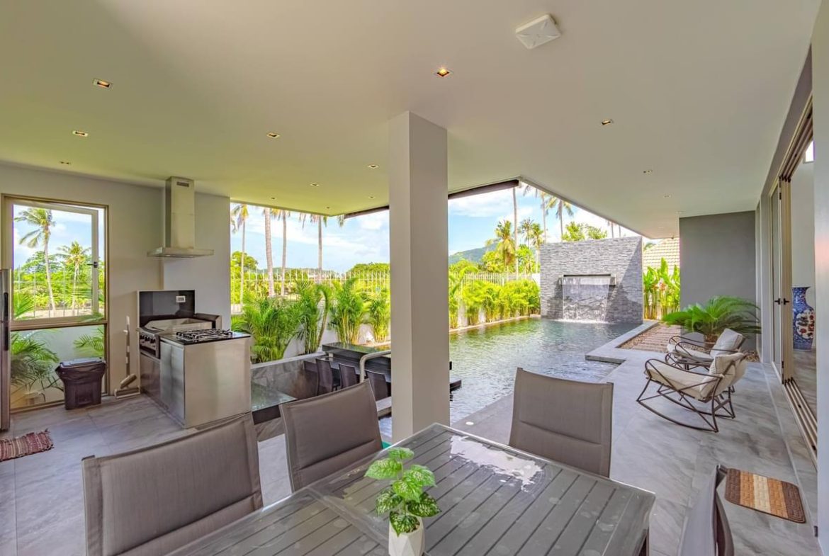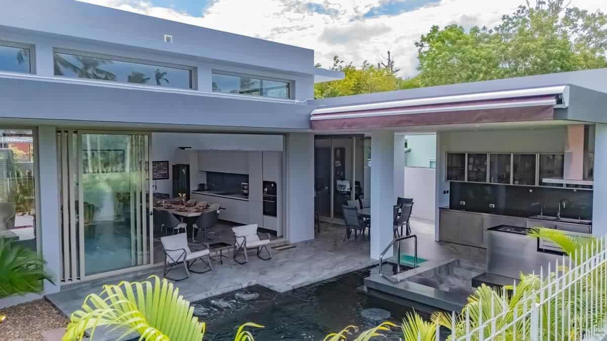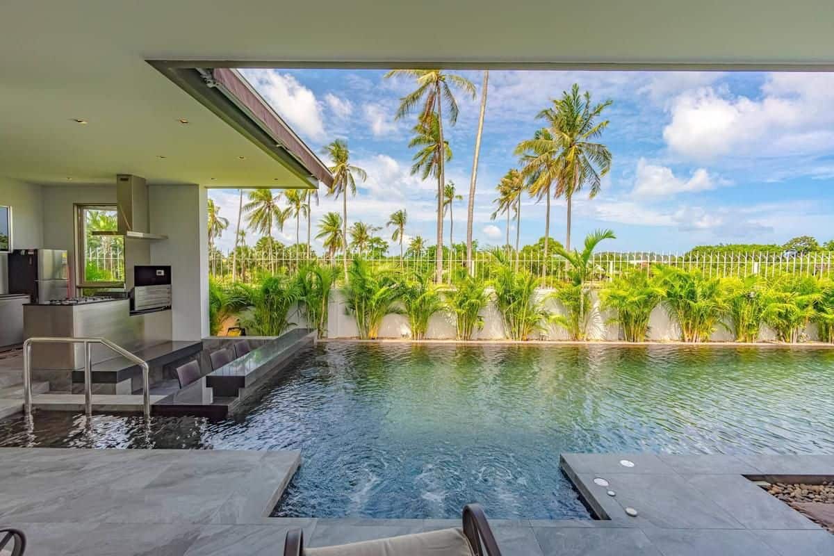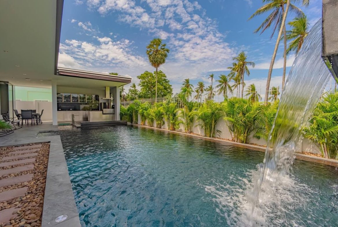 Entertaining is a joy with a sunken pool bar, built-in jacuzzi, and a professional-grade stainless steel outdoor kitchen, complete with a commercial-grade griddle. The villa’s outdoor space is designed for low maintenance yet high impact, featuring a stone waterfall and an endless pool design.