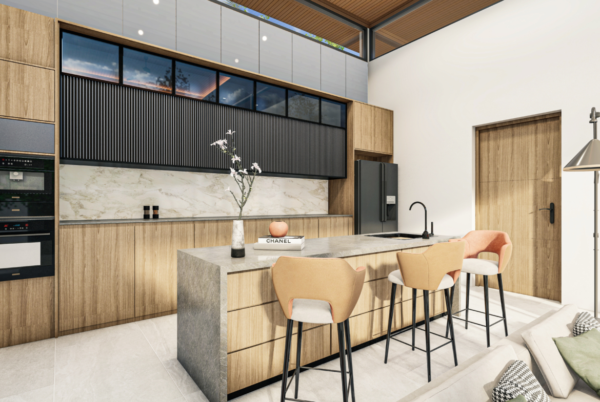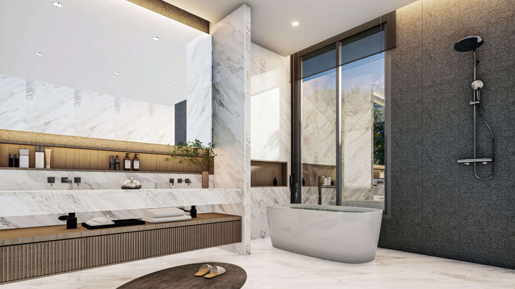 Our single-story villas are designed in a functional L-shape, seamlessly integrating with private swimming pools to create an oasis of relaxation. Each villa boasts 4-5 spacious bedrooms, all with ensuite bathrooms, ensuring maximum privacy and comfort. The master suite stands out with its expansive layout, featuring both a separate bathtub and shower, along with direct access to the pool terrace—ideal for morning swims or evening dips.