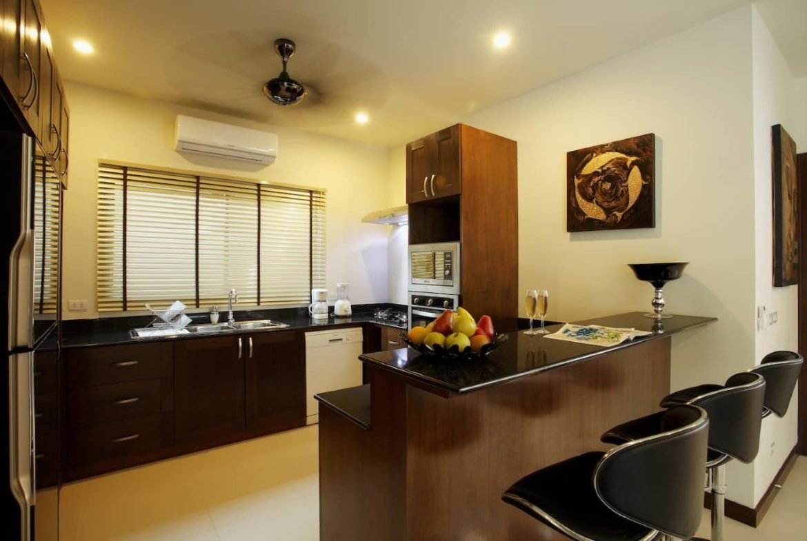 Sliding double doors take you directly onto the sun deck and into the private swimming pool. Bedroom 2 also has a king-size bed and a single bed, while bedroom 3 has 3 single beds and bedroom 4 has a king bed. All bedrooms have built-in wardrobes, and bedrooms 2 and 3 open up onto the sun deck through sliding doors. Bedrooms 2 and 3 share a spacious family bathroom with a large walk-in shower, while bedroom 4 has its own en-suite bathroom. In the large living room, with ample seating on a huge leather sofa, you can relax and watch the 50″ flat screen television with DVD player and cable TV. Alternatively, you can dine at the 8-seater dining room table. The open- plan, fully fitted Western-style kitchen with breakfast bar is fully equipped to meet your every need.