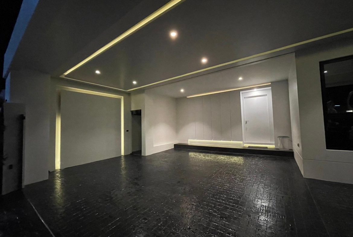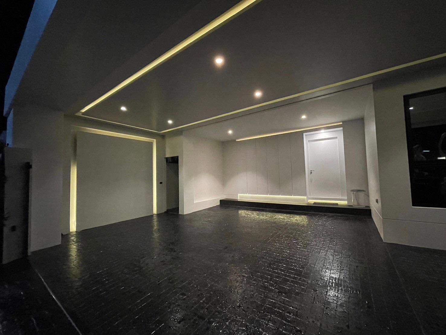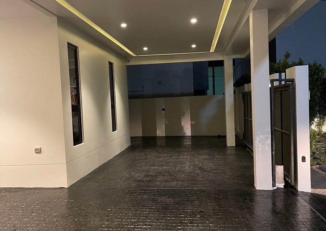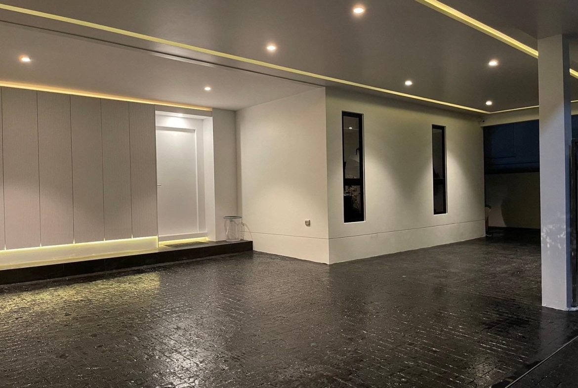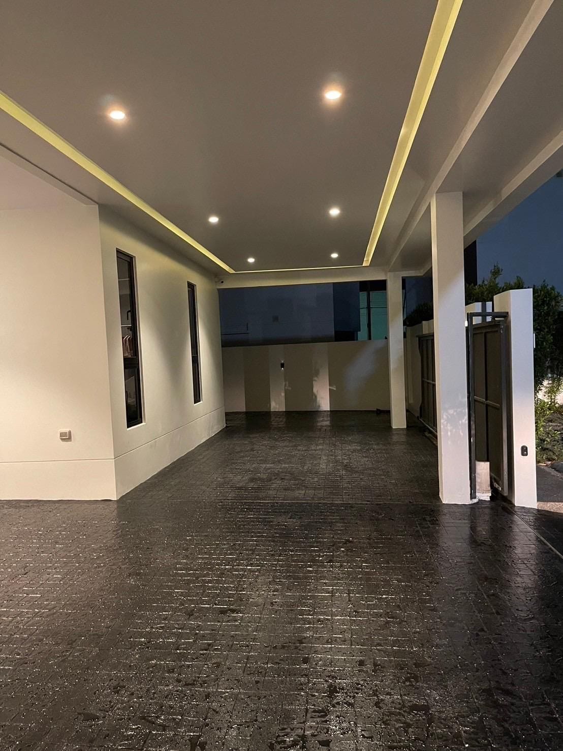 Unique touches include a dressing table with a mirror that lights up and plays music, adding a touch of luxury. The property also offers practical features like a garage with a roof, additional space at the back of the house, and a stamped floor in the garage area.