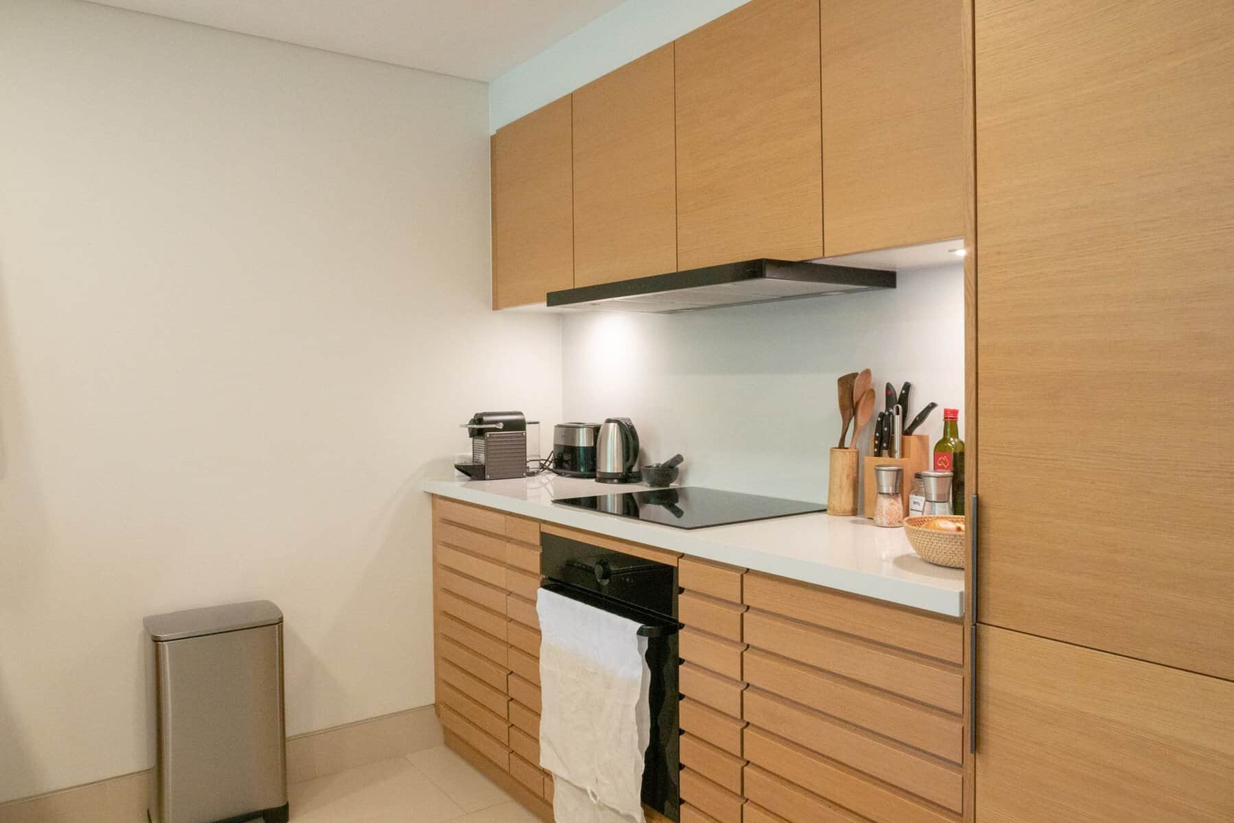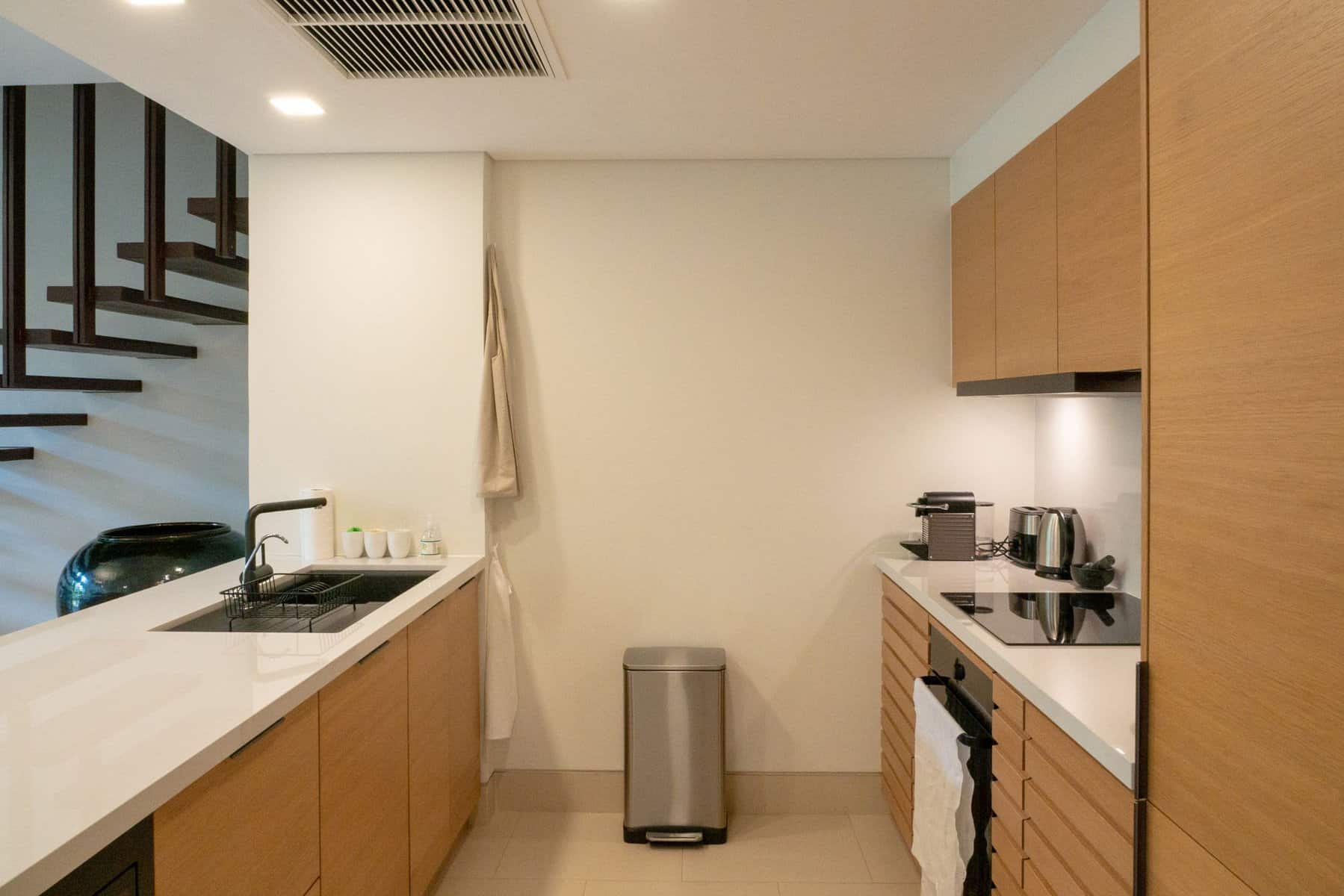 Infinity Blue’s living area is an inviting place to gather, with floor-to-ceiling glass doors that open to the terrace and pool. This air-conditioned space has a calming ambiance with grey sofas and chairs in soft fabrics arranged to face the large flat-screen TV. Satellite and internet cable service, a DVD player and Bluetooth speaker make it easy to set the mood with movies or music. The living area can be completely opened up at the front to connect it to the terrace and the cooling sea breezes. Just behind is a dining room with sea views and a table for four. The adjacent kitchen is well-equipped with modern appliances and plenty of workspace on the black granite counters.